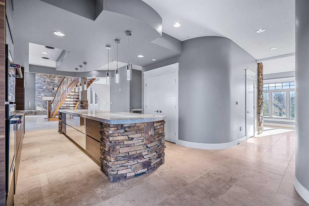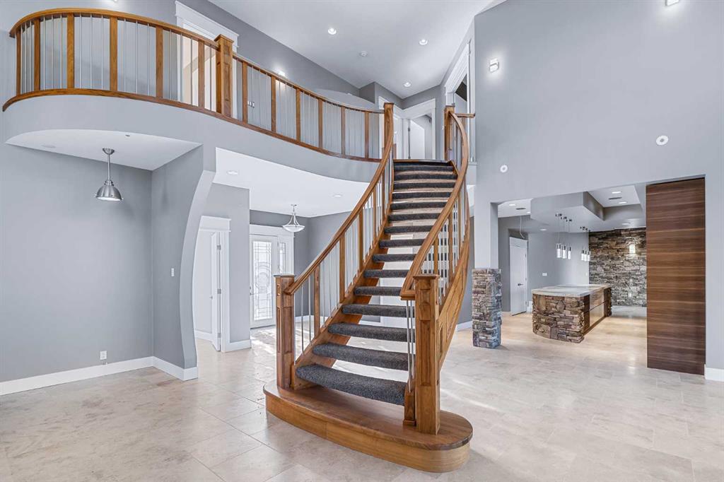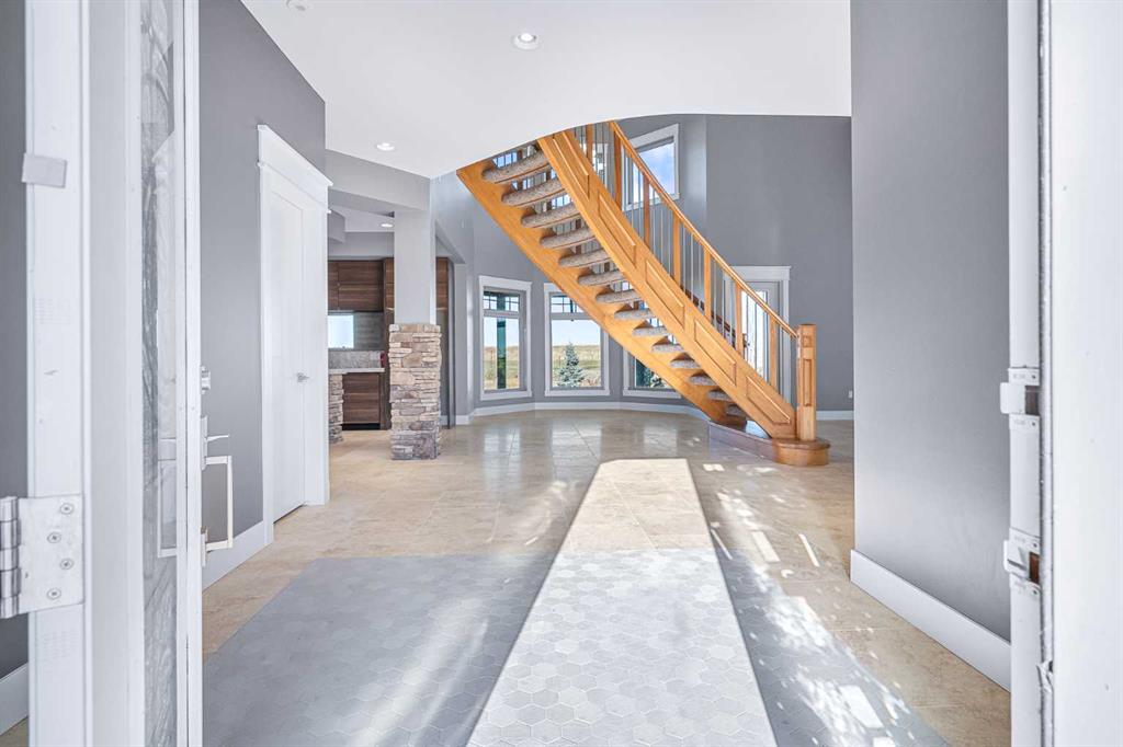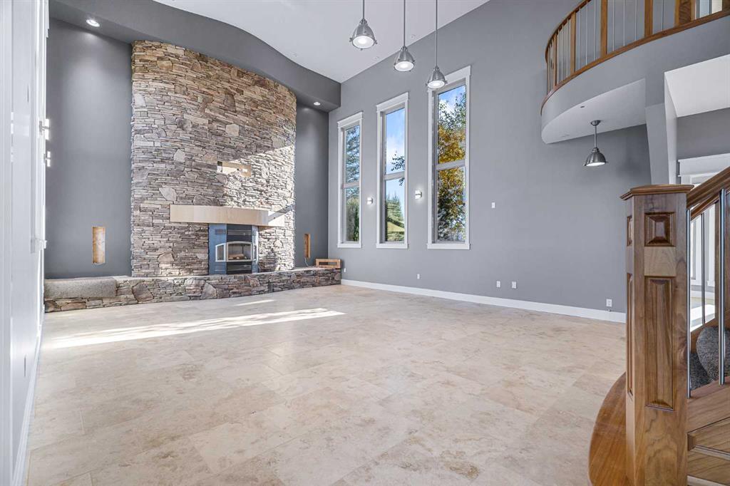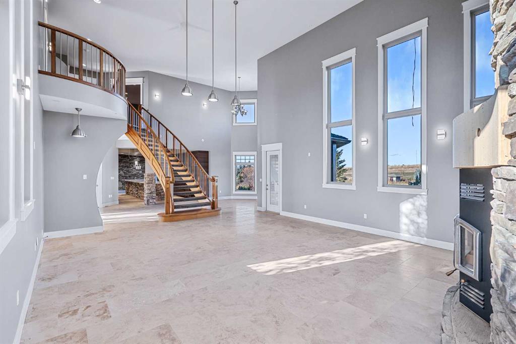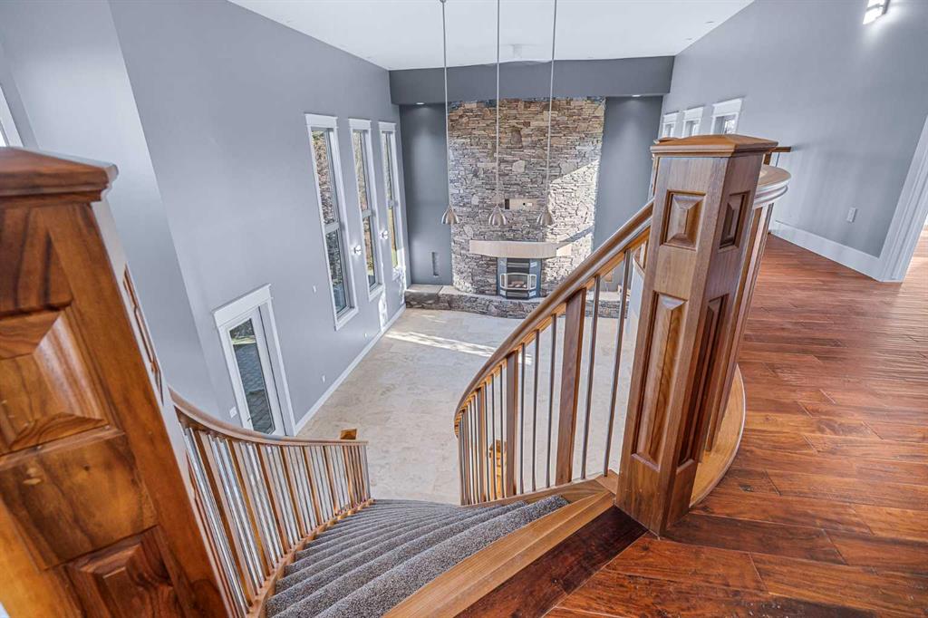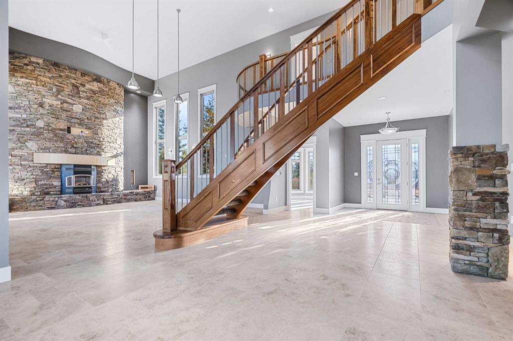 Welcome to a hidden gem that’s as expansive as it is enchanting—a rare rural retreat that invites you to live in harmony with nature. With an idyllic private lagoon, and professionally landscaped including underground sprinklers, this property is a sanctuary of both luxury and rustic charm. Perfect for the discerning buyer who values space, privacy, and an unmatched lifestyle, this estate offers a wealth of features, from expansive shops to state-of-the-art living quarters and storage facilities, all set within an unforgettable landscape. At the heart of this retreat stands a striking, 3,955 sq ft home, inviting you in through grand double doors. Step into the breathtaking two-story living room, where a majestic wood-burning fireplace with floor-to-ceiling stonework anchors the space. Natural light floods through oversized windows that frame views of the peaceful landscape, creating a seamless blend of the indoors and out. Imagine cozy evenings by the fire, with the warmth of crackling wood and the soft glow from stone surfaces illuminating the room, the main floor also has in floor heat for maximum warmth in those cold winter months. Flowing naturally from the living area is a modern yet inviting kitchen, designed to be both functional and stunning. A sleek 18-foot quartz island, encased in stone, stretches across the room—perfect for casual breakfasts, social gatherings, or simply savoring a quiet cup of coffee. The kitchen features top-of-the-line appliances, including a wall oven and countertop cooktop, catering to all your culinary needs. Adjacent to the kitchen, an intimate dining area captures 360-degree views of the surrounding property, transforming each meal into a memorable experience. Also on the main level, you’ll find a private office, ideal for working remotely, as well as a powder room, bedroom and a well-equipped mechanical room to meet your practical needs.The grand staircase, a centerpiece in its own right, sweeps you to the second floor, where tranquil spaces await. The primary suite is a true retreat, featuring a two-way fireplace that creates ambiance between the bedroom and the luxurious ensuite. Indulge in the freestanding tub, unwind in the spacious, tiled shower, or prepare for the day at the large vanity. A walk-in closet completes this space, offering generous room for a curated wardrobe. Down the hall, two additional bedrooms share a well-appointed bathroom, providing comfort and privacy for family or guests. For added convenience, the laundry room is located upstairs, ensuring day-to-day chores are effortless. The remainder of the property includes 2 large shops, equipped with living quarters suitable for guests, dedicated gym area and lots of versatile space. There are also 2 additional spaces for storage. This estate offers something for every lifestyle. It’s more than just a place to; it’s an experience.