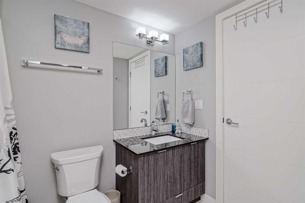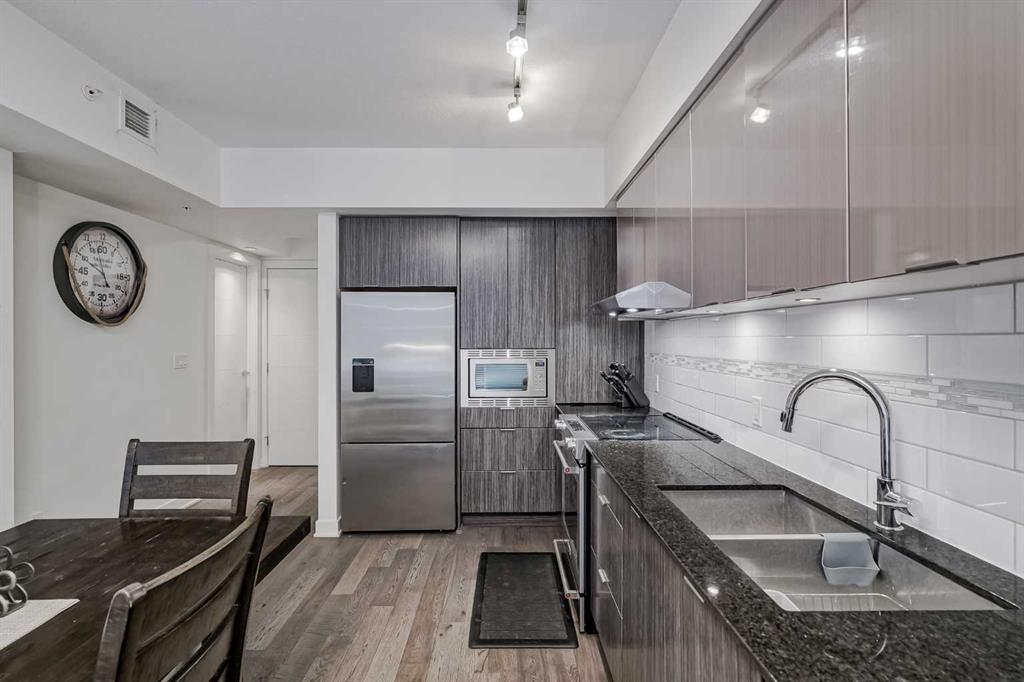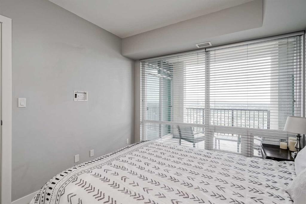 Welcome to this stunning, 1 bedroom, 1 bathroom home on the 33rd floor of one of Calgary's most sought after buildings, Vogue! If you have ever wondered what the downtown skyline and Bow River look like from 33 stories above the ground, this is the unit for you! As you walk in you are greeted with gorgeous dark wood floors, starting with a flex area that is great for an office space or additional storage. The open floor plan features a large kitchen with quartz counter tops, stainless steel appliances, a ton of cabinets and drawers and allows for an eat in kitchen experience. The dining area flows into your living room with floor to ceiling windows giving you UNOBSTRUCTED VIEWS OF THE BOW RIVER as well as MOUNTAIN VIEWS from the balcony. The balcony is a good size and offers great outdoor space. The bedroom is large enough for all of your bedroom furniture and features a walk through closet with in unit laundry and direct access to your full bathroom. The Drake is truly one of Calgary's gems of a building giving luxury hotel vibes, bicycle storage, fitness centre, recreation room, roof deck, and secured parking. This unit has a titled underground parking stall and assigned storage locker. This building is in a great location with being steps from the riverwalk, shops, cafe's, restaurants, parks, pathways and transit. Do not miss out on this opportunity to own one of the highest units with river views in the entire city.