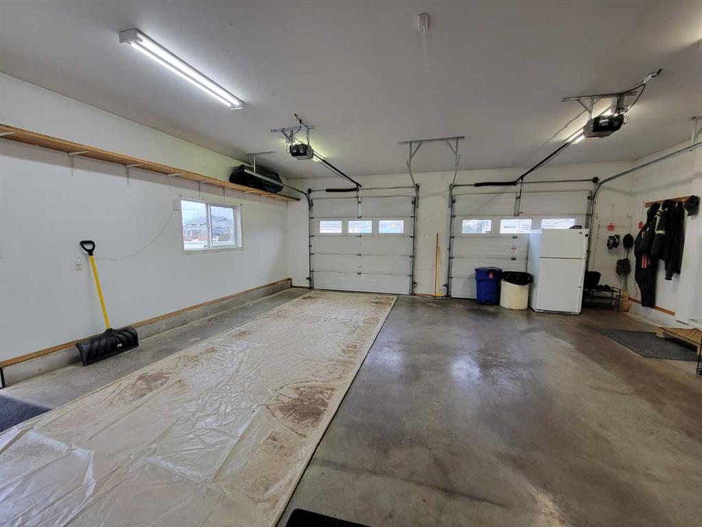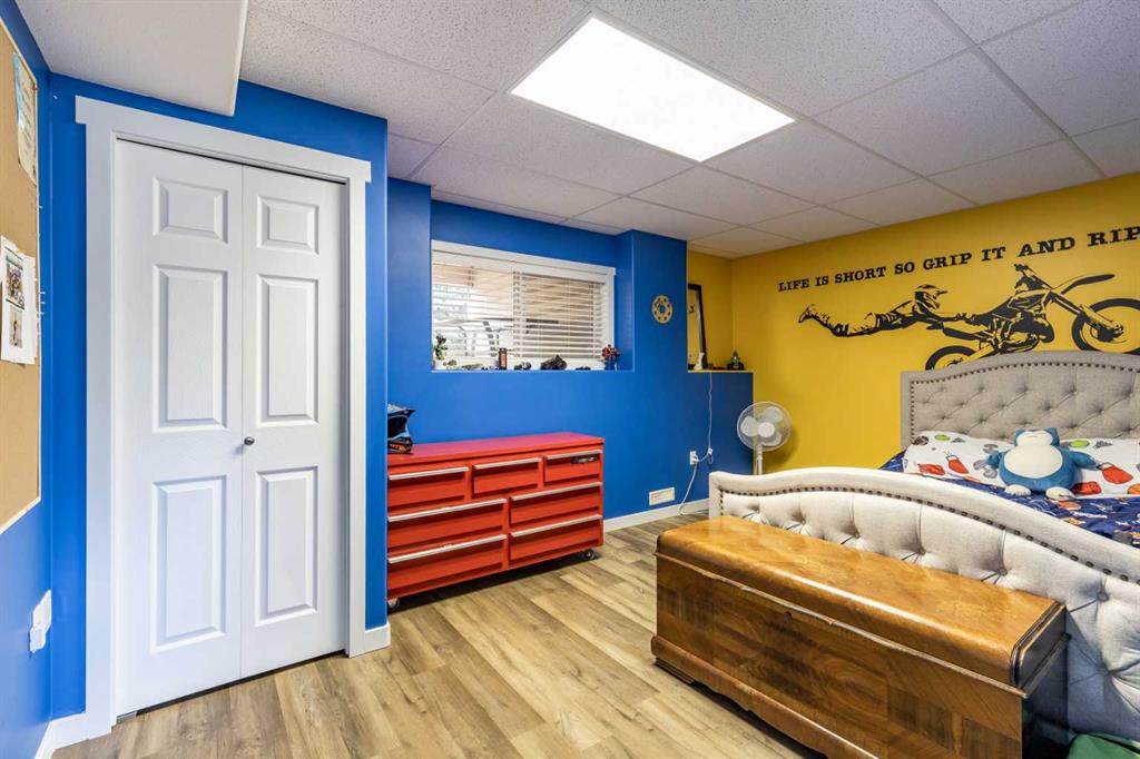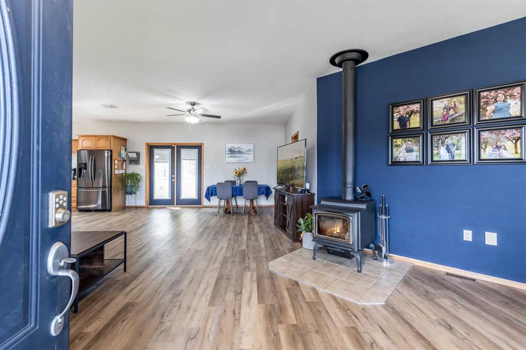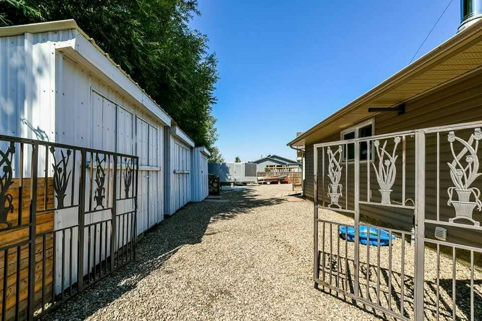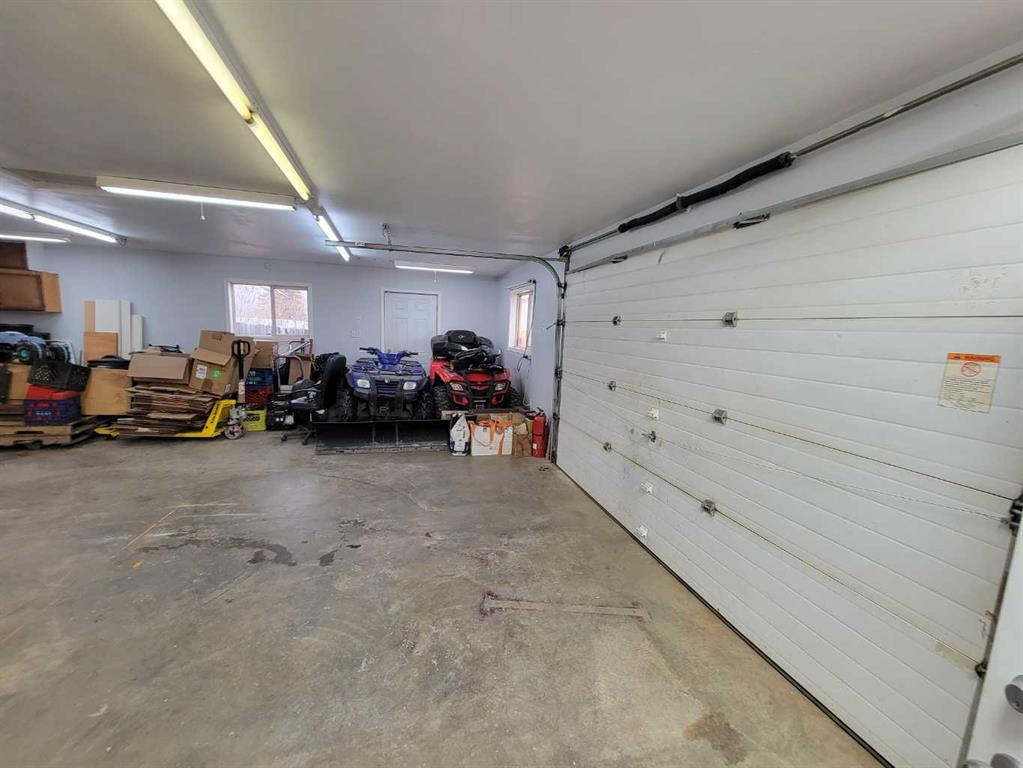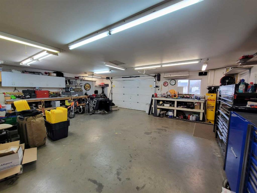 This stunning 1,795 SqFt bungalow offers an abundance of space, comfort, and incredible functionality - both inside and out. Situated on a spacious .53-acre lot, the property is a dream for hobbyists or anyone needing serious storage, featuring not one, not two, but three heated garages. The attached garage measures 23'8" x 25'6" with 10' ceilings, a radiant heater, and a large storage room, while the two detached garages (24'9" x 27'4" and 26'11" x 24'10") both offer 220V power, 8' ceilings, gas heaters, and wood stoves. Inside, the main floor boasts 10' ceilings, an open-concept living area filled with natural light, and updated vinyl plank flooring throughout. The kitchen, dining, and living room flow seamlessly together, centered around a cozy wood-burning fireplace. The spacious primary suite features a luxurious 5-piece ensuite with a clawfoot tub, walk-in shower with body sprays, and generous closet space. A second bedroom, 4-piece bath, and insulated sunroom with heat exchange and air conditioning complete the main level. Downstairs offers even more living space with a family room, laundry area, 3-piece bath, and three additional bedrooms—one of which is fully soundproofed and ideal for a theater room. Outside, you’ll also find RV parking, five storage sheds, garden boxes, and a patio area. A solid, well-cared-for property, this home truly needs to be seen to be appreciated.