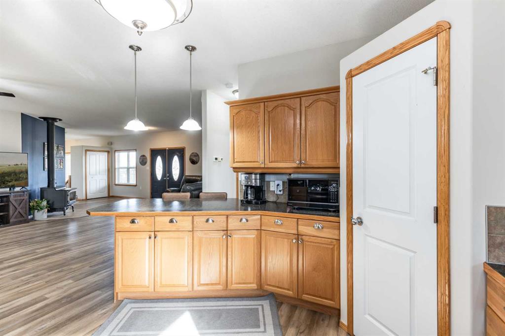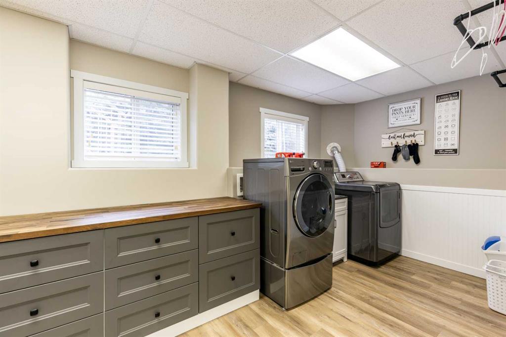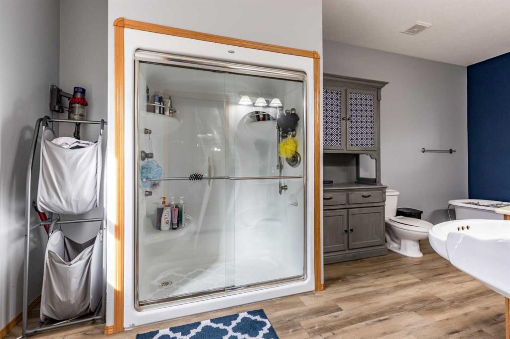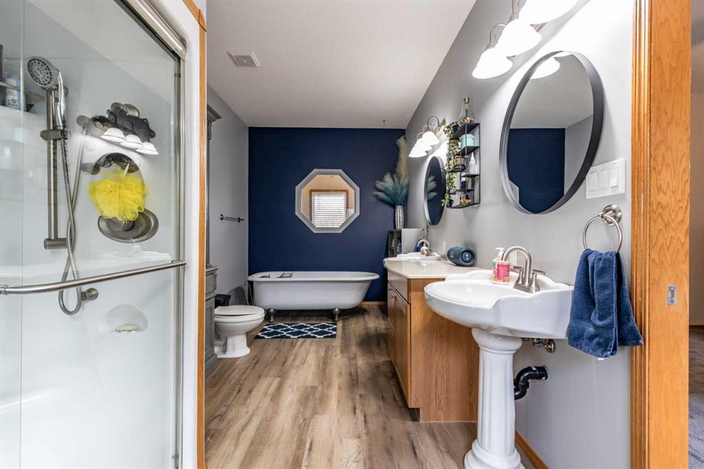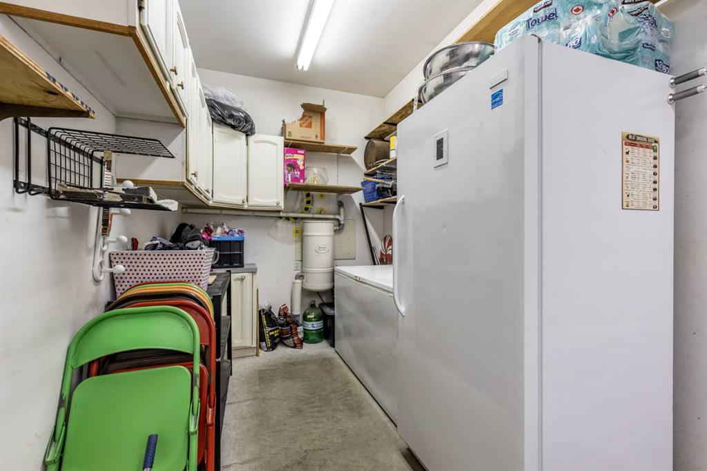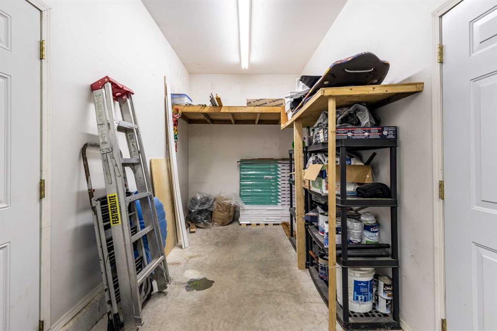 This stunning 1,795 SqFt bungalow offers an abundance of space, comfort, and incredible functionality - both inside and out. Situated on a spacious .53-acre lot, the property is a dream for hobbyists or anyone needing serious storage, featuring not one, not two, but three heated garages. The attached garage measures 23'8" x 25'6" with 10' ceilings, a radiant heater, and a large storage room, while the two detached garages (24'9" x 27'4" and 26'11" x 24'10") both offer 220V power, 8' ceilings, gas heaters, and wood stoves. Inside, the main floor boasts 10' ceilings, an open-concept living area filled with natural light, and updated vinyl plank flooring throughout. The kitchen, dining, and living room flow seamlessly together, centered around a cozy wood-burning fireplace. The spacious primary suite features a luxurious 5-piece ensuite with a clawfoot tub, walk-in shower with body sprays, and generous closet space. A second bedroom, 4-piece bath, and insulated sunroom with heat exchange and air conditioning complete the main level. Downstairs offers even more living space with a family room, laundry area, 3-piece bath, and three additional bedrooms—one of which is fully soundproofed and ideal for a theater room. Outside, you’ll also find RV parking, five storage sheds, garden boxes, and a patio area. A solid, well-cared-for property, this home truly needs to be seen to be appreciated.