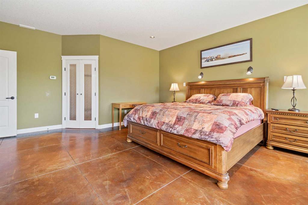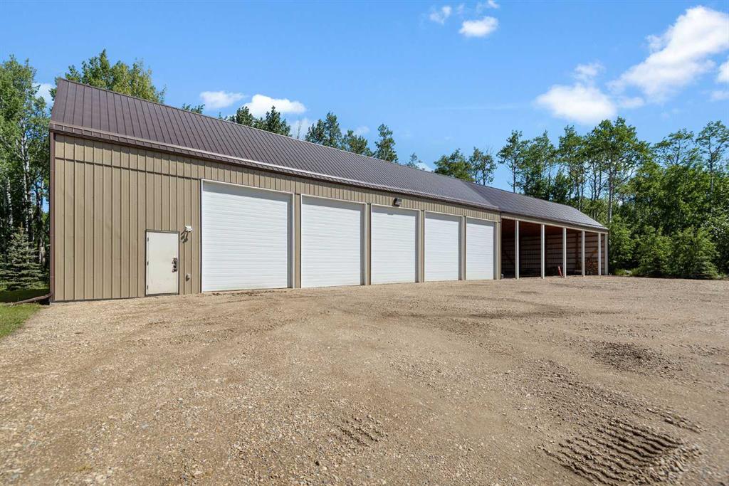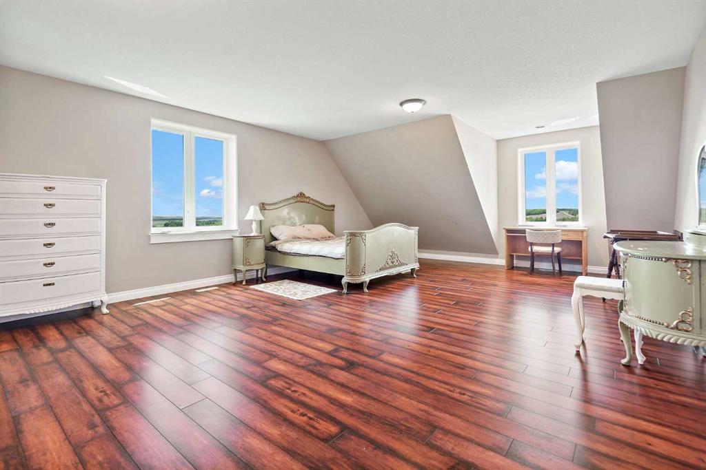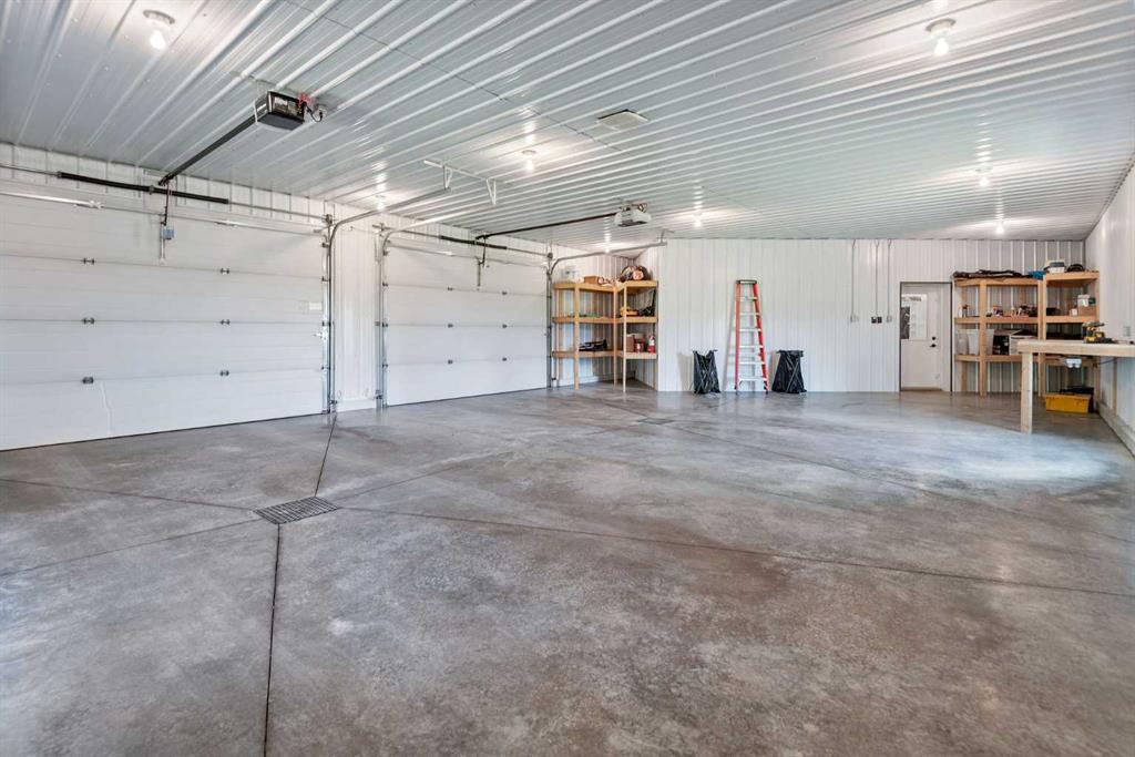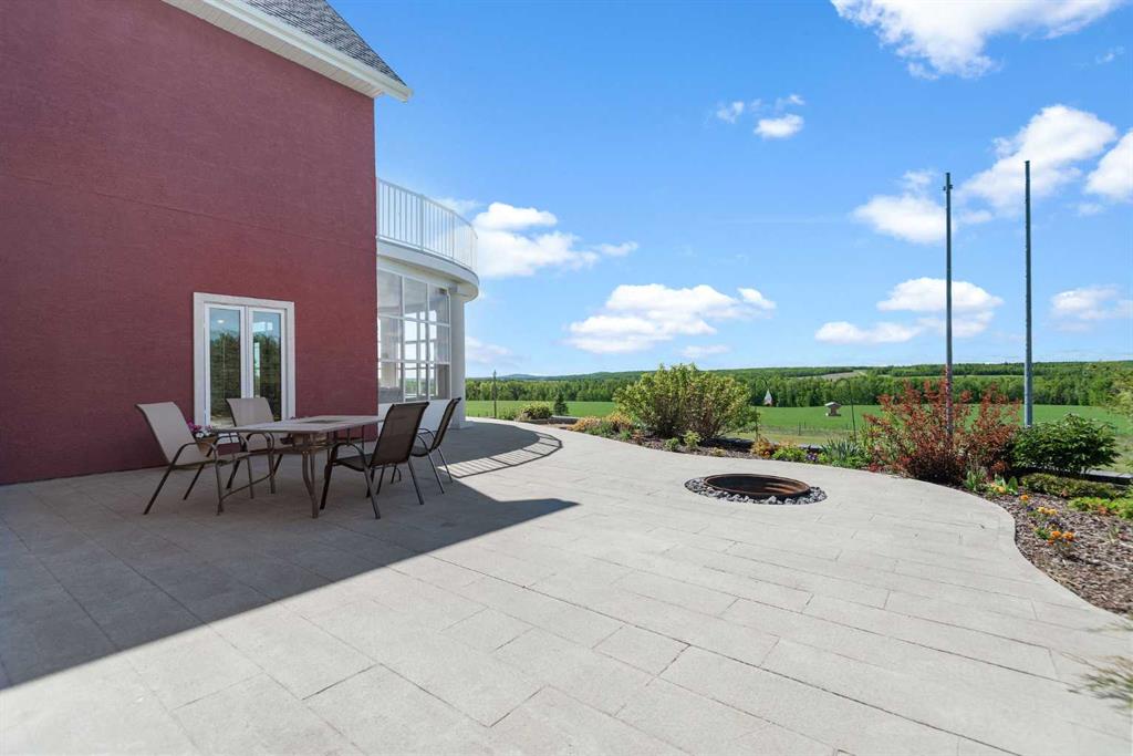 Executive 2 Storey Home with Quad Attached Garage & Huge Shop on 4.99 Acres! Impressive 5,000+ s.f. energy efficient 2 storey home built on a poured concrete slab with in-floor heating by on demand boiler, with 13" ICF walls throughout, triple glazed PVC windows and Acrylic Stucco Finish. Entering the grand foyer, a flood of natural light highlights the coloured concrete flooring, 10' ceilings, a chef's dream kitchen with upgraded cabinets, quartz countertops built in high-end appliances, new microwave, new taps, and a huge kitchen island. The kitchen overlooks the dining area and living room, with French doors to an enclosed patio area, great for entertaining and everyday living! Also located on the main floor a 2 piece bathroom, office, laundry room with sinks and plenty of cabinets, and the Primary bedroom comes with French doors to the patio, a 4 piece ensuite with dual sinks, 6'x6' steam tile shower and a huge walk-in closet. A grand wooden staircase featuring wood and metal railings and a vaulted ceiling leads to the upper level, where you will find 2 more huge bedrooms with dormer windows (which could easily be converted to 4 large bedrooms), 3 piece bathroom with a beautifully tiled shower, and a huge family room with stand alone gas stove, and access to the upper balcony where you can see for miles and miles! Additional features to this amazing home include sound & security system throughout, new central vacuum, and all doors are a minimum 3' wide and halls are minimum 4' wide. The first attached garage was built in 2012, comes with in slab heat, separate storage room, and overhead doors c/w openers. The second attached garage was built in 2015, and comes with an overhead forced air heater, and overhead doors c/w openers. If you like some shade with your sunshine, look no further, as the partial wrap-around concrete deck provides plenty of options, an enclosed sunroom, decorative pillars, built-in fire-pit, concrete block retaining walls, along with the roof top sundeck, all of which feature panoramic views. The landscaping includes many perennials, trees, shrubs, raspberry and saskatoon bushes, and a bountiful garden. This property also comes with a pumphouse, hen house, and underground power with a Natural Gas Generator that kicks on as soon as the power goes out. There's no shortage of places to park equipment on this property, as this property features a Huge Shop (42'x72' enclosed) with 16' ceiling, 5 overhead doors (14'x12'), forced air furnace, hot water tank, 220 wiring and gravel floor. The open machine area provides an additional 42'x80', all of which has a gabled roof, finished with metal and coloured clad exterior. Lots to take in with this Amazing property!