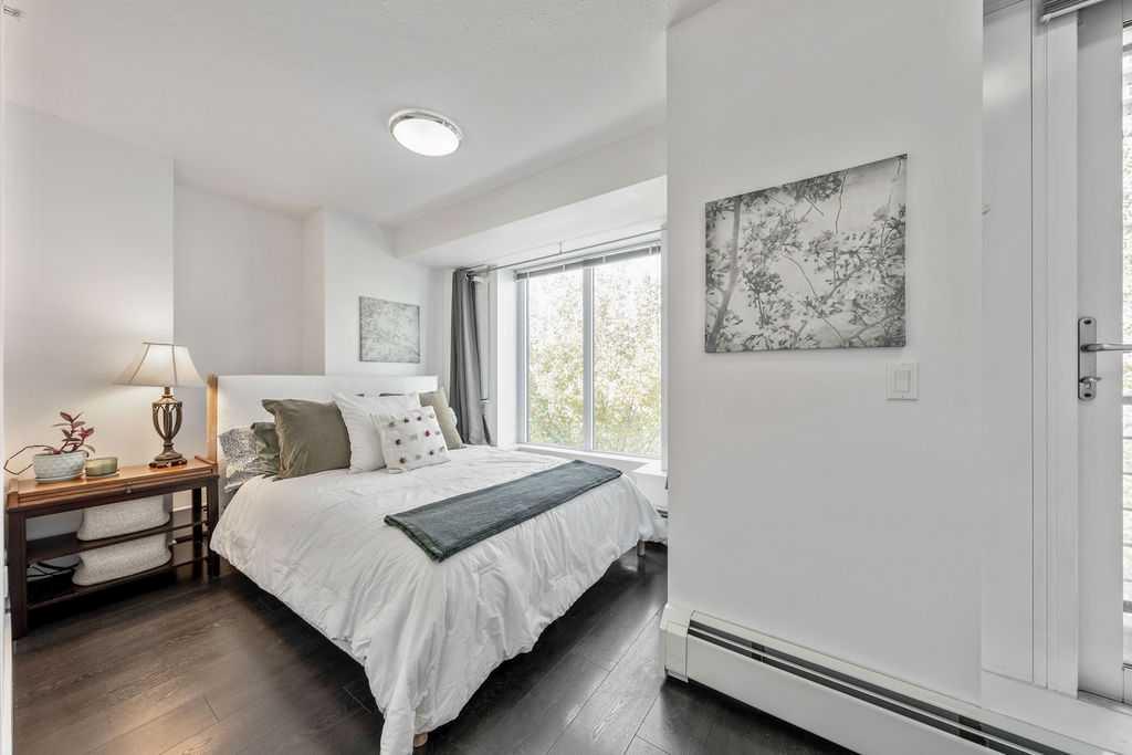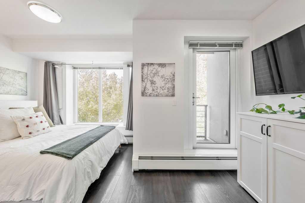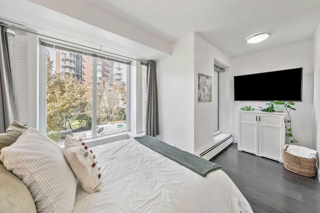 Welcome to one of the most desirable addresses in Calgary’s Beltline—an unbeatable location offering urban energy and modern comfort in perfect harmony. Just steps from the lively pulse of 17th Avenue and the boutique charm of Mount Royal Village, this pristine two-story townhome is designed to impress from the moment you arrive. Tucked within the highly sought-after DRAKE building, this residence enjoys the rare convenience of a private street-level entrance paired with two sun-filled southwest-facing balconies—ideal for unwinding with an evening cocktail or morning coffee from nearby Analog Coffee on 7th Street. Step inside and experience a bright, spacious open layout framed by dramatic floor-to-ceiling windows that flood the home with natural light. Towering 10–11 ft ceilings create a sense of openness and sophistication, while contemporary design details bring warmth and style throughout. The modern kitchen is a true centerpiece, boasting stainless steel appliances, sleek full-height cabinetry, an oversized island with seating for four, and an eye-catching blend of vertically stacked light tile backsplash against rich dark quartz countertops. Wide-plank flooring, crisp white walls, refined finishes, and a convenient powder room complete the main level. Upstairs, you’ll find private access to the interior hallway of the building and a nearby dedicated storage space. The upper level features two inviting bedrooms, each with its own en-suite—one a sleek 3-piece and the other a lavish 5-piece retreat. Both rooms enjoy generous south and west-facing windows, with the primary suite offering a private balcony that captures the sunshine perfectly. A discreet laundry area adds convenience to daily living. This townhome is a showpiece—immaculately maintained and thoughtfully designed for comfort, style, and effortless downtown living. With titled underground parking and proximity to everything that defines Calgary’s Beltline lifestyle—cafés, shops, parks, restaurants, and nightlife—this home scores a perfect 10/10 for location and livability. Opportunities like this don’t come often. Reach out to your favorite real estate professional today to arrange a private showing and experience this exceptional property firsthand.