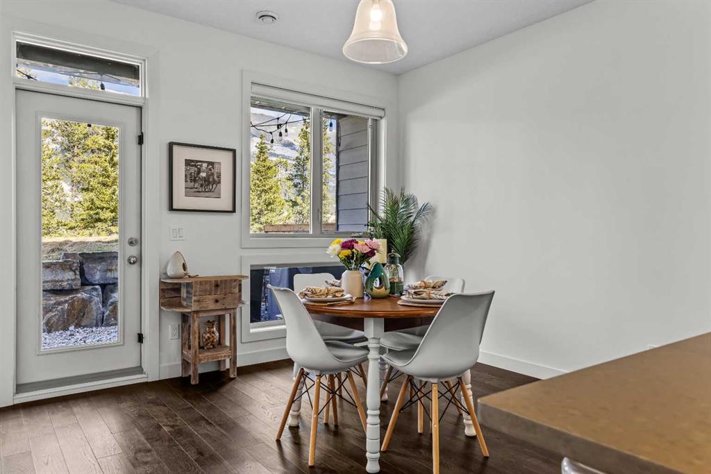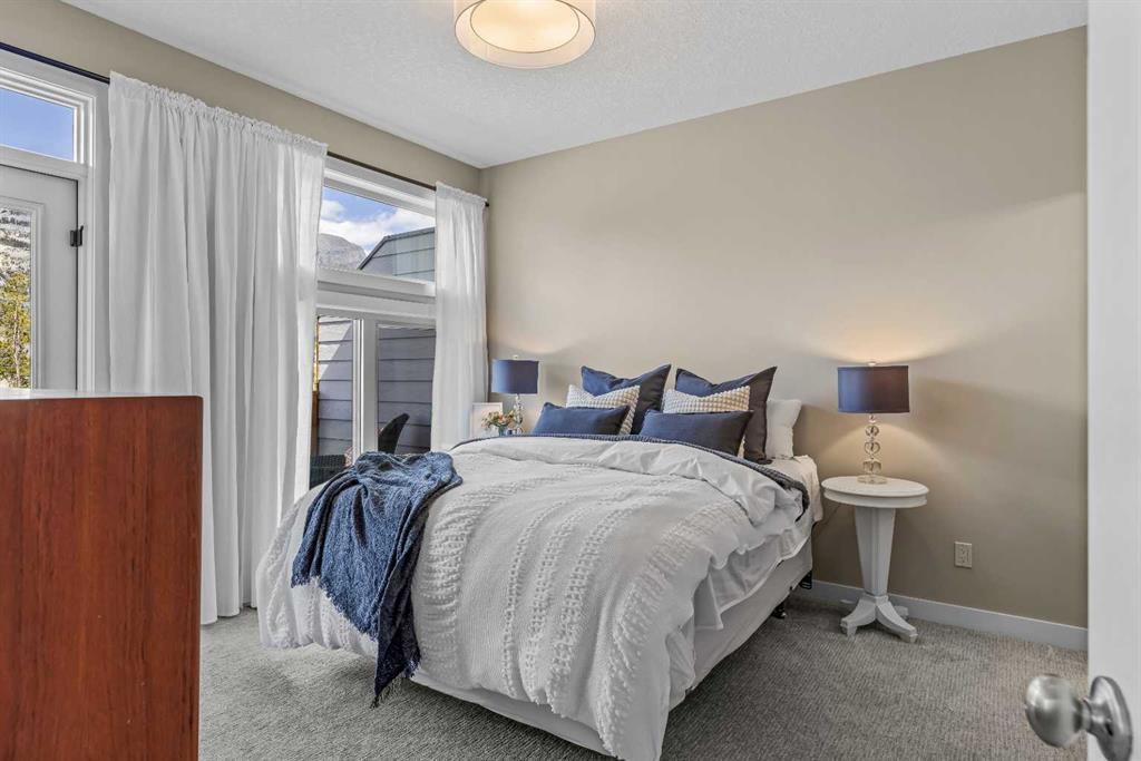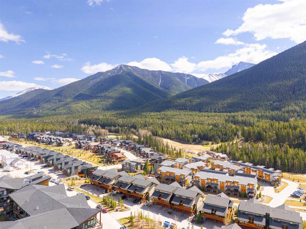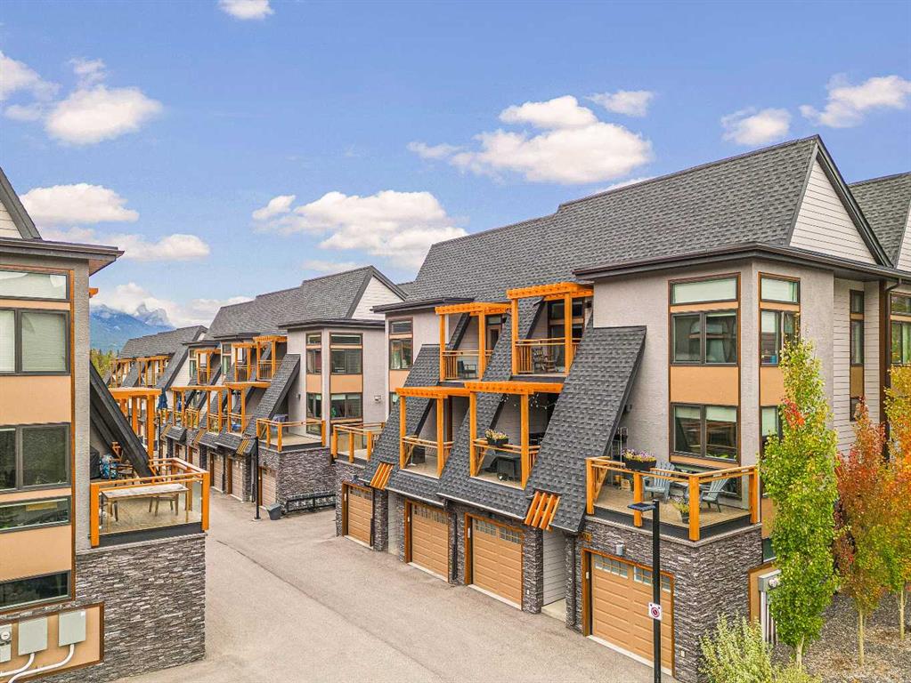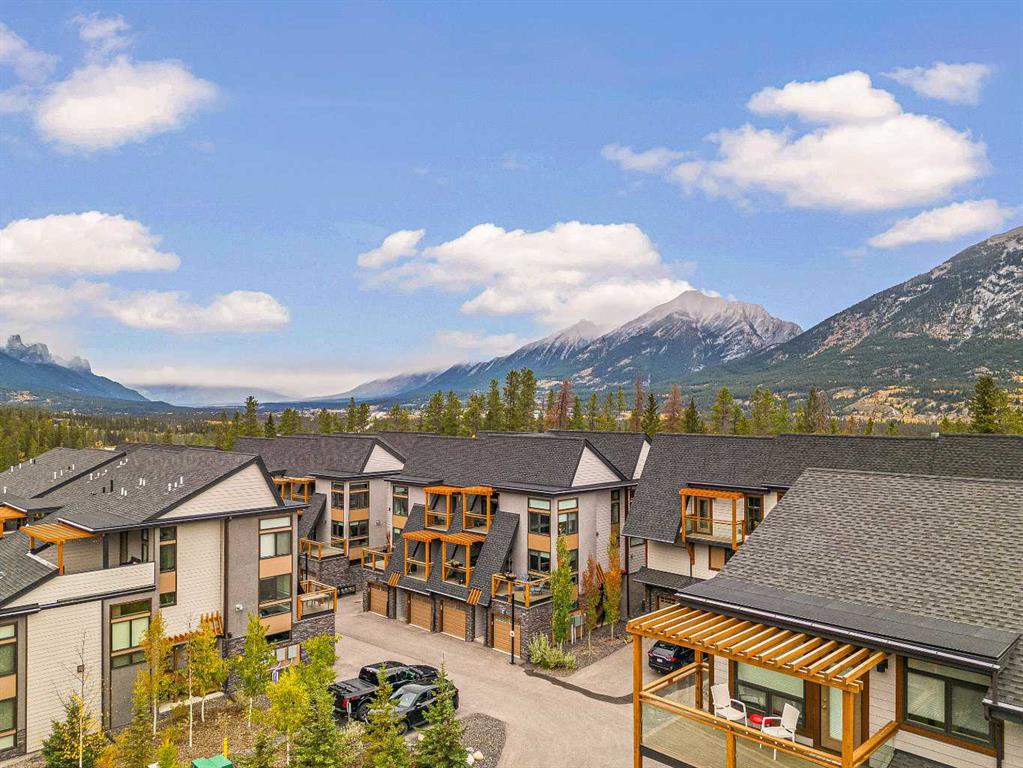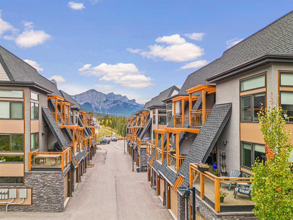 Welcome to this exclusive end-unit townhome nestled within the prestigious Three Sisters Mountain Village — a serene retreat that balances upscale design with a warm, inviting comfort. Boasting over 1,100 square feet of thoughtfully designed living space, this home delivers an effortless blend of natural beauty and modern luxury. Step inside to discover two private bedrooms, each enhanced with its own spa-like ensuite. The primary corner suite is a true sanctuary: expansive, floor-to-ceiling windows frame breathtaking mountain vistas, while a sophisticated 3-piece ensuite and a generous walk-in closet elevate the experience. The second bedroom offers its own private patio overlooking a lush, forested setting and sweeping mountain views—a peaceful escape enhanced by a stylish 4-piece ensuite and ample storage in its walk-in closet. The heart of this home is the open-concept kitchen and living area, where upgraded stainless steel appliances and elegant quartz countertops set the stage for culinary adventures and memorable gatherings. The kitchen seamlessly integrates with the living space, enhanced by hardwood flooring throughout the main floor and the warmth of a tile-surrounded fireplace that invites cozy evenings by the glow of dancing flames. A unique feature of this townhome is its dual outdoor retreats. The sunken patio off the dining area overlooks a quiet green space, presenting a perfect setting for alfresco dining or unwinding with incredible mountain views. A second private patio off the second bedroom provides an inviting space to savour the fresh mountain air and watch nature’s colours shift throughout the day. Additional amenities include a convenient laundry space with stacked washer and dryer, a single- car garage, and access to a community rich in pathways, hiking trails, and parks. Positioned close to world-class golf courses, ski hills, local schools, and the soon-to-be-open Gateway shopping district, this home offers not only luxurious living but also an enviable location that caters to an active, yet relaxed lifestyle. Discover a home that embodies both upscale elegance and serene comfort—a perfect haven for those who value quality, style, and a connection to nature.