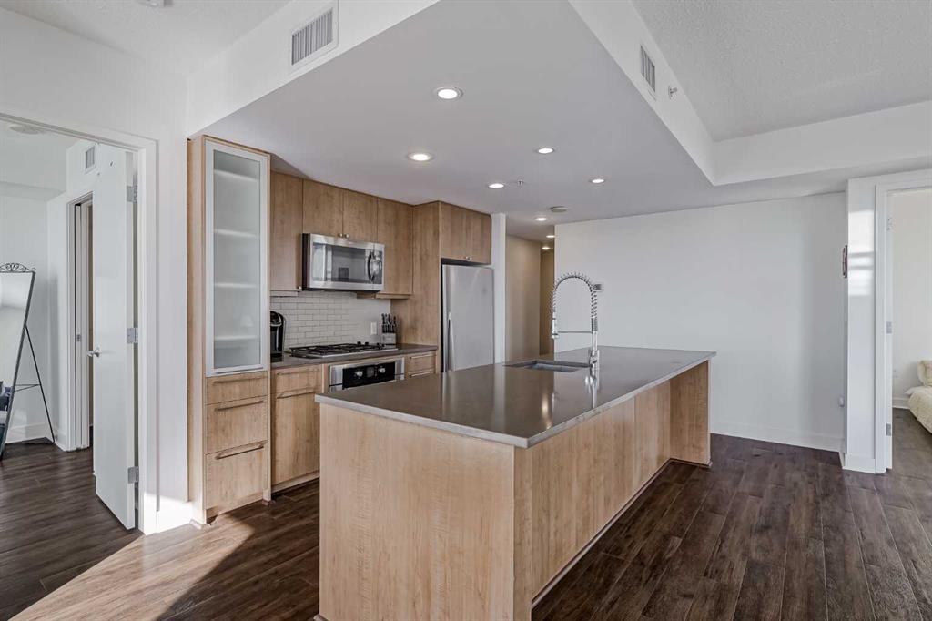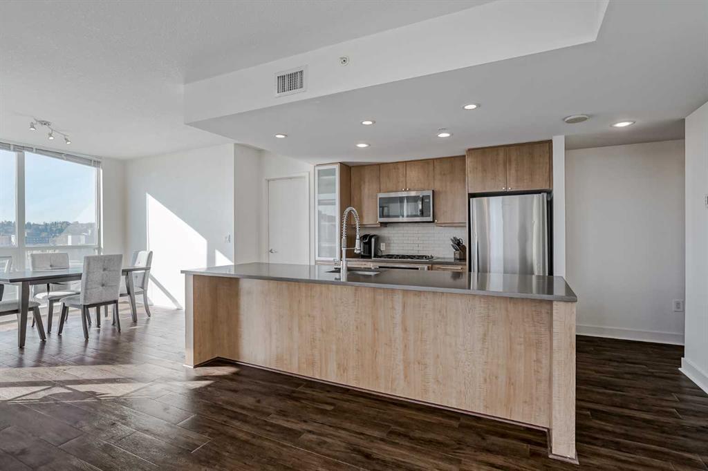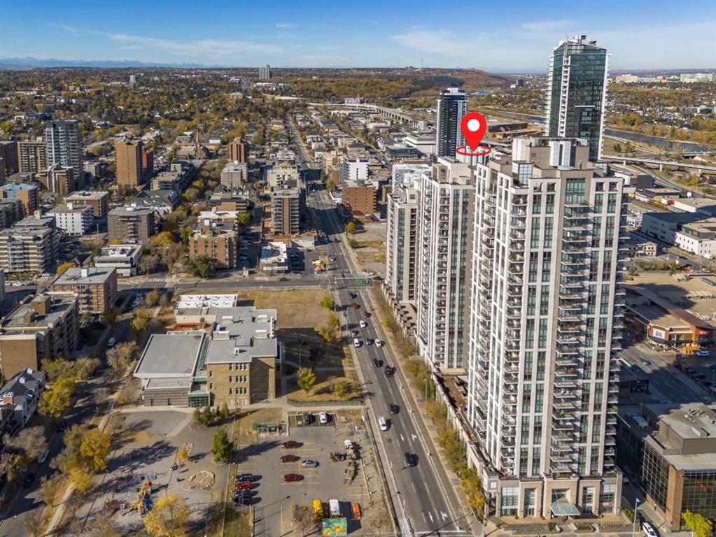 Experience sophisticated, high-rise living in this bright and expansive 2-bedroom plus den corner unit, perfectly situated in the highly sought-after NOVA building. This stylish and contemporary condo features an open-concept design accentuated by extensive, floor-to-ceiling windows that flood the space with natural light and offer outstanding expansive city and mountain views. Enjoy your morning coffee or wind down in the evening on the large, southeast-facing corner balcony. The gourmet kitchen is a chef's delight, boasting sleek quartz countertops, a Bosch gas stove, a Fisher & Paykel refrigerator, and under-cabinet lighting. The south-facing Primary Bedroom serves as a private retreat, complete with a walk-through closet and a luxurious five-piece ensuite bathroom. The second full bathroom features a walk-in shower and is conveniently designed to function as a second ensuite, offering maximum functionality. This prime property includes a titled underground parking stall within the secure parkade, which also provides ample visitor parking. NOVA provides exceptional building amenities, including a stylish lounge, a fully equipped gym, a rentable guest suite, beautiful outdoor gardens, and the luxury of a full-time concierge. With a quick walk to the downtown Co-op, shops, services, and diverse restaurants, this is an incredible opportunity to embrace convenient downtown living. Don't miss out—schedule your viewing today!