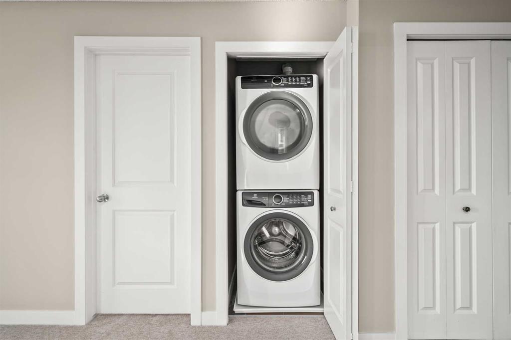 Attention first-time home buyers, down-sizers and investors! This 761 sq ft, 2 BEDROOM, 2 BATH, CORNER UNIT CONDO is AFFORDABLE AND MOVE-IN READY with FRESH PAINT AND BRAND NEW CARPET. Upon entering, you are greeted by an open-concept design. To the right, is a flex space that could be used as a dining area, an office or for your favorite hobby. A front closet, a 4 piece bathroom and in-suite laundry complete this corner of the condo. To the left, the kitchen offers modern cabinetry, granite counter tops, trendy black/stainless steel appliances and a sit-up eating area and is open to the bright living room. On one side of the living room is the main bedroom featuring a walk-through closet and a 4pc ensuite. The second, good-sized bedroom is located on the opposite side of the living room. The living room is bright and welcoming. Step out the living room door onto your covered balcony which is a great place to barbeque, relax or entertain. The complex is PET FRIENDLY, allowing one dog or cat. This condo is complete with one underground, heated, titled parking spot and visitor parking is available outside the main doors. Creekside Crossing condo building is conveniently located in the center of Airdrie and is close to shopping, Nose Creek walking trails, Iron Horse Park and all that downtown Airdrie has to offer. Easy access to highway QE2. Call your favorite realtor today to view.