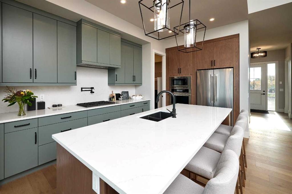 Experience refined living in this stunning villa-style bungalow, thoughtfully designed with elegant finishes and exceptional functionality. The main floor features a spacious Primary bedroom complete with spa-inspired ensuite and walk-in closet, complemented by a chef's kitchen with built-in appliances and a convenient butler's pantry. A dramatic vaulted great room with open to below views creates a grand yet inviting atmosphere, perfect for both everyday living and entertaining. Upstairs, a versatile loft offers a comfortable bonus room, full bedroom and bathroom. Ideal for guests. The fully developed basement expands the living space with a stylish wet bar, media room, games room, additional bedroom and full bathroom. Combining timeless architecture with modern luxury this home delivers the ultimate in comfort, sophistication and livability. Photos are representative.
