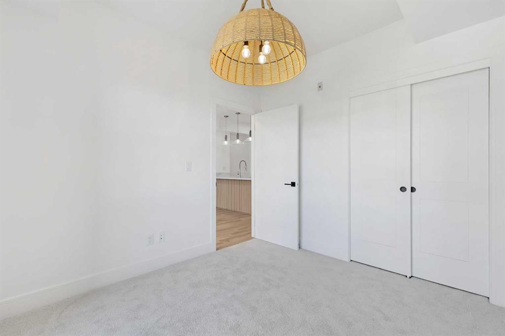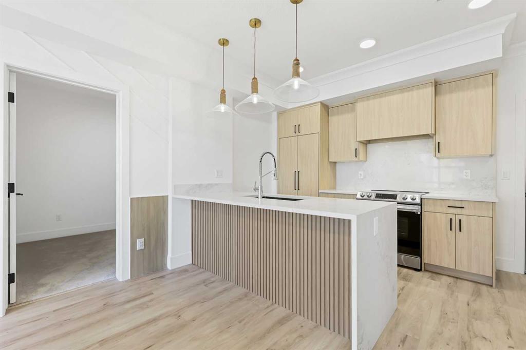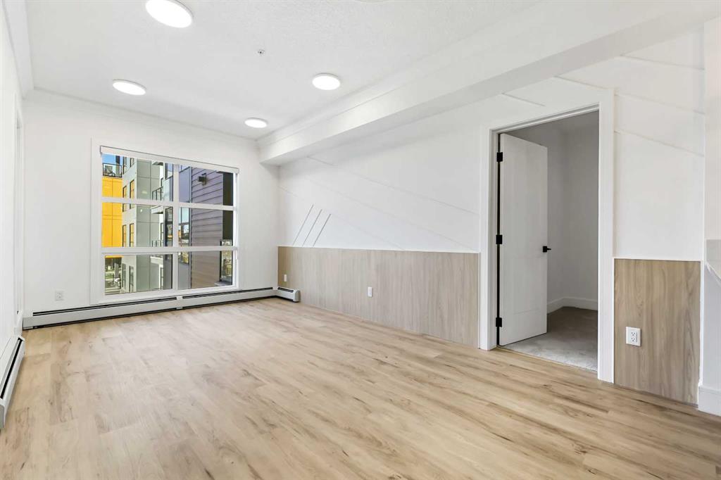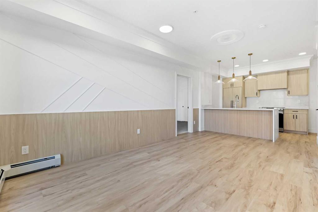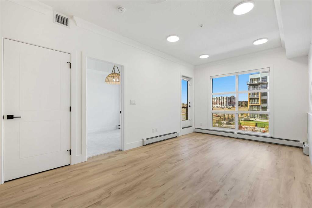 Experience elevated urban living in this brand-new, never-occupied 2-bedroom, 1-bathroom residence located in the highly desirable Currie Barracks community—one of Calgary’s most sought-after neighborhoods. Perfectly situated near Mount Royal University, this modern condo is ideal for professionals, students, or investors looking for exceptional rental potential in a prime location with Airbnb options upon approval. From the moment you step through the grand front entrance, you’ll be greeted by an atmosphere of modern sophistication. The open-concept layout features designer wall paneling in the living area, upgraded lighting, and an abundance of natural light streaming through large west-facing windows that lead to a spacious balcony overlooking the peaceful courtyard—the perfect place to unwind after a long day. The gourmet kitchen showcases custom cabinetry with matching panel-front fridge and dishwasher, sleek quartz countertops, stainless steel appliances, a gas cooktop, and a convenient breakfast bar ideal for casual dining. Every detail has been thoughtfully considered to blend functionality with style, offering ample cupboard and counter space to enhance everyday living. Both bedrooms are generously sized, providing flexibility for a guest room, home office, or roommate setup. The spa-inspired bathroom boasts modern fixtures and a quartz-topped vanity, while the stacked in-suite laundry offers everyday convenience. Additional highlights include luxury vinyl plank flooring, A/C rough-in for future cooling, and secure building access for peace of mind. Residents of Currie Barracks enjoy a vibrant, walkable lifestyle surrounded by boutique shops, cafés, parks, and pathways. Commuting is effortless with quick access to major routes and public transit, and you’re only minutes from downtown Calgary and local golf courses for leisure and recreation. Whether you’re seeking a luxurious urban retreat or a turnkey investment property, this pristine unit offers a perfect blend of style, convenience, and modern living in an unbeatable location.