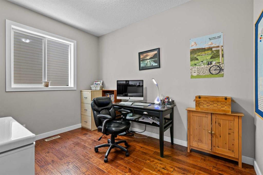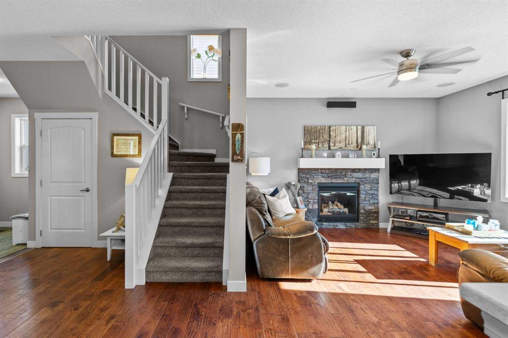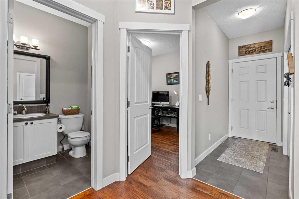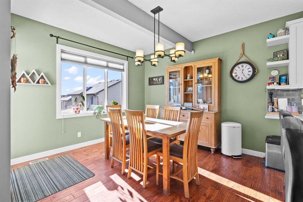 Located in Heritage Hills on Cochrane’s west side, this gorgeous two-story home is beautifully decorated and has an amazing family vibe with a touch of elegance. Walking in, whether you come in through the garage or front door, you will be welcomed home by lots of room to kick off your shoes on the easy to maintain ceramic tile entryways. Both entries also include ample closet space for all your outerwear. The main floor is open concept, with scraped hardwood floors throughout, and a super functional kitchen with quartz countertops with a big center island. The kitchen is truly the heart of this home, with a raised bar for hosting your guests, tons of cupboards for storage and counter space for whipping up some snacks and a huge pantry. The dining nook is bright and open with large sunny south facing windows, and the great room includes a cozy gas fireplace which makes it the perfect place to relax. There is also easy access to the deck and backyard, for hosting in the beautiful outdoors. The main floor also includes a dedicated office and a half bath on the main floor and access to the double attached garage. Upstairs, the sunny south facing master retreat will impress with mountain views. The ensuite has everything you need, with double basins, a big soaker tub, water closet, separate shower and walk in closet. Two more good sized bedrooms on this floor share a convenient Jack-and-Jill bathroom. The upstairs also has an amazing laundry room, appointed with a dedicated laundry sink and storage cupboards. Finally, this floor includes a spacious north facing bonus room with its own built in study station. This space would make an excellent library or TV watching space, for those who need a little break away from the main floor action. Downstairs is fully developed and includes a large rec room, a 3 piece bathroom, large bedroom with at grade egress windows. A great space for the family to grow! There is a large storage room with shelving to help keep you organized and a utility room. After enjoying all this home has to offer, step out to the beautiful south facing back deck and fully fenced landscaped backyard. Check out the unique deck storage solution for keeping all the outdoor toys. The houses are offset around you, giving you the feeling of space; perfect for enjoying those sunny Cochrane days. Come and see all that Cochrane and this beautiful home has to offer.