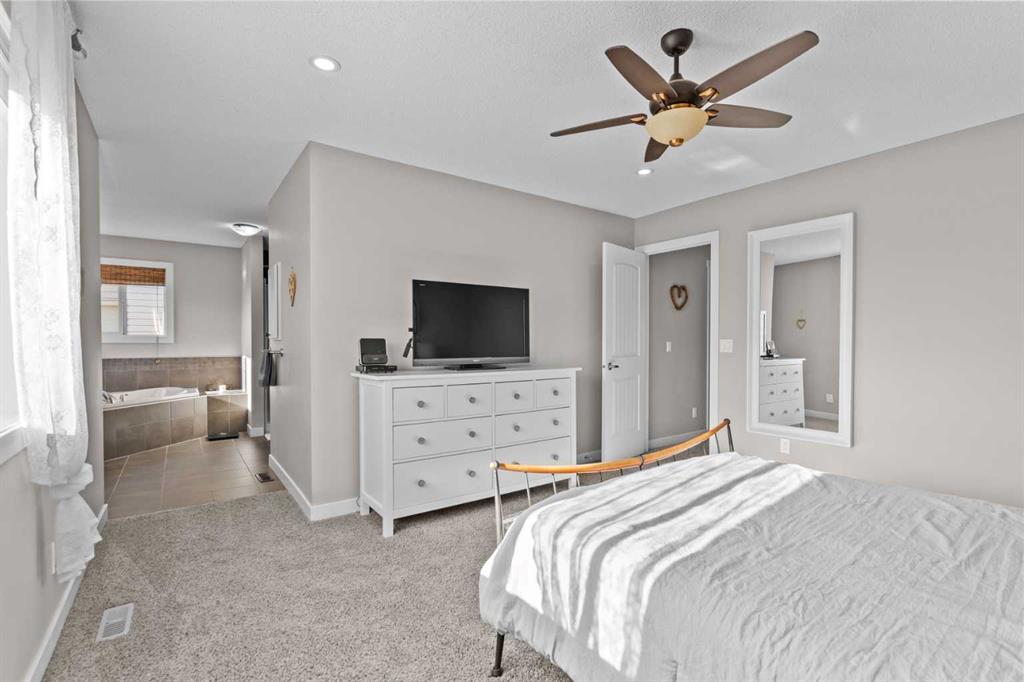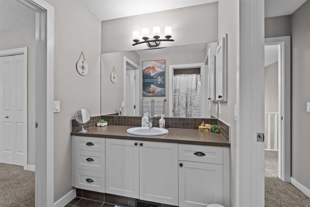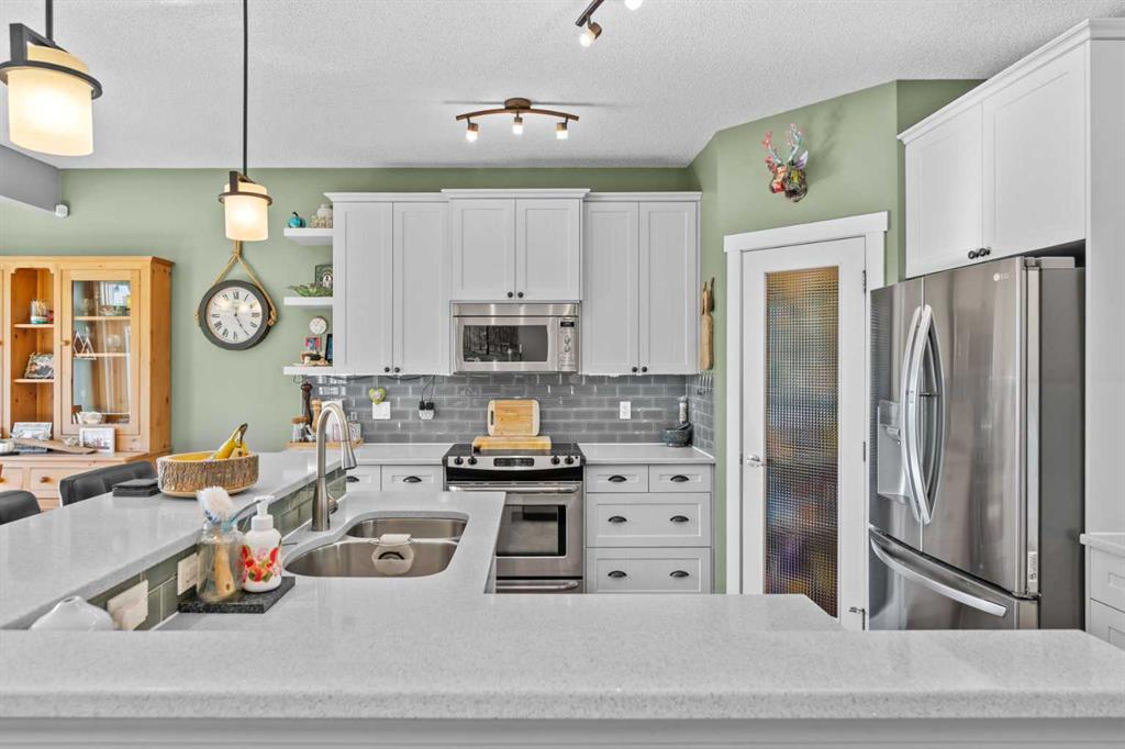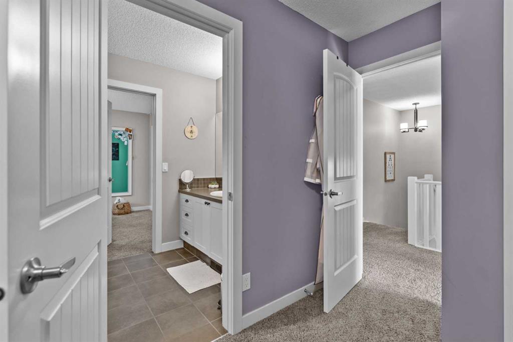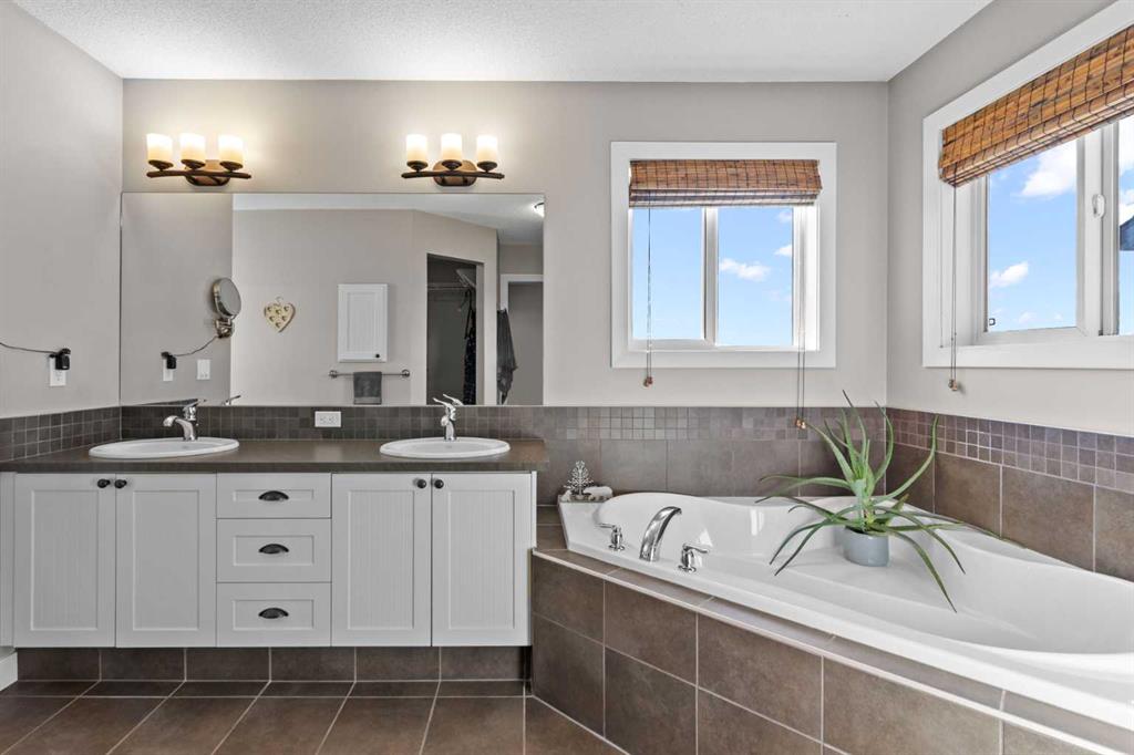 Located in Heritage Hills on Cochrane’s west side, this gorgeous two-story home is beautifully decorated and has an amazing family vibe with a touch of elegance. Walking in, whether you come in through the garage or front door, you will be welcomed home by lots of room to kick off your shoes on the easy to maintain ceramic tile entryways. Both entries also include ample closet space for all your outerwear. The main floor is open concept, with scraped hardwood floors throughout, and a super functional kitchen with quartz countertops with a big center island. The kitchen is truly the heart of this home, with a raised bar for hosting your guests, tons of cupboards for storage and counter space for whipping up some snacks and a huge pantry. The dining nook is bright and open with large sunny south facing windows, and the great room includes a cozy gas fireplace which makes it the perfect place to relax. There is also easy access to the deck and backyard, for hosting in the beautiful outdoors. The main floor also includes a dedicated office and a half bath on the main floor and access to the double attached garage. Upstairs, the sunny south facing master retreat will impress with mountain views. The ensuite has everything you need, with double basins, a big soaker tub, water closet, separate shower and walk in closet. Two more good sized bedrooms on this floor share a convenient Jack-and-Jill bathroom. The upstairs also has an amazing laundry room, appointed with a dedicated laundry sink and storage cupboards. Finally, this floor includes a spacious north facing bonus room with its own built in study station. This space would make an excellent library or TV watching space, for those who need a little break away from the main floor action. Downstairs is fully developed and includes a large rec room, a 3 piece bathroom, large bedroom with at grade egress windows. A great space for the family to grow! There is a large storage room with shelving to help keep you organized and a utility room. After enjoying all this home has to offer, step out to the beautiful south facing back deck and fully fenced landscaped backyard. Check out the unique deck storage solution for keeping all the outdoor toys. The houses are offset around you, giving you the feeling of space; perfect for enjoying those sunny Cochrane days. Come and see all that Cochrane and this beautiful home has to offer.