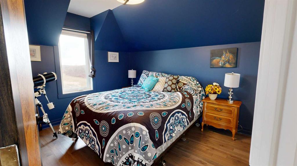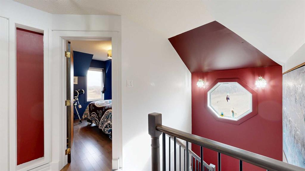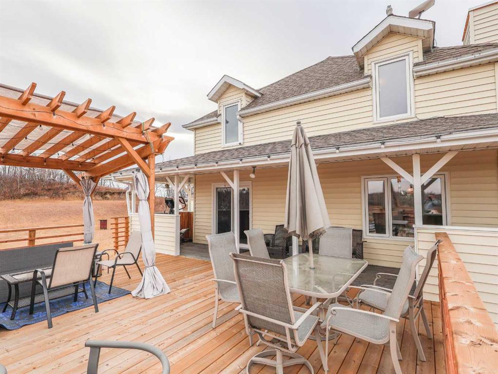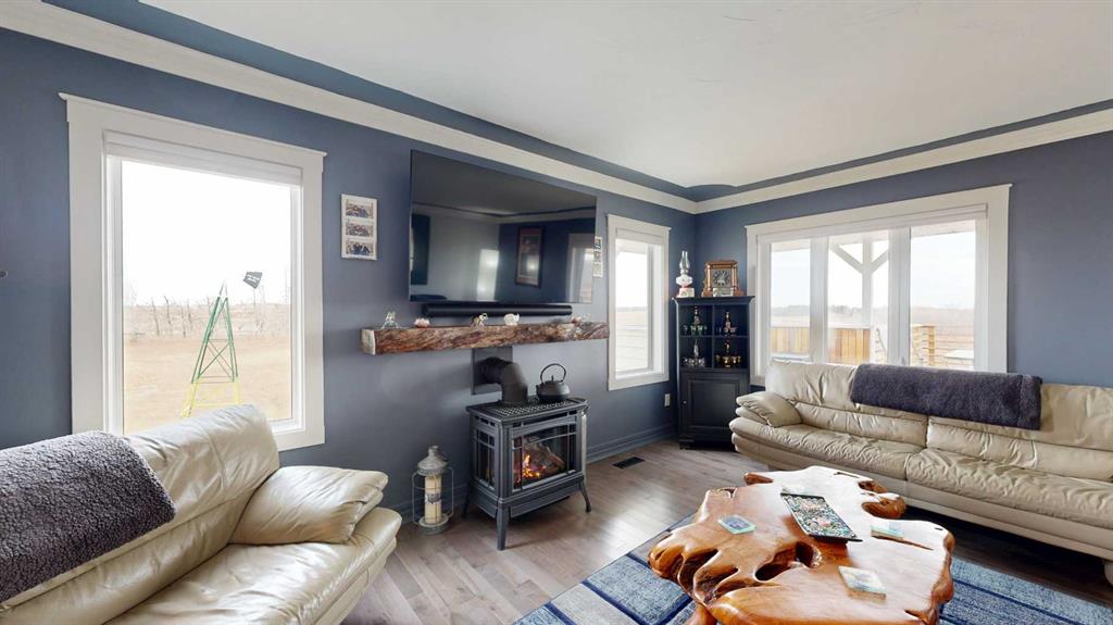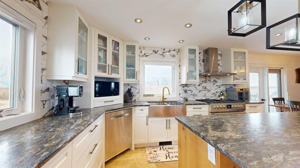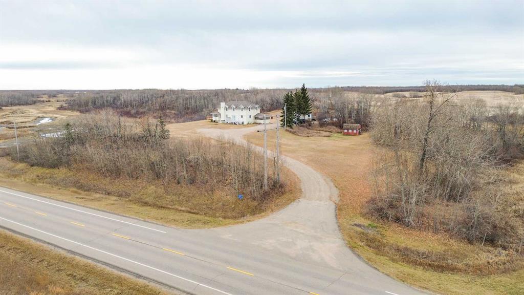 This iconic home is well known for its classic character, hilltop setting, and prime location along Highway 11. Ideally positioned between Stettler and Red Deer, this acreage offers the perfect blend of peaceful country living with an easy commute—pavement right to your driveway making travel easy year-round. Beautifully transformed through an extensive renovation in 2024, this home blends modern luxury with original architectural charm. Nearly everything has been upgraded to create a truly exceptional living space that is perfect for families, acreage owners, and anyone seeking a standout country home. A charming enclosed porch welcomes you at the main entrance, offering the perfect space to greet guests and enjoy morning coffee. The chef-inspired kitchen is sure to impress, featuring leather granite on the counters and an 8’7” island, high-end appliances including a full-height fridge and freezer and dual fuel range, soft-close drawers, and appliance garages to keep everything neatly tucked away. The kitchen opens to the dining room, where patio doors lead to the deck for seamless indoor-outdoor living and entertaining. The spacious living room exudes warmth and comfort with a new gas fireplace/stove and a live-edge mantle. A convenient main floor office also offers patio doors to the veranda, making it ideal for working from home. The spa-like three-piece bathroom includes leather granite and a walk-in shower, while the large laundry room features high-end steam washer and dryer and a laundry chute. Upstairs, the home’s original character shines through with the classic octagonal window, decorative panels on the bedroom doors, and a cozy reading nook at the top of the stairs. The primary bedroom includes a walk-in closet and a luxurious five-piece ensuite with a solid wood vanity counter, jet tub, walk-in shower, and a private water closet. Three additional bedrooms offer beautiful views overlooking the property and surrounding landscape. The four-piece bathroom features travertine flooring, a leather granite countertop, and a custom tub and shower. The basement is a blank slate awaiting the vision of the new owner, offering plenty of potential for development. The property offers expansive views, including scenic wetlands to the east, which can be enjoyed from the veranda or deck. Upgrades have been done in the last two years and include travertine and maple hardwood flooring, windows on the main and upper level, blinds, central vacuum system, updated electrical panels in both the house and garage, R50 blown-in and R40 batt insulation in the attic, hot water tank, and central air. The home was moved onto a new basement in 1984. The garage features updated doors, central vacuum, and a full wall of cabinetry to help keep everything organized. Whether you are raising a family, working from home, commuting for work, or simply seeking a peaceful country lifestyle with modern luxuries, this exceptional property provides a setting that is easy to fall in love with.