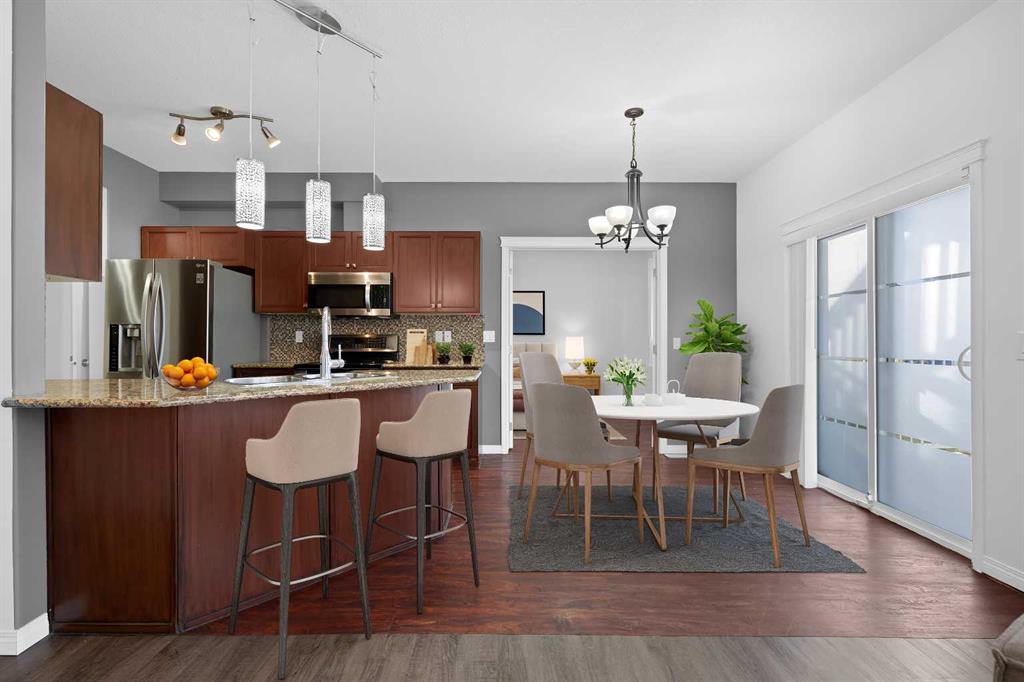 OPEN HOUSE SUNDAY 4TH JAN 12-2PM. Welcome to this great ground floor 3-bedroom unit, offering lots of space for the family and no stairs! As you walk up to the home you will appreciate the covered East facing patio - a great place to enjoy your morning coffee! Step inside and appreciate the abundance of natural light and the tiled feature wall. This home has no carpets, making it great for anyone with allergies! The kitchen features maple stained cabinetry, gleaming granite countertops, a stylish tiled backsplash, and stainless steel appliances—including a double oven - great for preparing meals! Relax in the bright and inviting living room which features a large west facing window that fills the space with natural light. Entertain in the dining area or step out of the patio doors onto the large west facing patio of a BBQ. There are 3 good sized bedrooms with the spacious primary suite featuring a 4-piece ensuite with granite counters. There is a 4-piece family bathroom. Completing this unit is a laundry with washer and dryer. There is a door from the front patio that provides access to your own private storage room. The property includes two assigned parking spaces, and pets are welcome with board approval. Don't miss out on this lovely home. View 3D tour/virtual tour