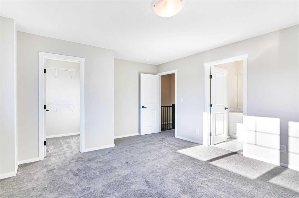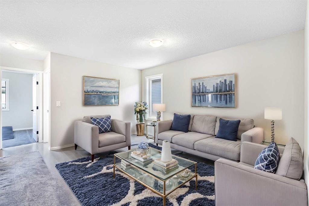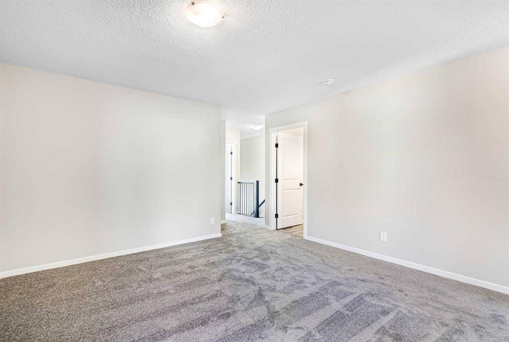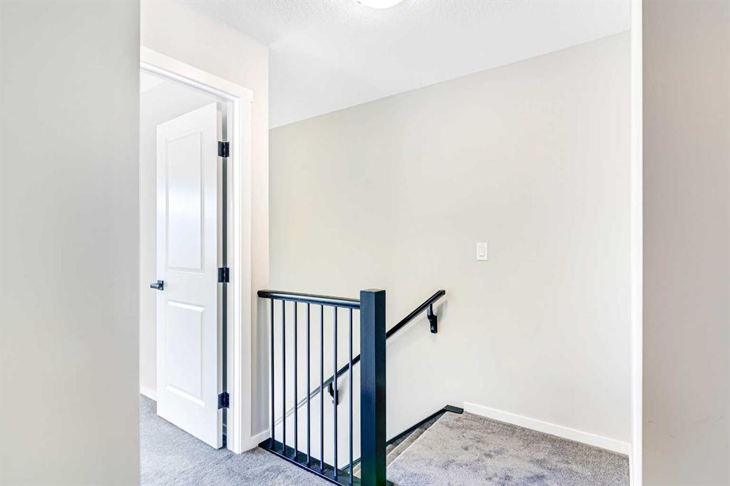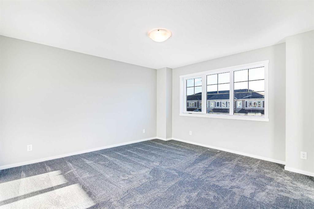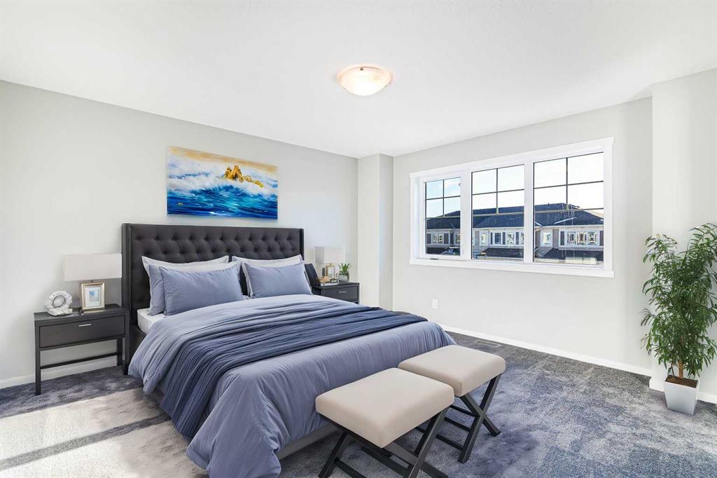 Welcome to this SOUTH FRONT FACING NO CONDO FEE END UNIT townhome! Font facing a large green space and a future school. Solar Panels on the roof. Impressive curb appeal and a modern design blends with a highly functional layout boasting 3 beds / 3 baths and over 1500 sq ft of finished living area. This home has also been highly upgraded throughout - raised kitchen cabinets with crown molding, stainless steel appliances, upgraded luxury vinyl plank, quartz countertops, tiled bathroom walls, as well as many additional pot light fixtures. Upon entry the open concept is exemplified with an inviting Kitchen/Dining/Living space on the main floor. The kitchen is equipped with upgraded stainless steel appliances, full height kitchen cabinets, and loads of counter space and storage! There is also a cozy living room, a large pantry closet, a 2 piece bath and double attached garage. Upstairs, the primary bedroom is bright and spacious and has a private 4 piece ensuite with a large walk-in shower. The bonus room provides more privacy for the primary bedroom from the other 2 bedrooms upstairs. There is also a full laundry room and 4 piece bath that completes the upstairs. The lower level is bright and has a 3 piece bathroom rough-in that is perfect for a future bathroom. With quick access to anywhere in Calgary via Stoney Trail and multiple nearby shopping options including Crossiron Mills, the quickly maturing community of Carrington is a great option for the busy family! Book your showing today!