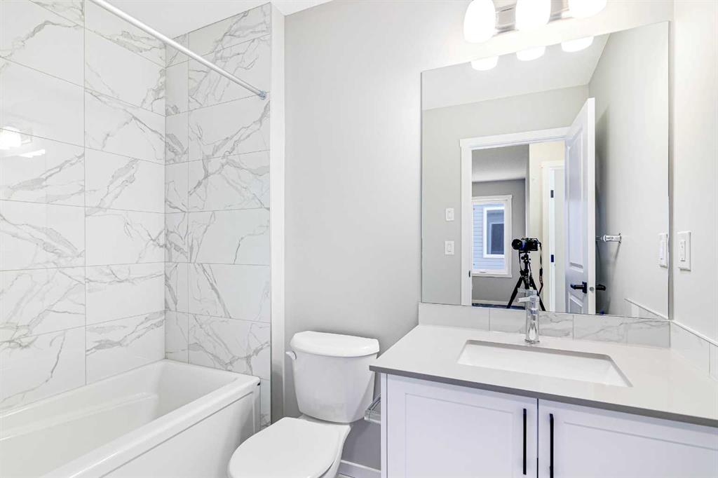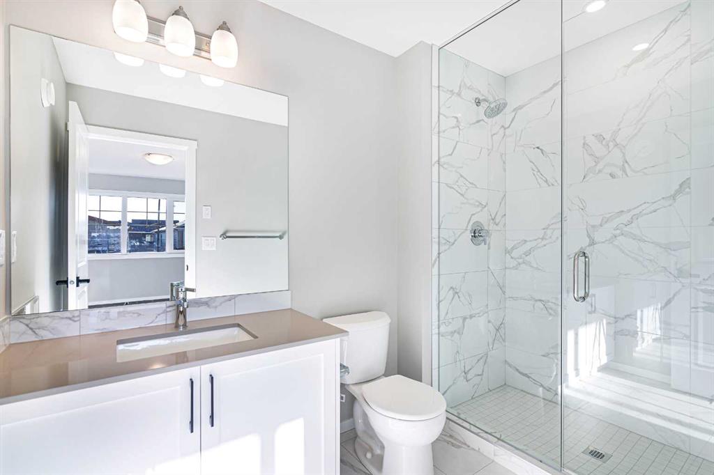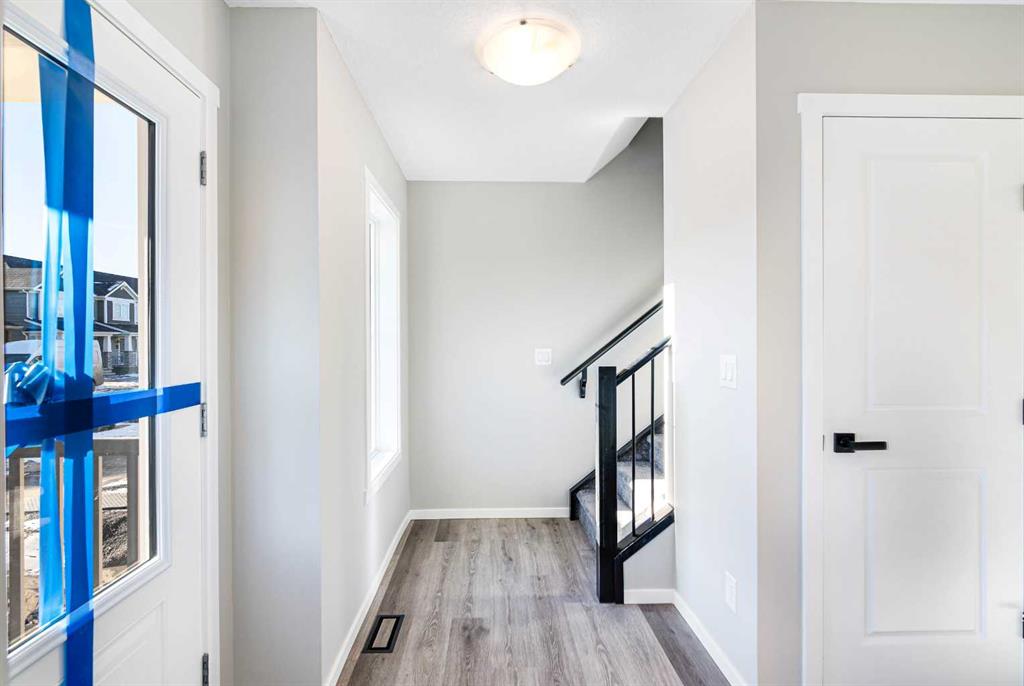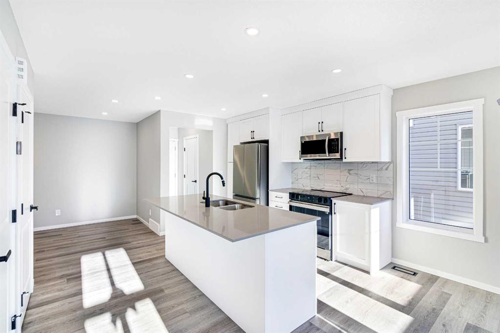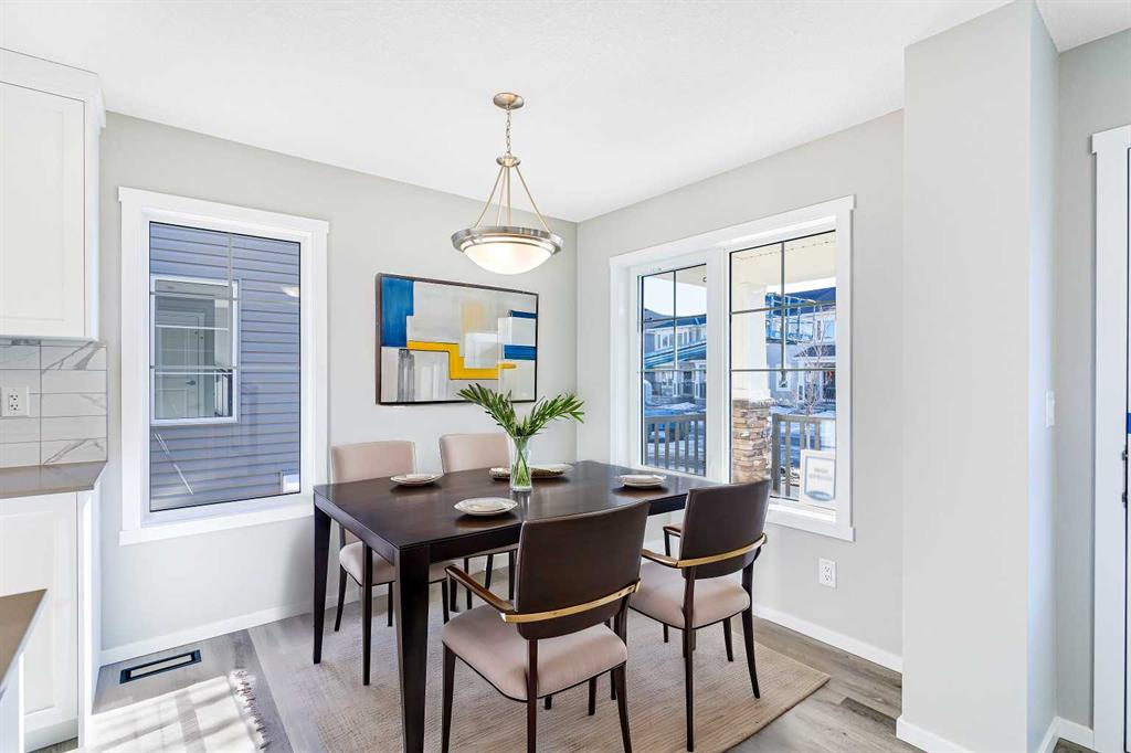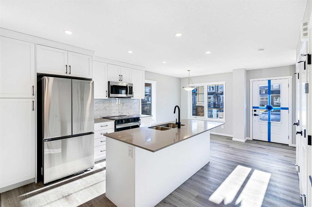 Welcome to this SOUTH FRONT FACING NO CONDO FEE END UNIT townhome! Font facing a large green space and a future school. Solar Panels on the roof. Impressive curb appeal and a modern design blends with a highly functional layout boasting 3 beds / 3 baths and over 1500 sq ft of finished living area. This home has also been highly upgraded throughout - raised kitchen cabinets with crown molding, stainless steel appliances, upgraded luxury vinyl plank, quartz countertops, tiled bathroom walls, as well as many additional pot light fixtures. Upon entry the open concept is exemplified with an inviting Kitchen/Dining/Living space on the main floor. The kitchen is equipped with upgraded stainless steel appliances, full height kitchen cabinets, and loads of counter space and storage! There is also a cozy living room, a large pantry closet, a 2 piece bath and double attached garage. Upstairs, the primary bedroom is bright and spacious and has a private 4 piece ensuite with a large walk-in shower. The bonus room provides more privacy for the primary bedroom from the other 2 bedrooms upstairs. There is also a full laundry room and 4 piece bath that completes the upstairs. The lower level is bright and has a 3 piece bathroom rough-in that is perfect for a future bathroom. With quick access to anywhere in Calgary via Stoney Trail and multiple nearby shopping options including Crossiron Mills, the quickly maturing community of Carrington is a great option for the busy family! Book your showing today!