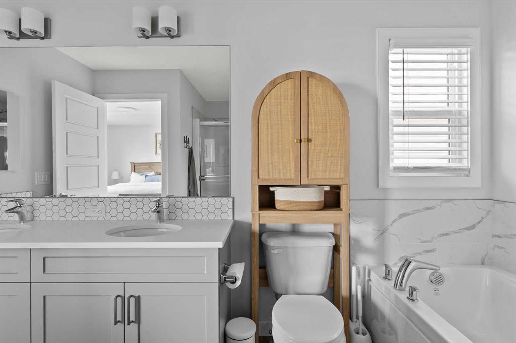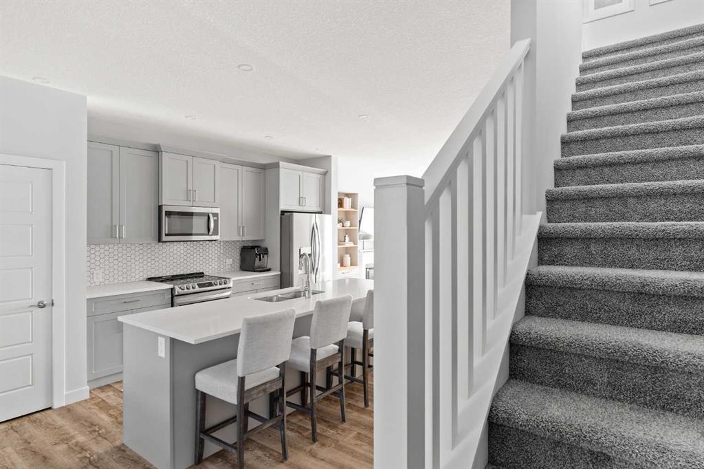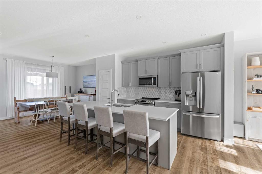 A pristine original-owner home in the heart of Chelsea, Chestermere - showcasing true pride of ownership and presenting as close to new as it gets. With nearly 1,650 sq. ft. of thoughtfully designed living space, this is the ideal family home offering 3 bedrooms, 2.5 bathrooms, a fully landscaped yard, a private double detached garage, and an undeveloped basement with rough-ins ready for your future vision. The open-concept main level is anchored by a stunning central kitchen, creating the perfect flow for both everyday living and entertaining. Finished with timeless light grey shaker cabinetry, an oversized quartz island, and a full suite of upgraded stainless-steel appliances, this kitchen is as functional as it is beautiful. A south-facing front great room is bathed in natural light through a wall of windows, while the expansive ~14' x 10' dining area at the rear comfortably accommodates any dining setup and overlooks the private backyard. A convenient powder room and large closets at both the front and back entrances complete the main level. On the upper level, the impressive ~14' x 12' primary suite easily fits a king-sized bed and additional furniture. It’s complete with a luxurious 5-piece ensuite featuring dual sinks, a soaker tub, a walk-in shower, and a generous walk-in closet with space for two. Two comfortable secondary bedrooms sit at the opposite end of the home, separated by a large main bathroom and an upper-level laundry room - an ideal layout for privacy and practicality. Outside, the property is fully landscaped, fenced, and completely move-in ready - saving you the time and cost typically associated with new construction. Enjoy multiple outdoor living spaces, including a charming full-width covered front porch to capture the south sun, and a large rear deck with gas line and pergola overlooking the private yard. The double detached garage provides secure parking and extra storage year-round - an especially appreciated benefit during the winter. Perfectly positioned within walking distance to parks, schools, and local amenities, while still only a quick drive to Calgary, this home delivers convenience, comfort, and exceptional value in the vibrant community of Chelsea in Chestermere. A truly move-in-ready home that combines thoughtful design, modern finishes, and unbeatable location - this is one you won’t want to miss.