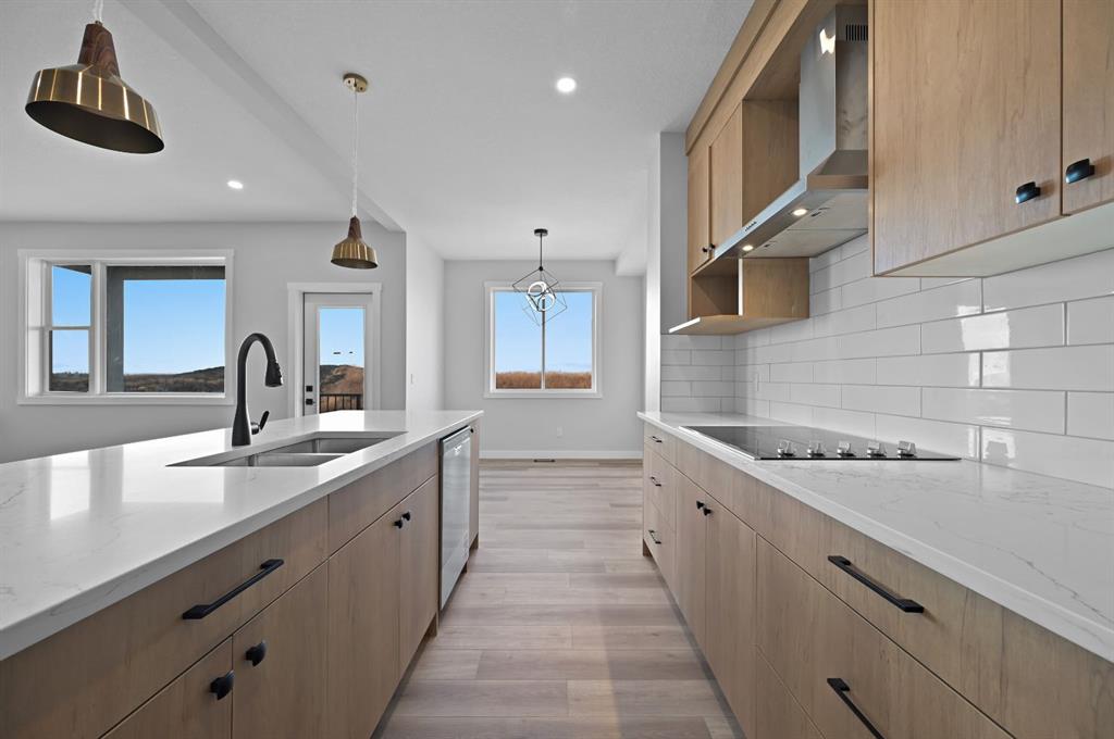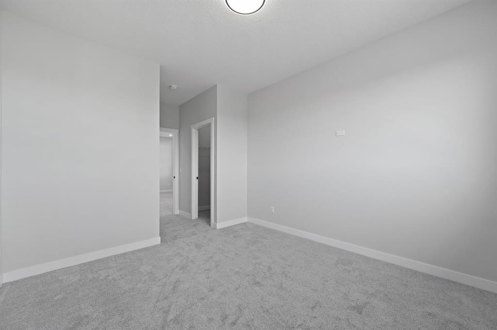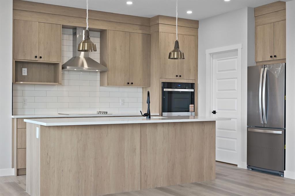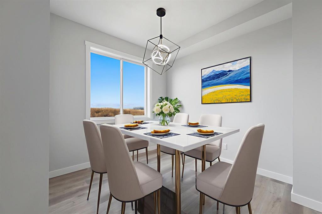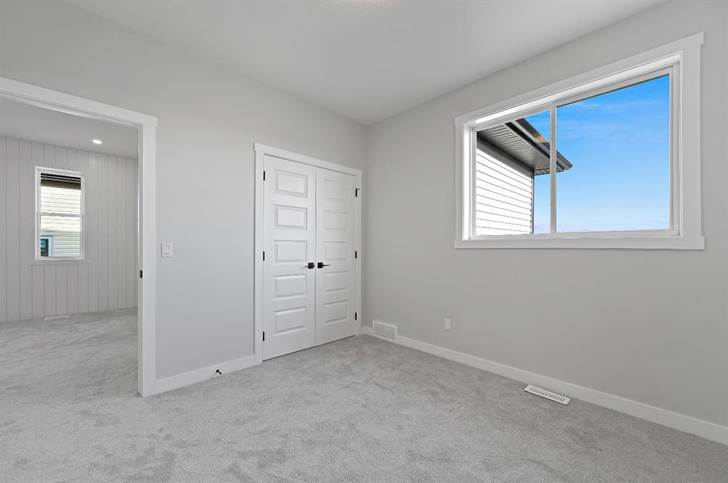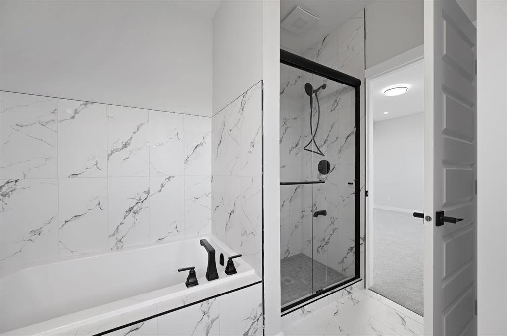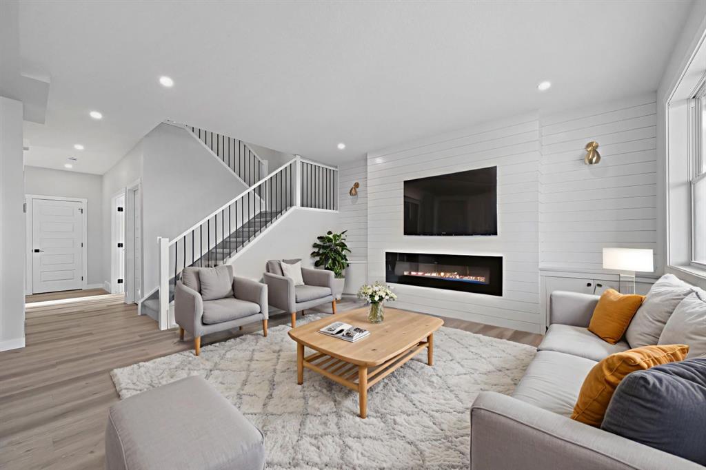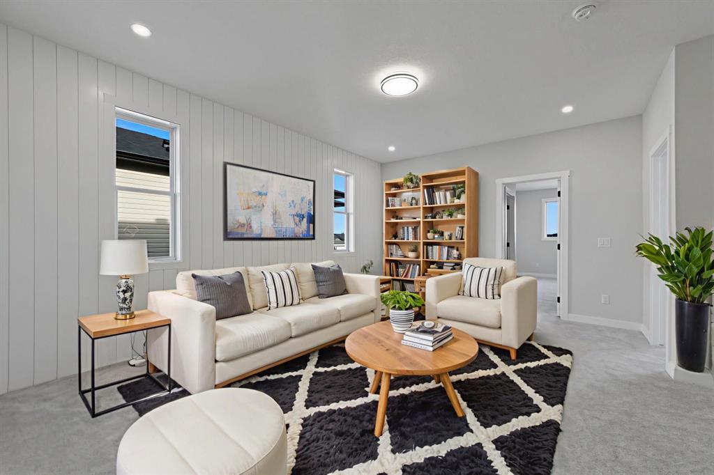 Welcome to this stunning 3-bedroom plus den, 2.5-bathroom home designed with style, comfort, and versatility in mind. From its neutral tones to its high-end finishes, every detail reflects modern craftsmanship and thoughtful design. Step inside to an inviting open-concept main floor featuring luxury vinyl plank flooring and an impressive white wood-accented wall in the family room, complete with a large remote-controlled electric fireplace and built-in speakers. The chef’s kitchen showcases white quartz countertops, elegant white tile backsplash, and contemporary cabinetry — a perfect blend of simplicity and sophistication. A bright dining area with a modern LED chandelier adds a touch of glamour, while the den with double doors provides the perfect space for a home office or guest bedroom. Upstairs, an extra-wide staircase leads to the spacious bonus room — ideal for movie nights or relaxing evenings — featuring another elegant white accent wall. The primary suite is a true retreat, boasting large windows, a generous walk-in closet, and a luxurious 5-piece ensuite with dual sinks, a soaker tub, and a striking white-and-black tiled shower. Two additional bedrooms offer ample space and natural light, complemented by soft, plush carpeting and a convenient upper-level laundry room. The home also offers a side entrance with income potential, and the basement includes rough-ins to easily add two more bedrooms in the future. Thoughtful touches like black Moen fixtures throughout elevate the home’s luxurious feel. The triple attached garage comes equipped with gas and electrical hookups, ready for heat — perfect for Alberta winters. This home truly balances modern beauty, smart design, and functional living — ready for your family to move in and enjoy.