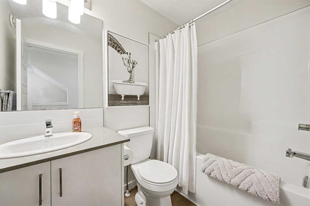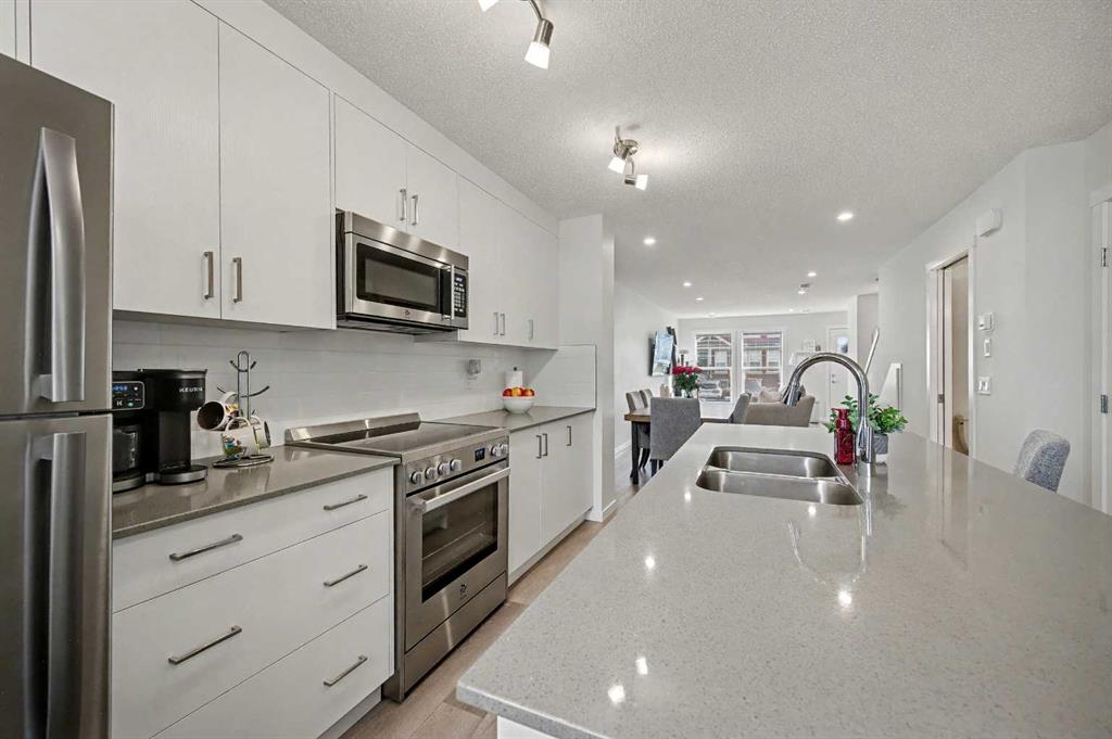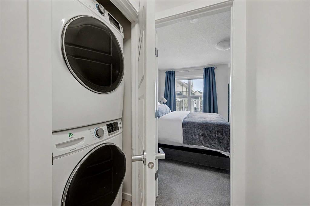 Welcome home! Discover this beautiful three-storey, 1,544 sq ft executive townhome located in the lower part of Cranston, within the sought-after Riverstone community. The site is perfectly positioned backing onto a large green space and very close to Fish Creek Park and the Bow River, this townhome offers a tranquil and scenic setting. The spacious main floor welcomes you with a large living room, an inviting dining area, and a massive kitchen counter island complete with a breakfast bar, while a convenient two-piece powder room is located just off the dining and living rooms. Enjoy the sunny west-exposed backyard, ideal for your puppy, family BBQs, and soaking up some extra sunshine. Upstairs, the second level offers two generous bedrooms—the primary easily accommodates a king-size suite and features a three-piece ensuite bath, and the second bedroom boasts east-facing windows, bathing the room in morning sunlight to help young ones rise early. The third level presents a versatile bonus space: use it as a music room, workout area, home office, guest quarters, or a quiet family room retreat, and step out onto the east-facing balcony for peaceful early-morning views. Throughout, neutral decor is complemented by quartz countertops, a breakfast bar, stainless steel appliances, central air conditioning for warmer days, and vinyl and carpet flooring; the entire home shows like new, with great windows offering abundant daylight. Your designated parking stall is just steps away from the front door. The Century Hall recreation facility nearby offers fantastic amenities including winter hockey and skating, a summer splash park, tennis courts, a summer skate park, meeting rooms, rental options, and a gymnasium. Additional neighborhood conveniences include access to schools, shopping, major traffic routes, and bike pathways, all with very affordable townhome fees—making this property a fantastic opportunity to join one of the best communities that southeast Calgary has to offer.
