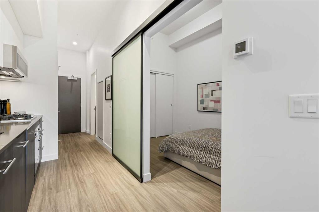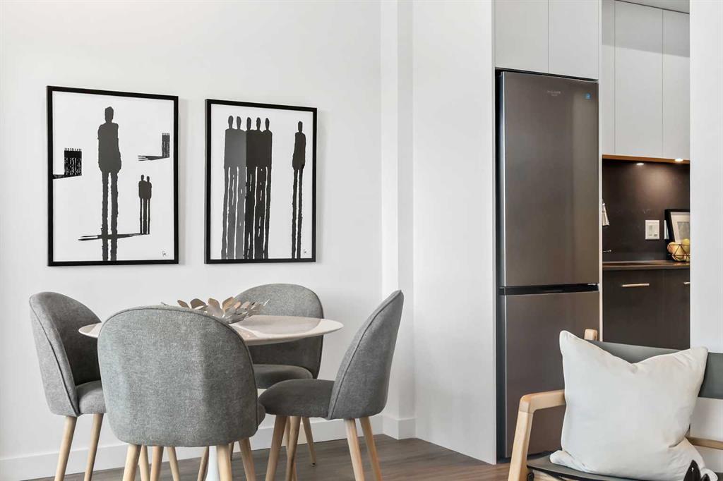 Welcome to Unit 103 at First & Park — our final main floor, sleek one-bedroom, one-bathroom perfectly positioned in the heart of Eau Claire, in downtown Calgary. This modern unit impresses with soaring ceilings, large north facing windows, and two convenient access points, including direct private entry for a true urban-living feel. Step inside to discover a bright, open-concept kitchen and living space featuring contemporary flat-panel cabinetry, quartz counters, stainless-steel appliances, and a gas cooktop. The thoughtful layout maximizes every inch of space, while natural light floods through expansive windows, creating a warm and inviting atmosphere. Enjoy your morning coffee or evening unwinding in the stylish living area or on the terrace with views of the tree-lined street. The spacious bedroom offers excellent storage with double closets, and the sleek 4-piece bathroom adds a spa-like touch. Packages available for FURNISHED UNITS! Perfectly located steps from the Bow River pathways, Eau Claire Market, Prince’s Island Park, and the LRT, this home blends downtown energy with modern comfort. Whether you’re a first-time buyer, investor, or urban professional, this suite checks all the boxes — high design, unbeatable location, and functional luxury.