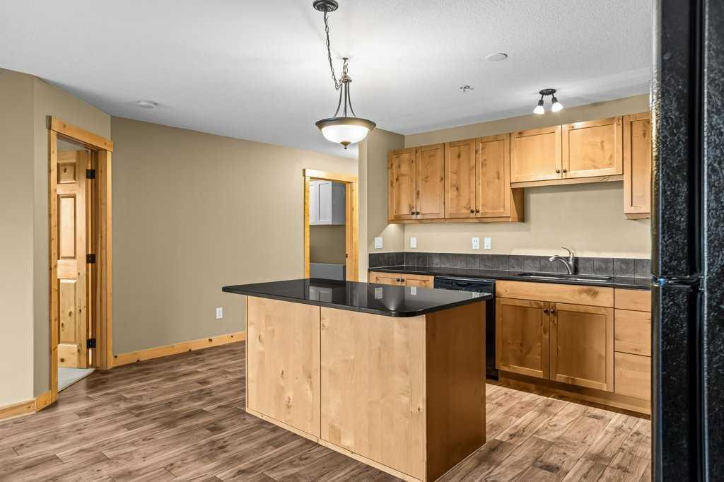 Bright 1-Bed + Den with Mountain Views & Modern Comforts in Canmore - This south-facing 1-bedroom plus den, 2-bath apartment offers unbeatable value and a lifestyle surrounded by Canmore’s natural beauty. Located on the 3rd floor, you’ll enjoy beautiful mountain views that remain even after nearby construction — with the new build helping block noise, making your balcony time peaceful and private. Inside, the open-concept layout features a kitchen with black granite countertops, island, and knotty alder wood trims for that warm mountain charm. Vinyl plank flooring flows through the main areas, while carpets in the bedroom and den add cozy comfort, highlighted by in floor heat. An electric fireplace creates a welcoming ambiance, and ceiling fans in every room keep the air fresh year-round. You’ll love the 2024 laundry appliances, two parking stalls (one titled underground, one assigned outside), and a secure storage cage. The building is well maintained and includes an elevator, common workroom, a gym and a dog park—perfect for a convenient, active lifestyle. With low condo fees and taxes, this home is ideal for first-time buyers, singles, or young families who want to own in Canmore without compromise.