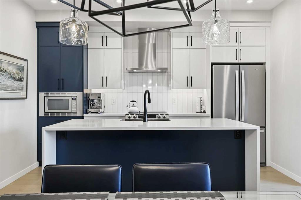 Welcome to 709 Marine Drive SE: a builder-rebuilt villa townhome offering nearly 1,900 sqft of professionally finished living space and premium upgrades throughout. Originally one of the Mahogany model showhomes, this unit was entirely rebuilt in 2021 and has barely been lived in since. The open main floor features engineered hardwood, a chef-inspired kitchen with upgraded stainless steel appliances, quartz counters, and a large island. The spacious primary suite includes a walk-in closet and private ensuite. A bright living room, generous dining space, powder room, and main-level laundry complete the layout. The lower level is professionally finished with two large bedrooms, a full bathroom, and a rec room. Comfort upgrades include air conditioning, dual-zone control furnace, water softener, and WiFi thermostats. Enhanced soundproofing construction (double wall with air gap, insulation, and drywall layers) offers quiet living. Enjoy a private, builder-fenced backyard with lane access and a detached double garage. Bins are collected at the rear. Best of all, you're steps from Mahogany’s lake entrance, beach club, parks, shopping, and restaurants. Move-in ready with optional furnishings available. No condo fees, just lock-and-leave ease in one of Calgary’s most sought-after lake communities.
