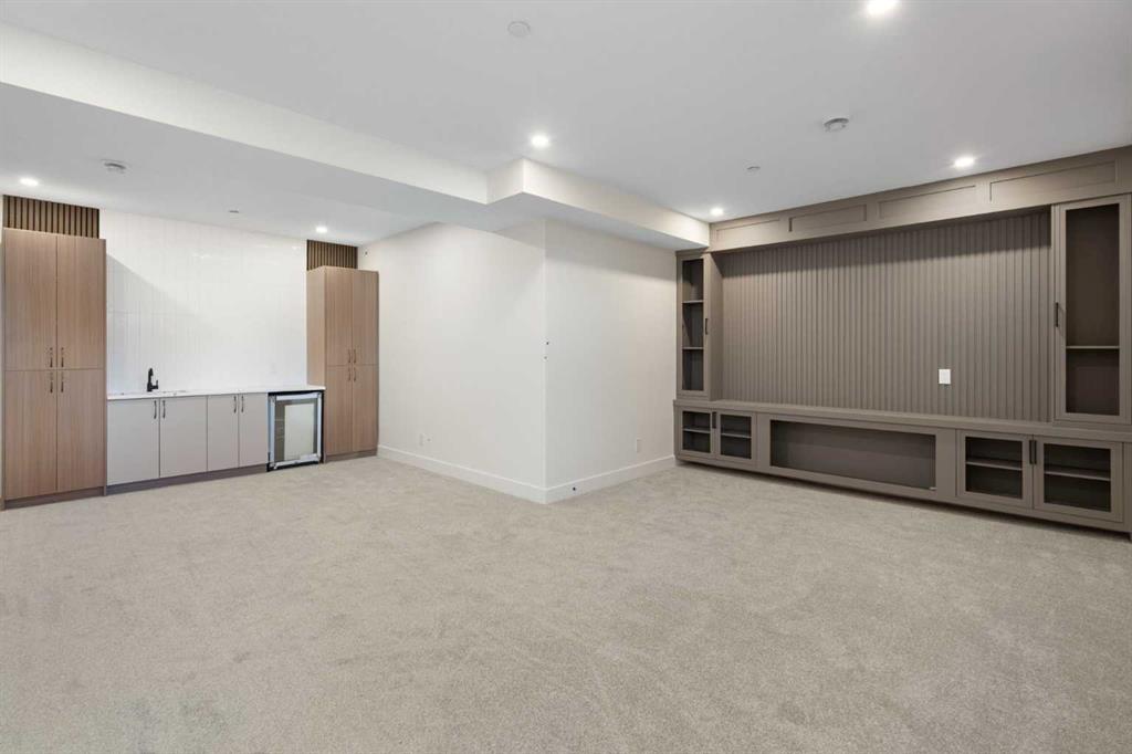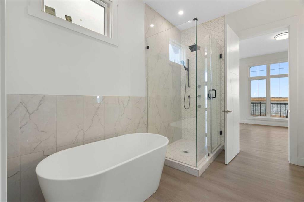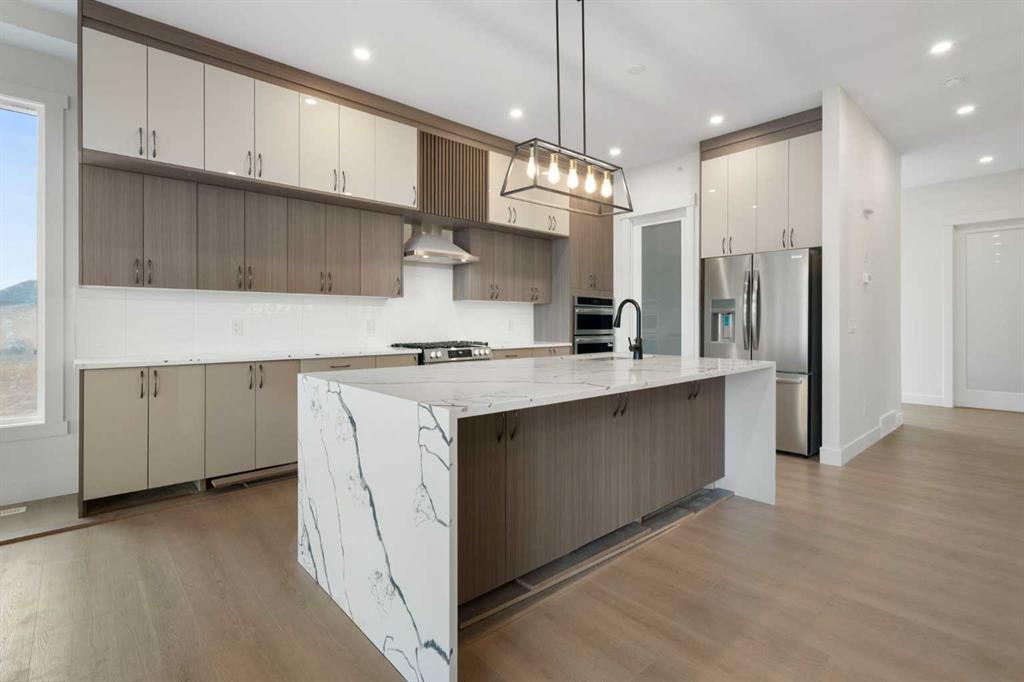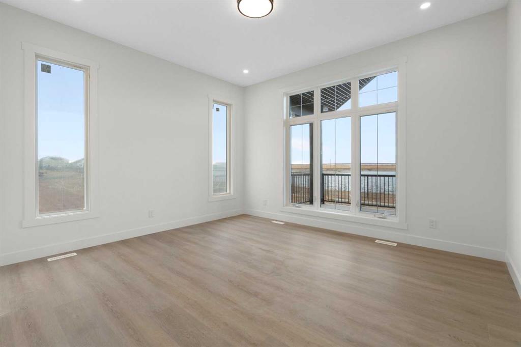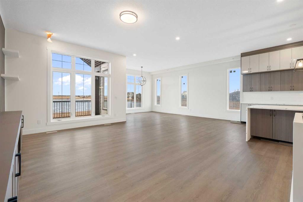 ELIGIBLE FOR FIRST HOME BUYERS GST REBATE. Welcome to Lakes of Muirfield, where elegance, space, and breathtaking views come together in this extraordinary bungalow offering more than 4,000 sq ft of beautifully finished living space. Set on a premium lot backing onto a serene pond with no neighbours behind, this home features a west-facing backyard with mountain views and a full-width covered deck topped with a stunning vaulted roof—an incredible extension of your living and entertaining space. Inside, the sprawling 2,071 sq ft main floor showcases exceptional craftsmanship, refined finishes, and thoughtful built-ins throughout. The kitchen is a standout, featuring two-tone cabinetry, an extended island with waterfall quartz countertops, stainless steel appliances, and a walk-in pantry. The open-concept layout flows into the great room, highlighted by a massive feature wall with custom built-in cabinetry, creating an impressive focal point for the entire space. The private primary suite is a true retreat, complete with a 5-piece ensuite featuring a stand-alone tub, separate tiled shower, and a huge walk-in closet with built-in drawers. Two additional main-floor bedrooms, a full bath, a spacious mudroom, and convenient main-floor laundry offer comfort and practicality for busy households. The fully finished lower level expands your living options with a large entertainment centre, wet bar, a sprawling rec room, a versatile bonus room, three more bedrooms, a full bath, and exceptional storage. With six bedrooms total and abundant closets throughout, this home easily accommodates families, multi-generational living, guests, hobbies, and home offices. An attached 3-car garage (approx. 725 sq ft) provides outstanding parking and storage for vehicles, tools, and toys. Combining luxurious indoor comfort with tranquil outdoor living, this property offers the perfect balance of privacy, space, and convenience—just minutes from city amenities. A rare opportunity in the desirable community of Lakes of Muirfield.