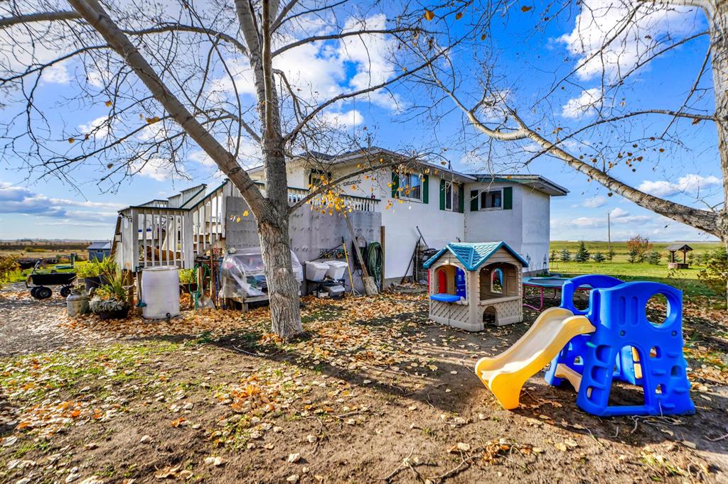 Welcome to your own slice of countryside serenity—just minutes from the city. This 44-acre hobby farm offers endless possibilities with 44 acres of irrigated land, perfect for crops, grazing, or gardens. A charming bungalow with a walk-up basement anchors the property, blending rustic character with modern updates for comfortable everyday living. With 40 acres of lush pasture backing onto an irrigation canal and year-round underground irrigation around the home, the land is set up beautifully for farming, ranching, or simply enjoying green, open space. The remaining acres feature the home and well-planned outbuildings, including a barn with 4 box stalls and 6 additional open stalls, plus a 28x24 shop ideal for equipment, hobbies, or storage. Inside the home, you’ll find a welcoming blend of comfort and potential. Recent updates— including modern appliances, refreshed cabinetry, and a bright, functional layout—make it perfectly livable from day one, while the original hardwood floors and spacious rooms offer a chance to bring your own style and ideas to life. Whether you envision restoring its classic charm or adding contemporary touches, this home provides a solid, updated foundation ready for your personal vision Whether you're dreaming of raising horses, starting a market garden, or creating a peaceful rural retreat, this property offers the perfect canvas. All of this, and you're only 25 minutes to Calgary and 12 minutes to Strathmore, with paved access right to your driveway. Come experience the space, the quiet, and the possibilities this unique acreage has to offer.
