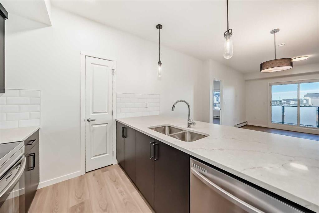 Welcome to Glacier Ridge by award winning Cedarglen Living! This brand new 2-bed, 2-bath apartment in the scenic, family friendly community of Glacier Ridge! Conveniently located close to shops, amenities, schools & professional services all within a short drive. Walk to Sage Hill Quarter, parks, and playgrounds in minutes. This GR-08 model is 906 sq ft (RMS size) and 984 sq ft (builder size) with a desirable layout, 9 ft knockdown ceiling throughout, luxury vinyl plank flooring, and plenty of top-quality features & upgrades. Step into a beautiful kitchen with full height black cabinetry, quartz counters with extended stool bar, Energy Star stainless steel appliances including a French door fridge with a waterline rough-in, undermount sink with pull down faucet, and separate pantry. Good sized dining room and an open living room separate the bedroom areas. The living room has an upgraded, reinforced wall & rough ins for a television, plus a sliding patio door opens out to the spacious balcony with a gas line hook up for a barbecue. This unit is roughed in for air conditioning! Plush carpet, large windows, and blackout blinds in both spacious bedrooms, each with a walk-in closet. The primary bedroom features a 4-pce ensuite, great storage in the vanity with upgraded drawers, and a spacious shower with a seat. The other 4-pce bathroom has a tub/shower combo and both offer quartz counters. Excellent laundry room features a full-size washer and dryer with space to add additional storage or countertop. Titled underground parking stall. This complex is well planned with a community garden, 10 visitor parking stalls, bike storage, & two elevators. Glacier Ridge has 10 km of trails & pathways with 5 schools planned and Glacier Ridge Village with a gymnasium, outdoor sport courts, a splash park, skating, tobogganing and more! Easy access to the Rocky Mountains or travel on Hwy 1 & 2.