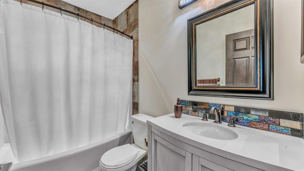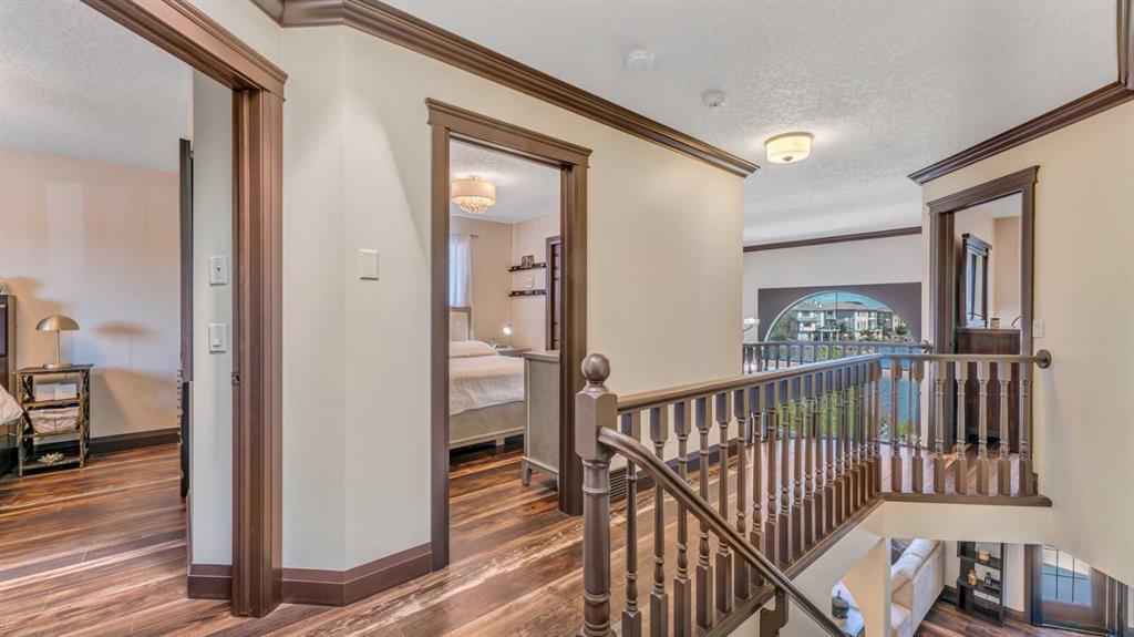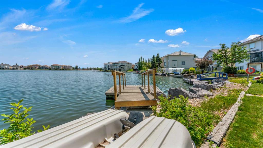 BACKING ONTO LAKE WITH A PRIVATE DOCK | BEAUTIFULLY RENOVATED | 5 BEDROOMS + DEN | LAKE VIEWS FROM EVERY LEVEL | LUXURIOUS WALKOUT | BEDROOM & FULL BATH ON THE MAIN FLOOR | Nestled on a quiet cul-de-sac and set on an extra-deep 132’ lot, this beautifully renovated lakefront home blends timeless design with an unmatched lakeside lifestyle. Enjoy direct water access from your private dock, multiple outdoor living spaces and captivating views from every level. The elegant stucco exterior, inviting front porch and durable metal roof provide lasting appeal and peace of mind. Inside, rich flooring, crown moldings and refined lighting elevate the home’s character. A bayed front living room sets the stage for formal gatherings, while the private den offers a quiet workspace. At the heart of the home, the family room impresses with soaring cathedral ceilings, a statement gas fireplace with stone surround and expansive windows that frame the sparkling lake. The adjoining dining room, wrapped in bayed windows, opens onto the full-width upper deck, ideal for seamless indoor/outdoor entertaining. Culinary creativity is inspired in the gourmet kitchen featuring full-height shaker cabinetry, stainless steel appliances including a gas stove, upgraded backsplash, pantry and generous counter space for everyday prep or hosting. A versatile main floor bedroom (or 2nd den) and full 4-piece bathroom add flexibility for guests or multigenerational living. Upstairs, crown moldings continue through four spacious bedrooms, including a serene primary suite with a cozy sitting area, walk-in closet and a spa-inspired ensuite with dual sinks and an oversized tiled shower, all framed by sweeping lake views. A second 4-piece bath serves the additional bedrooms, one of which overlooks the family room below and can be closed for privacy. The fully finished walkout basement expands your living space with a flexible recreation zone for media, games or fitness, opening directly to the covered patio and landscaped yard. A stylish wet bar with peninsula seating enhances entertaining, while a 5th bedroom and full 4-piece bath create a private retreat for guests or extended family. Outside, lush landscaping leads to a paver stone patio and firepit overlooking the water, offering the perfect spot to unwind at sunset. A private dock invites swimming, paddling or simply relaxing by the lake. Additional highlights include a double attached garage, two high-efficiency furnaces and ample storage. Located in Calgary’s only Californian-themed lake community, residents enjoy year-round recreation - beach days, skating, green spaces, walking paths and community events all within walking distance of schools, parks, shopping and services. A truly exceptional home offering luxury, comfort and the best of lakeside living!