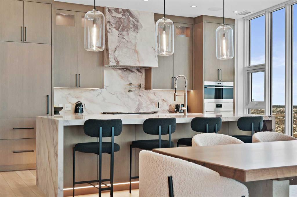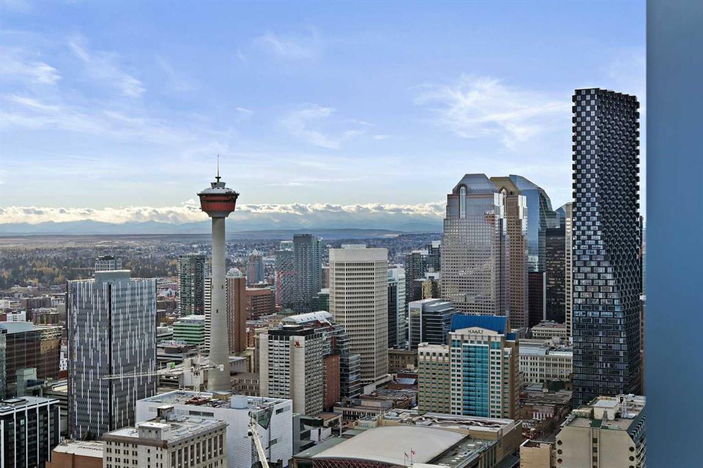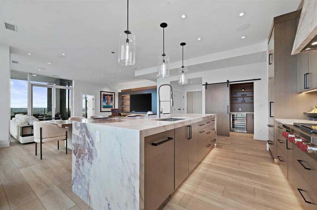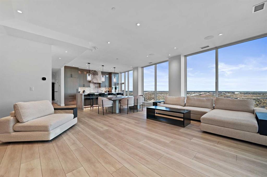 Perched high above the city on the 41st floor of The Arris West, this extraordinary 3-bedroom, 2-bathroom penthouse redefines modern luxury with over $400,000 in bespoke upgrades, world-class amenities, and cinematic, unobstructed views stretching from the majestic Rocky Mountains to the sparkling Bow River and the glowing lights of the Calgary Tower & Saddledome. This is more than a home—it's an elevated lifestyle experience. From the moment you step inside, the grandeur is unmistakable. Floor-to-ceiling windows wrap the expansive open-concept living area, immersing you in panoramic vistas that shift beautifully from sunrise to sunset. Wide 12" oak plank flooring, a Lutron wireless lighting system, integrated Sonos audio, smart thermostats, and power blinds set a refined tone of modern comfort and control. The culinary experience here is nothing short of exceptional. The chef-inspired kitchen showcases quartz waterfall countertops, upgraded fixtures including a premium kitchen faucet and pot filler, and a lineup of elite appliances: 36" Sub-Zero fridge/freezer, Wolf gas cooktop, wall oven and built-in microwave. A rare butler’s pantry—appointed with custom cabinetry, a wine fridge, and an additional built-in Miele coffee machine—elevates both function and sophistication. Host with ease around the oversized island or unwind beside the mesmerizing 80" water-vapour steam fireplace, with a 100" living-room TV creating a true theatre-like atmosphere. All bedrooms are generous in scale, enhanced with custom built-in closets, while the primary suite impresses with its spa-like ensuite featuring double sinks, vanity storage, and an oversized glass-enclosed shower. A well-designed foyer with front closets and full in-suite laundry completes the practical luxuries within. This penthouse also includes an exceedingly rare oversized heated underground double garage with EV charger, plus a large private storage room—a prized convenience in downtown living. Residents enjoy access to Club Arris, a jaw-dropping 25,000 sq. ft. amenity haven featuring a four-season indoor pool, hot tub, dry and steam saunas, an unrivaled fitness centre (spin, weight, yoga, and TRX zones), a lush indoor/outdoor dog park, video-conference rooms, elegant lounges, a party room, and spectacular outdoor terraces with fire pits, barbecues, and even outdoor chess. All of this rests above the new urban-format Real Canadian Superstore—everyday convenience at your doorstep. Sophisticated, smart, and spectacular, this penthouse at The Arris West is a rare offering for those who demand the finest in luxury, lifestyle, and limitless views. Welcome to the pinnacle of urban living!