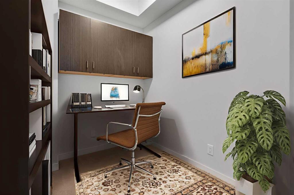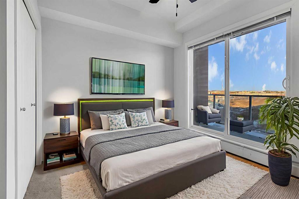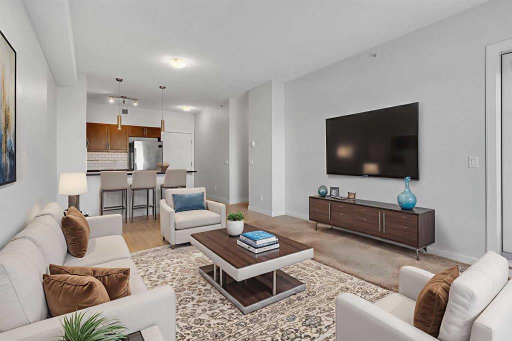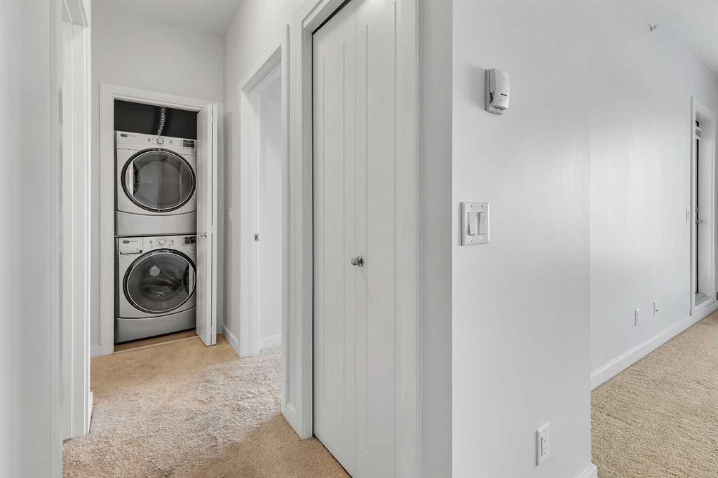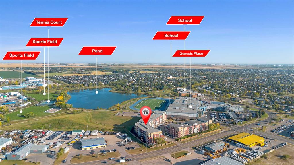 Top Floor Unit | Morning Sun | Private Balcony | 9’ Ceilings | Stainless Steel Appliances | Den/ Hobby/Storage Space | In-Suite Laundry | Titled Underground Parking **click on the virtual tour for a preliminary showing of the condo** Live life at the Edge! Freshly painted, top floor unit with morning sun reflecting off East Lake and bright spacious feeling 9’ ceilings. Easy to maintain flooring in Entry, Kitchen and Bathroom. Convenient in-suite Laundry, full-sized and stacked in a hall closet to maximize floor space for all the other things you would rather be doing than Laundry; like room to have your friends over in the open concept Kitchen, Dining and Living Room. The thoughtful floorplan provides for storage, Den space and privacy for your bedroom retreat that has its own access to the balcony. The Titled Underground Parking includes an open grid storage locker to keep the car stuff with the car stuff. Walking and biking paths are nearby, and all the amenities of Airdrie East Lake Recreation and Genesis Place are across the street. Who knew life on the edge could be comfortable and convenient. Call your favourite Agent to book your private showing today!