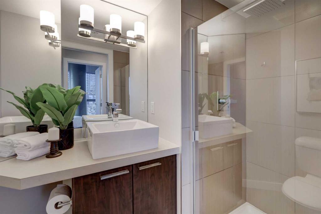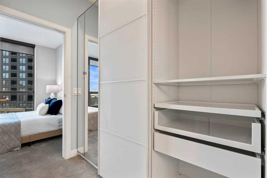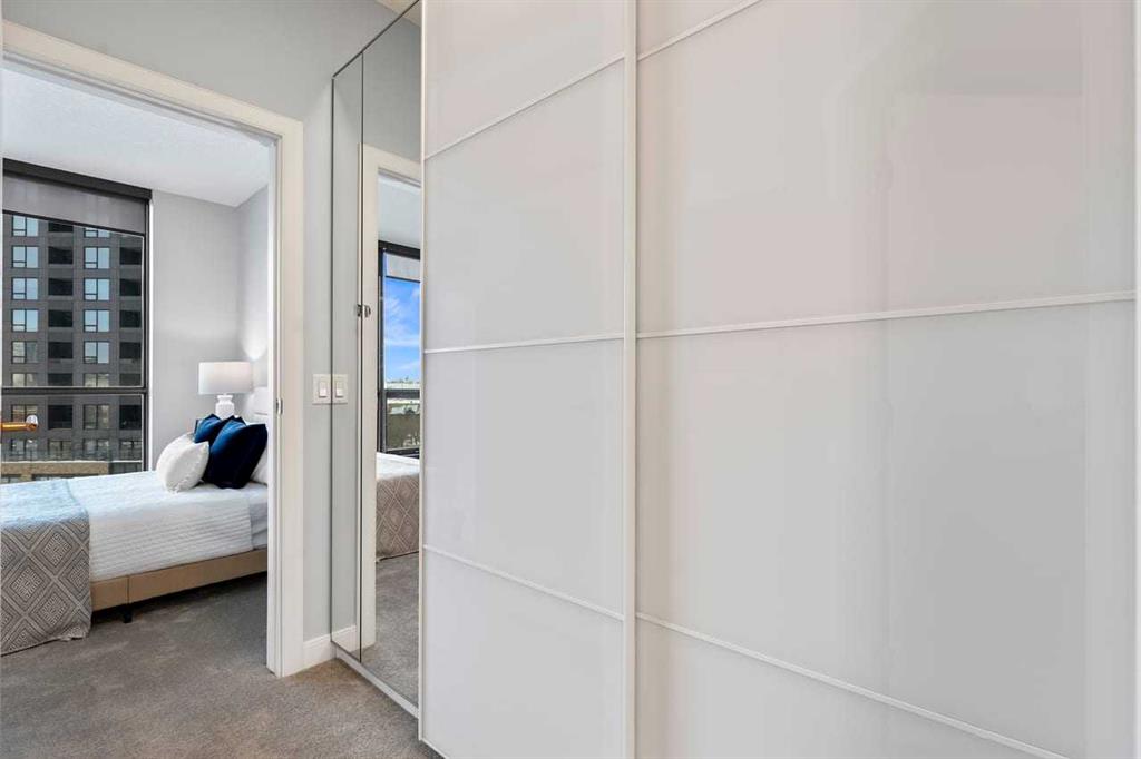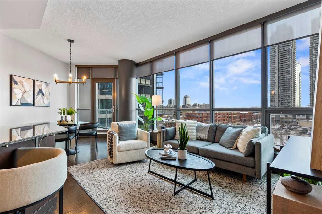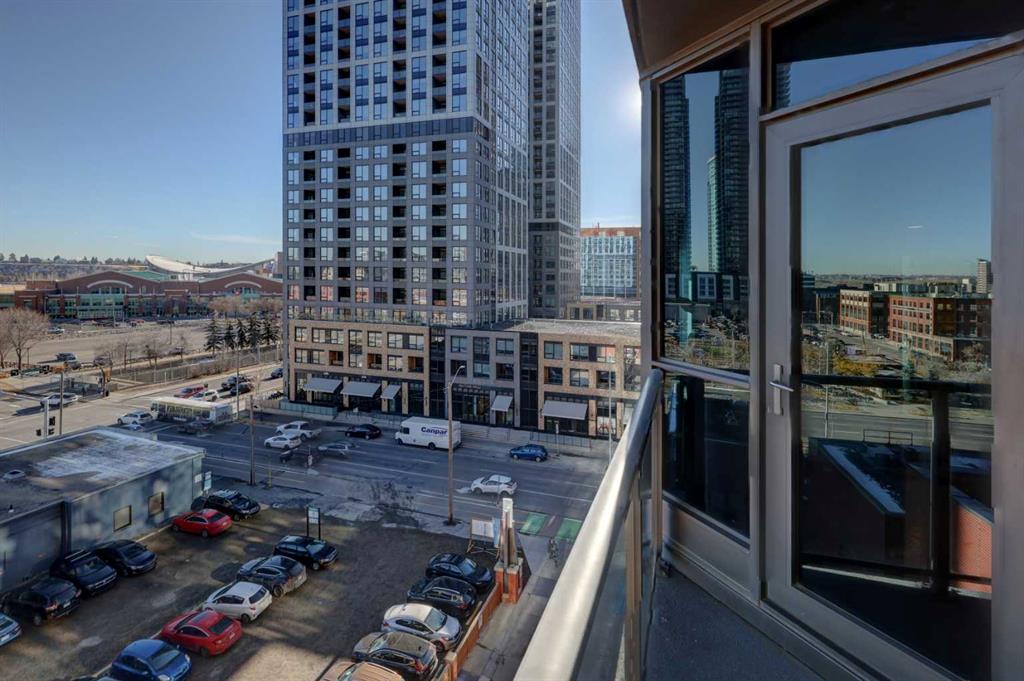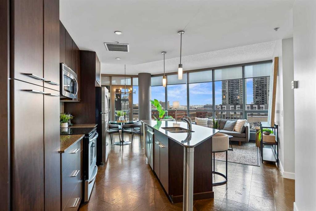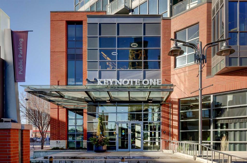 This upgraded 2-bedroom, 2-bathroom corner condo in the Keynote 1 building is move-in ready and waiting for you to call home. The open-concept layout connects the kitchen, dining area, and living room, with a prime east-facing view that creates an inviting space and an ideal place to entertain. It has been meticulously prepared for the new owner with freshly painted throughout (walls, doors, baseboard, trim, kitchen bulkhead), new plush carpet/underlay in the bedrooms, dishwasher (2023), washer and dryer (2025), three-panel organizer in the walkthrough closet in the primary bedroom, light fixtures, and professionally cleaned. Other key features include floor-to-ceiling windows for maximum natural light and a front-row view of the Stampede fireworks, stainless steel appliances, granite countertops, central air conditioning in the main living area, a no-pet home, titled heated underground parking, titled storage locker, and concrete construction for superior sound-dampening and durability. Living at Keynote 1, you’ll have an on-site manager, access to the fully equipped fitness facilities (weights and cardio room), two guest suites, owner’s lounge with TVs, pool table, partial kitchen, BBQs, outdoor patio, plus 15 rooftop oasis, bike storage, plus direct access to Sunterra Market. Keynote 1 offers high-quality living, affordability, and an ultra-convenient location to downtown, local lifestyle amenities, the Stampede Ctrain station, the Plus 15 Skywalk system, and easy access to main thoroughfares for city-wide access.