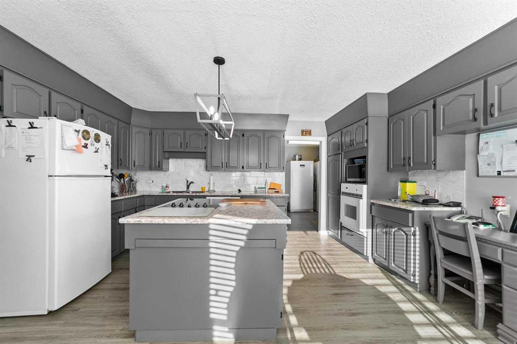 You will want to stop and take a closer look at this beautifully maintained home. Over the past couple of years, it has been thoughtfully updated with new siding, windows, bathrooms, fresh paint, upgraded flooring, and a spacious new deck. The generous back entry welcomes you inside from the low maintenance covered deck, creating a warm and inviting first impression. As you round the corner, the home opens into a bright kitchen and dining area filled with natural light. The kitchen features a large island complete with a convenient pullout counter that creates an ideal spot for a cozy breakfast nook. From here, step into the second dining area and the main living room, a comfortable and open space perfect for gatherings or quiet evenings at home. The main floor includes two well sized bedrooms and a beautifully updated four piece bathroom. Downstairs, you will find a roomy family area that offers an excellent place for relaxation or entertainment, along with an additional bedroom, a functional three piece bathroom, and an impressive amount of storage. Outside, the property provides plenty of room for a garden or outdoor projects. There are four storage sheds to accommodate all your tools and equipment, as well as a single detached garage for additional convenience. This home offers a wonderful blend of comfort, updates, and usable space both inside and out.