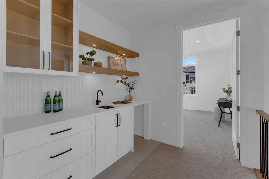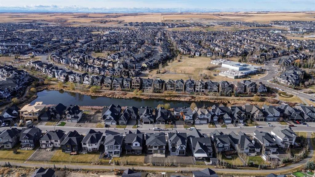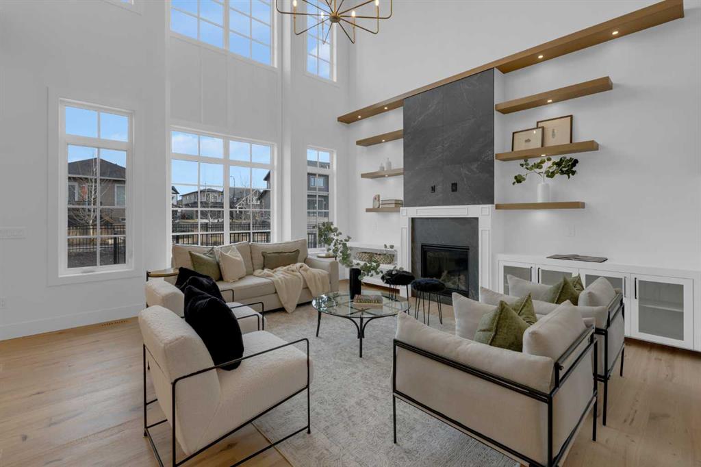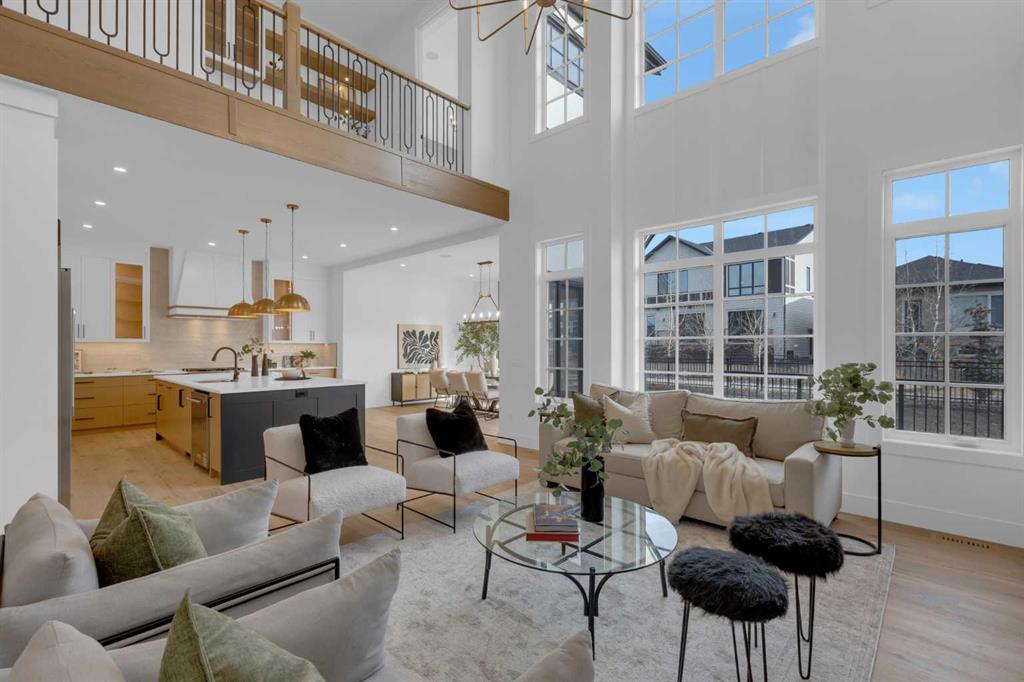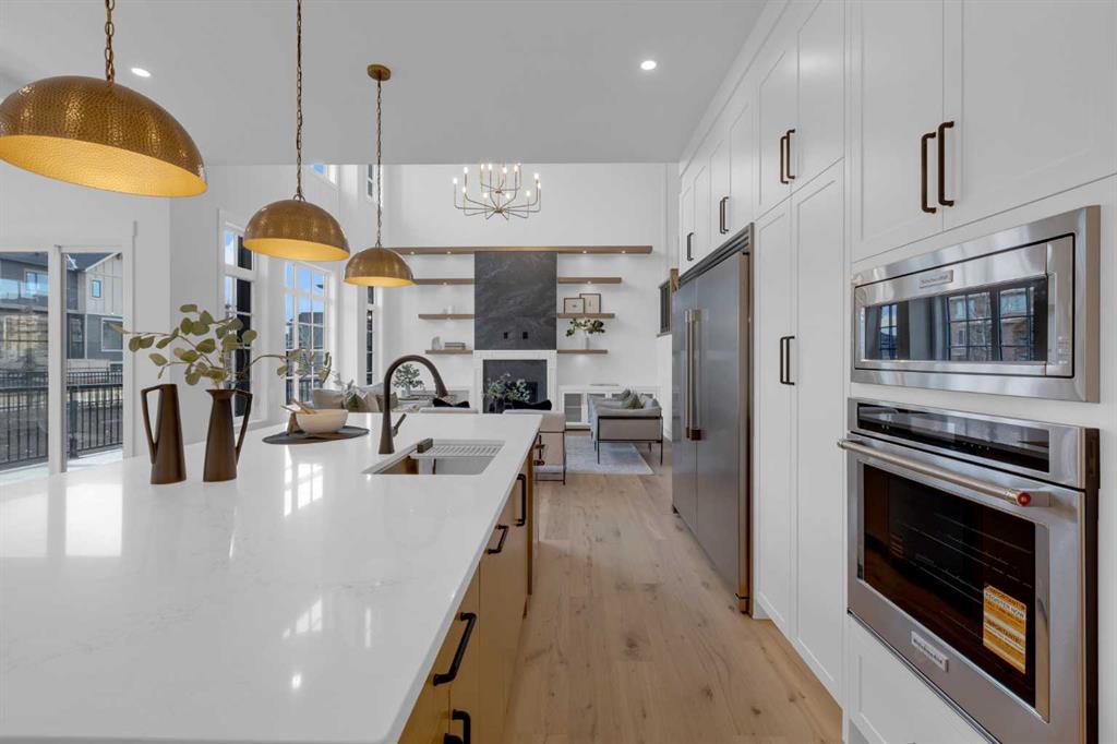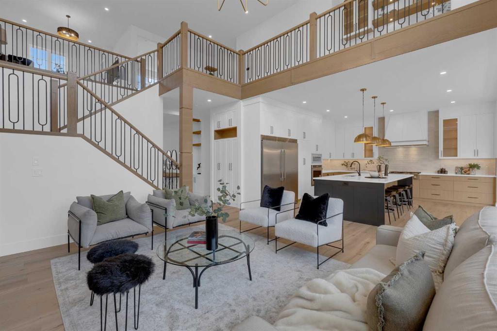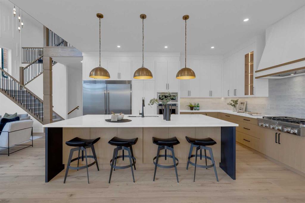 Welcome to this stunning home located in the highly sought-after community of Coopers Crossing! Boasting excellent curb appeal and backing onto a beautiful green space, this home is ideally situated close to schools, shopping, and major roadways. The main floor features 10' ceilings and engineered hardwood throughout, creating a bright and upscale feel. You will find a private front office, a spacious family room with built-in shelving, a cozy fireplace, and an impressive open-to-above design. An elegant dining area that opens onto a large deck with a BBQ gas line—perfect for entertaining. The chef’s kitchen is truly a dream, offering built-in appliances, a large island, quartz countertops, and plenty of cabinetry. A convenient mudroom off the garage and a stylish powder room complete this level. Upstairs, you are welcomed by a spacious bonus room, two secondary bedrooms with built-in shelving, a shared bathroom, and a thoughtfully located upstairs laundry room. A standout feature of this home is the built-in desk space and wet coffee bar in the common area on the second floor—a rare and highly desirable find that adds both character and convenience. The luxurious primary suite showcases a tray ceiling, a spa-inspired ensuite with dual vanities, a standalone tub, a steam shower, and a generous walk-in closet. The fully finished basement provides even more living space, featuring a wet bar, a large recreation room, and an additional flex area that is perfect for a fitness space or games area. You will also find a large bedroom and a full bathroom. Elegant lighting, beautiful woodwork, and large windows throughout the home create a warm, inviting atmosphere and flood the space with natural light. There are also plenty of closets and storage spaces thoughtfully placed throughout the house for added convenience. The oversized triple tandem garage is insulated, finished to paint grade with textured ceiling, and features high ceilings designed to accommodate a car lift, offering plenty of room for vehicles and storage. This remarkable home is truly a must-see!