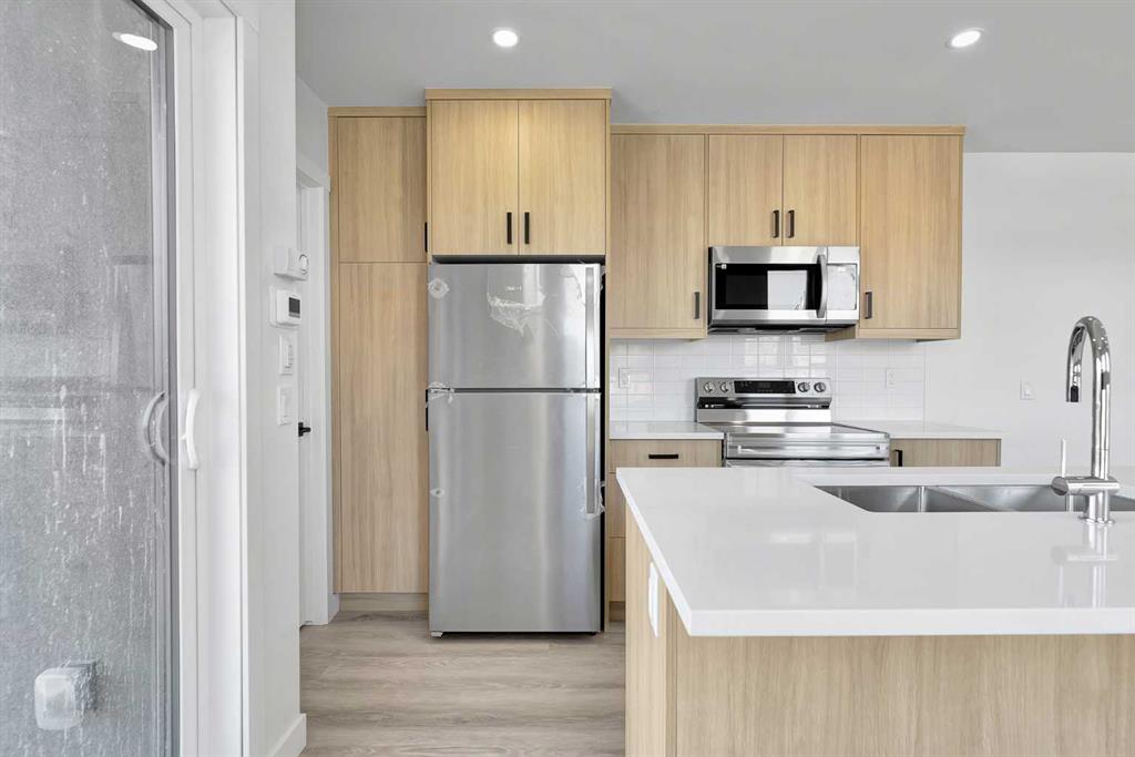Brand New Modern Living in the Heart of Montgomery! Experience a sophisticated lifestyle in this pristine, move-in-ready unit. A bright and welcoming foyer greets you with direct access to the single-car garage and a convenient utility room. Follow the stylish vinyl plank flooring up to the main living area, where three expansive picture windows flood the space with natural light. The open-concept layout is anchored by a chef-inspired kitchen featuring floor-to-ceiling cabinetry, gleaming quartz countertops, premium stainless steel appliances, and a central island with seating for three. Step out onto your private deck—the ideal spot for morning coffee or unwinding in the evening. The upper level offers a cozy retreat with plush carpeting and two generously sized bedrooms, both equipped with built-in closet organizers and served by a sleek 3-piece bathroom. Located in a sought-after community, you are steps from local shops and moments from the active lifestyle offered by Shouldice Park and the Bow River pathways. With quick access to the Trans-Canada and Stoney Trail, this home offers the perfect blend of modern luxury and exceptional convenience. The building is protected by a full New Home Warranty, offering: 2 Years for Labour and Materials, 2 Years for Delivery and Distribution Systems, 5 Years for Building Envelope Protection, and 10 Years for Major Structural Components. A secure, high-yield asset in a prime location!
