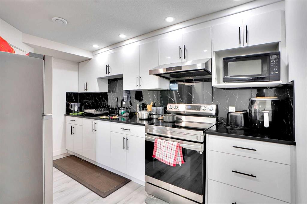 A Rare Opportunity on One of Redstone’s Largest Pie-Shaped Lots! This fully renovated detached home offers over 2,450 SQFT. of thoughtfully designed living space, with a front-attached garage, rear street access, ample street parking, and City-approved commercial parking—ideal for home-based businesses or extra vehicles. Inside, you’re welcomed by a spacious foyer, a custom feature wall, home office, and mudroom. The main kitchen boasts granite countertops, high-end finishes, and opens to a large living room with a gas fireplace and feature wall. A separate spice kitchen with its own pantry adds convenience. Upstairs, enjoy a bright bonus room, a luxurious primary suite with a 5-piece ensuite and custom walk-in closet, plus three additional bedrooms, a full bath with standing shower, and upstairs laundry. The fully finished basement suite (illegal) with separate side entrance includes two generous bedrooms, a modern kitchen with pantry, a full bathroom, and stacked laundry. Set on one of the largest lots in the community with unique dual access and commercial-use potential, this home is truly a rare opportunity in Redstone. Don’t miss your chance to own this exceptional property!