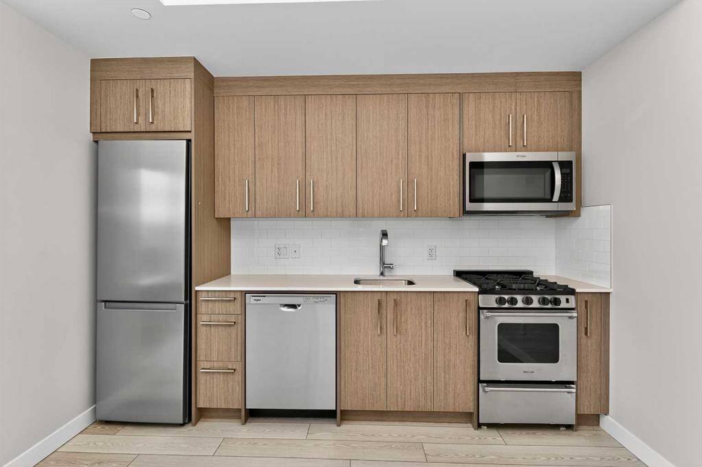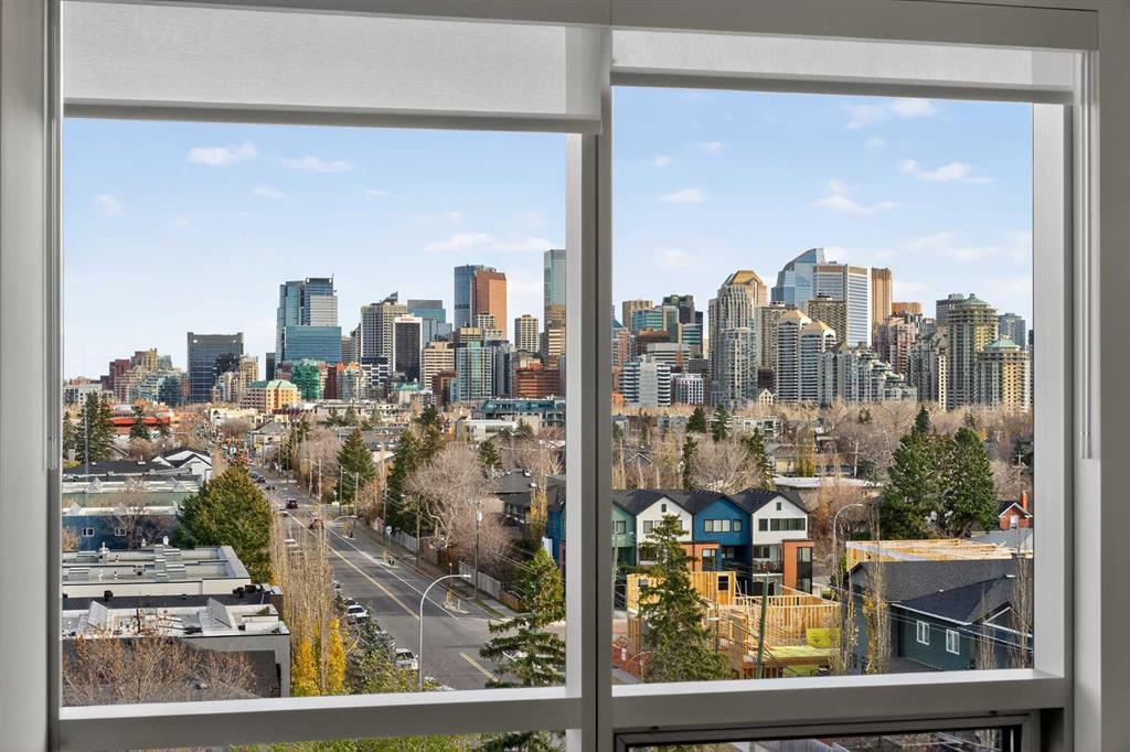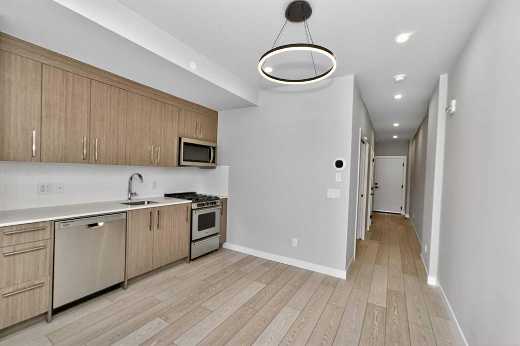 Welcome to Frontier by Truman Homes – an exclusive concrete-built residence ideally situated in West Hillhurst, just steps from the vibrant Kensington district, one of Calgary’s most desirable and walkable inner-city neighborhoods. This brand-new 1-bedroom, 1-bathroom corner suite on the 5th floor offers 396.sq. ft. of thoughtfully designed living space enhanced by floor-to-ceiling windows that fill the home with natural light. The open-concept layout showcases luxury vinyl plank flooring throughout, a spacious living and dining area, and a modern kitchen equipped with quartz countertops, stainless steel appliances, and a gas cooktop. The bright primary bedroom features expansive windows and generous closet space, while the contemporary 4-piece bathroom includes a quartz vanity and in-suite laundry for added convenience. Residents of Frontier enjoy premium amenities such as a state-of-the-art fitness center, co-working lounge, and a beautifully landscaped second-floor terrace. The building also offers titled underground heated parking and on-site retail, including Fresco, C+C Coffee, Crave Cupcakes, Metro Liquor, and more. With boutique shops, cafés, award-winning restaurants, and scenic Bow River pathways just steps away — plus quick access to Downtown Calgary and the LRT — this home perfectly blends comfort, convenience, and connectivity. Combining upscale finishes, intelligent design, and a prime corner location, this stunning unit is an outstanding opportunity for both homeowners and investors alike.