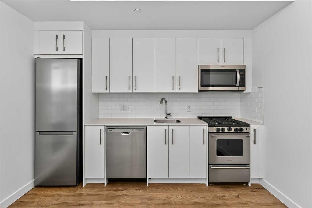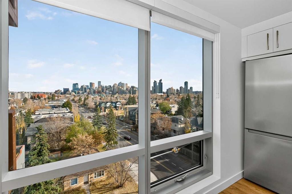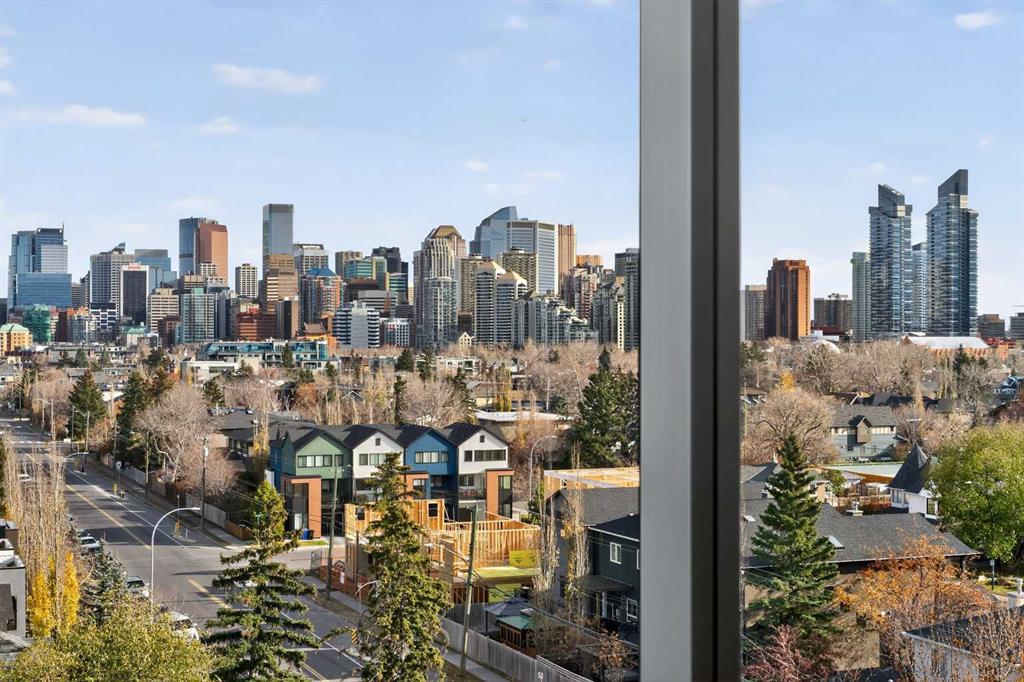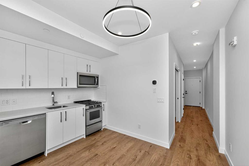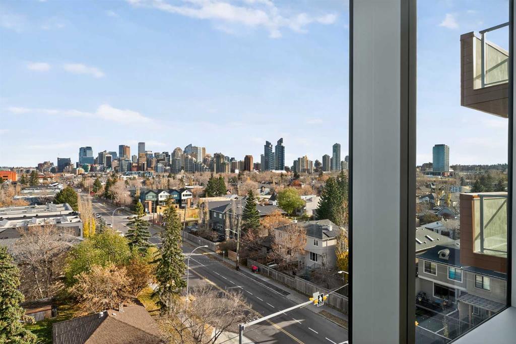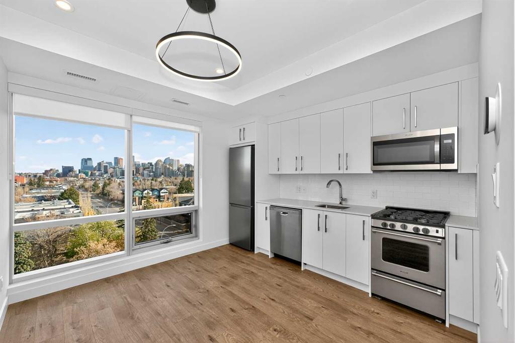 Welcome to Frontier by Truman Homes – an exclusive concrete-built residence ideally situated in West Hillhurst, just steps from the vibrant Kensington district, one of Calgary’s most desirable and walkable inner-city neighborhoods. This brand-new 1-bedroom, 1-bathroom corner suite on the 6th floor offers 393.79.sq. ft. of thoughtfully designed living space enhanced by floor-to-ceiling windows that fill the home with natural light. The open-concept layout showcases luxury vinyl plank flooring throughout, a spacious living and dining area, and a modern kitchen equipped with quartz countertops, stainless steel appliances, and a gas cooktop. The bright primary bedroom features expansive windows and generous closet space, while the contemporary 4-piece bathroom includes a quartz vanity and in-suite laundry for added convenience. Residents of Frontier enjoy premium amenities such as a state-of-the-art fitness center, co-working lounge, and a beautifully landscaped second-floor terrace. The building also offers titled underground heated parking and on-site retail, including Fresco, C+C Coffee, Crave Cupcakes, Metro Liquor, and more. With boutique shops, cafés, award-winning restaurants, and scenic Bow River pathways just steps away — plus quick access to Downtown Calgary and the LRT — this home perfectly blends comfort, convenience, and connectivity. Combining upscale finishes, intelligent design, and a prime corner location, this stunning unit is an outstanding opportunity for both homeowners and investors alike.