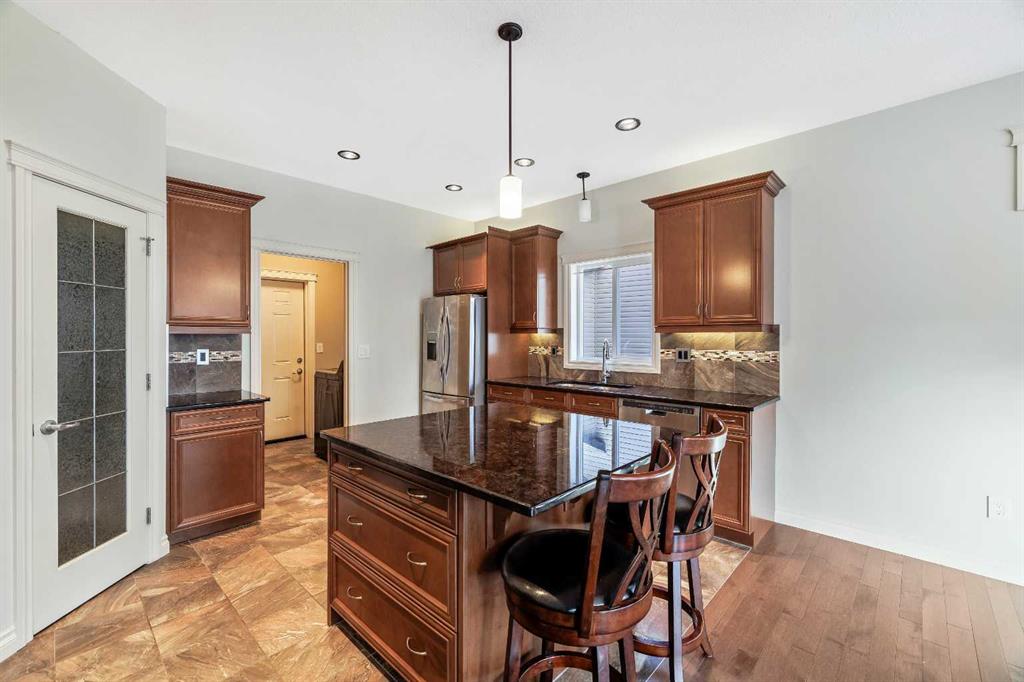 PRICE REDUCED- Step in to this warm and welcoming raised bungalow featuring an open concept main floor designed for modern living' spacious living room showcases a stunning stone faced natural gas fireplace and gleaming hardwood flooring , flowing in to a large kitchen complete with granite countertops abundant cabinetry including pot drawers, walk in pantry, and an island perfect for gathering. The adjacent dining area easily accommodates a large family table. Garden doors lead to an east facing deck, professionally landscaped and fenced backyard-ideal for entertaining or relaxing outdoors. The primary bedroom is generously sized for a king bed and offers a walk in closet and a 3 piece ensuite with large walk in shower. A second west facing bedroom , 4 piece guest bathroom , main floor laundry with direct access to the garage complete the main level. The fully developed lower level provides an expansive family and games area. Bright comfortable, and made extra cozy thanks to the in floor heating system. Two additional bedrooms (one with a walk in closet) and 3 piece bath offers plenty of space for family or guests. Loads of storage under the steps and in the mechanical room. Car enthusiasts or hobbyists will love the oversized insulated double car garage with in floor heat and high ceilings plus hot and cold water taps. Outside enjoy the front deck the perfect spot to enjoy an Alberta sunset. Additional features on this home include central air conditioning, permanent outdoor lighting along the eaves, (that can be controlled with your smart phone, new (2025) on demand hot water and gas outlet on back deck for your BBQ. This home is move in ready. Book your showing today.