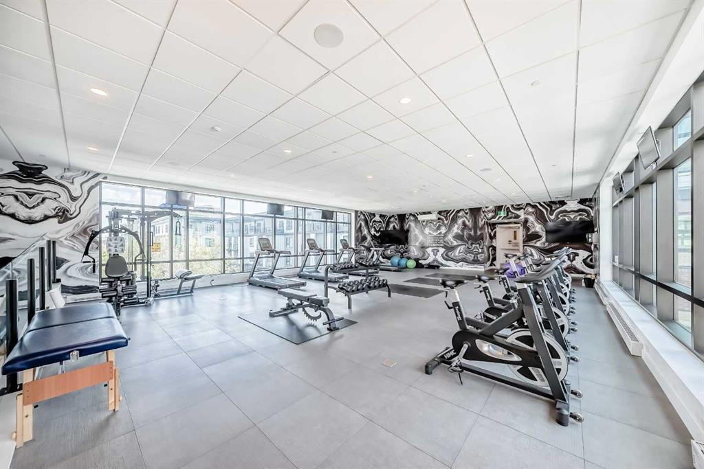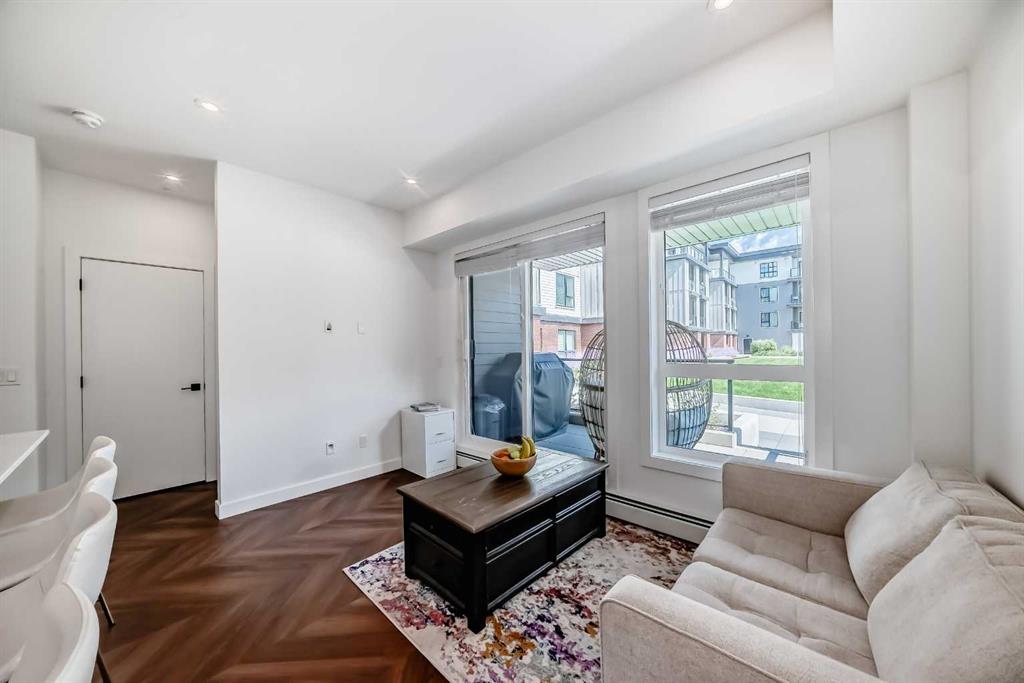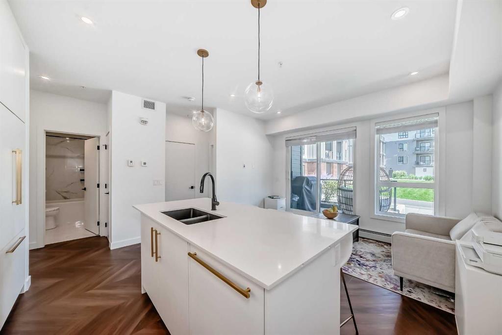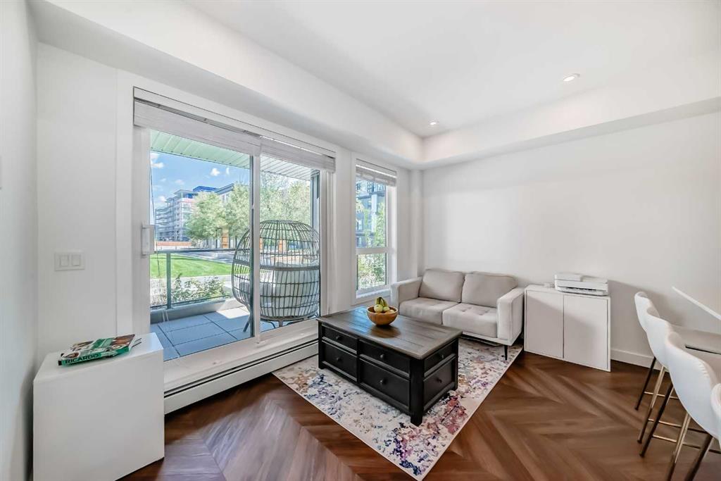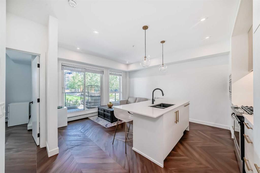Welcome to the "Esquire" in Calgary’s vibrant University District, just steps from U of C, Market Mall, Foothills Hospital, and C-Train access. This stylish "like new" one-bedroom condo offers both modern finishes and unbeatable convenience, perfect for students, professionals, or downsizers alike. Inside, you’ll find a bright open layout with a pearl-white palette, Quartz counters, soft-close cabinetry, luxury vinyl plank flooring, and in-suite laundry. The kitchen is thoughtfully designed with a roomy island, upgraded appliances including a gas stove, garburator, Silgranit sink, and elegant fixtures. The primary bedroom includes a walk-in closet, while the living room opens directly onto your private patio—complete with a gas BBQ hookup. Being on the main floor makes it ideal for pet owners, offering both comfort and easy outdoor access. As an end unit, you’ll enjoy extra privacy and a quiet setting, enhancing the home’s peaceful feel. The Esquire also includes a wealth of amenities: heated underground parking, storage locker, bike storage, fitness center, pet spa, and even a bike workshop. This is a fantastic opportunity to live in one of Calgary’s most sought-after, walkable communities with shopping, dining, parks, and pathways right at your doorstep.