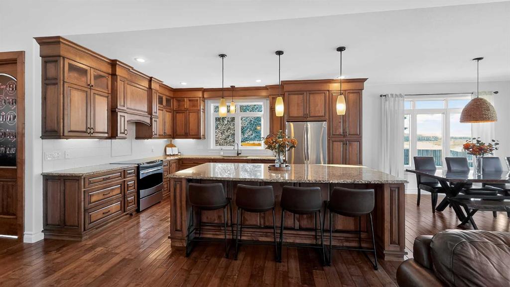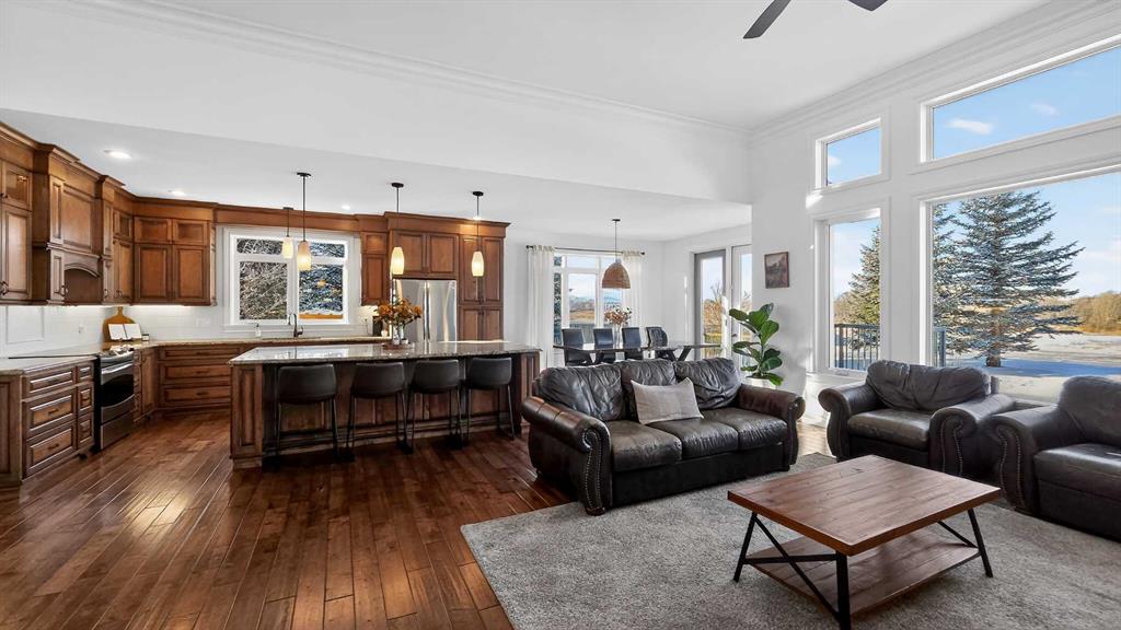 Experience serene and luxurious living in Fort Macleod, where prime location is unmatched. Situated directly across from the GOLF COURSE and backing onto the OLDMAN RIVER. Enjoy a tranquil morning retreat with the soothing sounds of the river, followed by a relaxing 9-hole round of golf. Fort Macleod is a charming small-town community with a strong sense of connection, providing all essential amenities including grocery stores, banks, restaurants, schools, a library, and a recreation center. This prestigious 1,831 sq. ft. home is set on JUST UNDER AN ACRE of beautifully maintained land. The yard features UNDERGROUND SPRINKLERS with 3 zones and a robotic lawn mower for easy upkeep. This yard is a true oasis complete with a spacious back deck, outdoor kitchen, mature trees, garden boxes, and a children's playground, along with private access to the Oldman River. Do you enjoy fishing? Imagine fishing right from the edge of your property. A PAVED DRIVEWAY leads up to the expansive TRIPLE CAR GARAGE! It is fully finished, including pot light lighting and a coat locker. The garage doors are high end power coated Canyon Ridge doors. Inside, this home boasts 4 BEDROOMS, plus a sizable office, and 2.5 BATHROOMS, all filled with natural light from the triple-pane windows. Enter through the impressive 3-inch thick solid wood front door, and notice the exceptional attention to detail throughout. The main floor features stunning wide plank walnut HARDWOOD flooring, with a generously sized office off the foyer that offers a view of the golf course. The large living room, characterized by 13 ft. ceilings and a striking stone fireplace, provides a warm and inviting atmosphere. The kitchen is a chef's dream, featuring solid wood walnut cabinetry, a GRANITE countertop, bar stool seating, and stainless steel appliances. The adjoining dining room is perfect for large gatherings and opens up to the back deck. Also on the main floor, you'll find a convenient half bathroom, a cloakroom, as well as access to the garage and a well-equipped laundry room with a front-load washer and dryer, sink, and ample storage. Now, onto the master bedroom – a true sanctuary to retreat to after a long day. It features access to a private covered deck overlooking the river and a cozy stone fireplace for those chilly evenings. The Ensuite is elegantly designed with double sinks, a spacious tub, a walk-in shower, a makeup vanity, and access to a potential hot tub and swim spa. The spacious walk-in closet completes this well thought out bedroom. The basement offers an additional 1,732 sq. ft. of living space, featuring three spacious bedrooms and a large family room equipped with a fireplace and room to accommodate a pool table. You'll also find a wet bar complete with a fridge, making it an ideal spot to host friends. The full bathroom includes double sinks and a separate area for the shower and toilet. CALL YOUR AGENT AND UPGRADE YOUR LIVING EXPERIENCE TODAY!