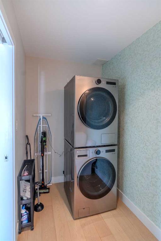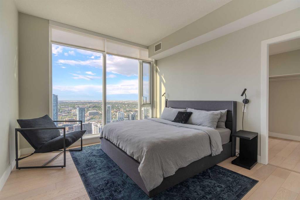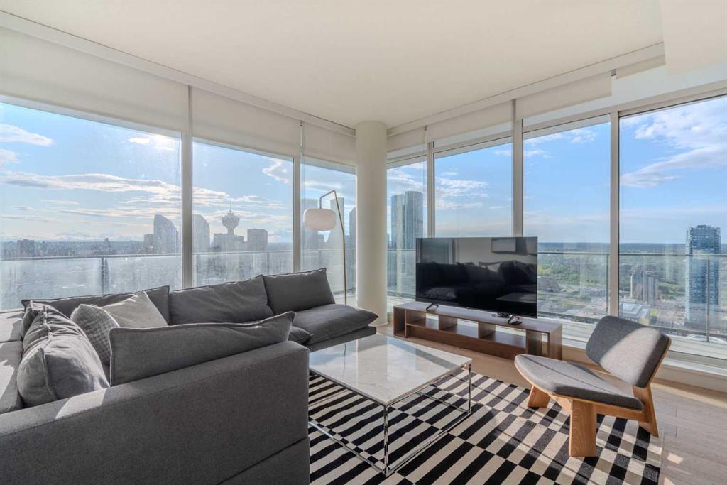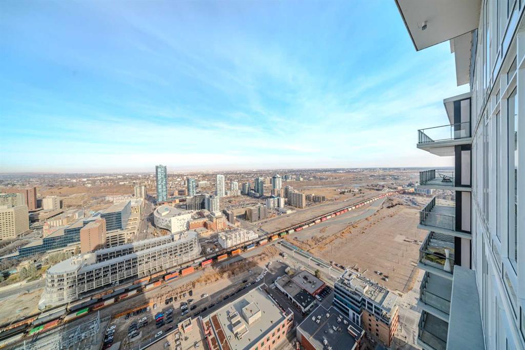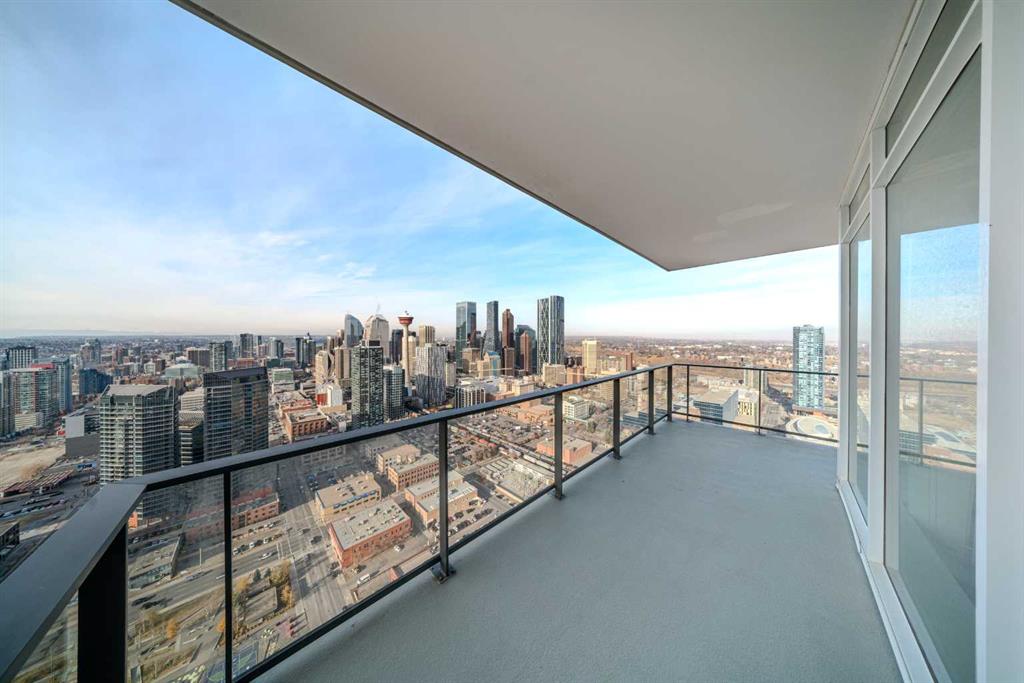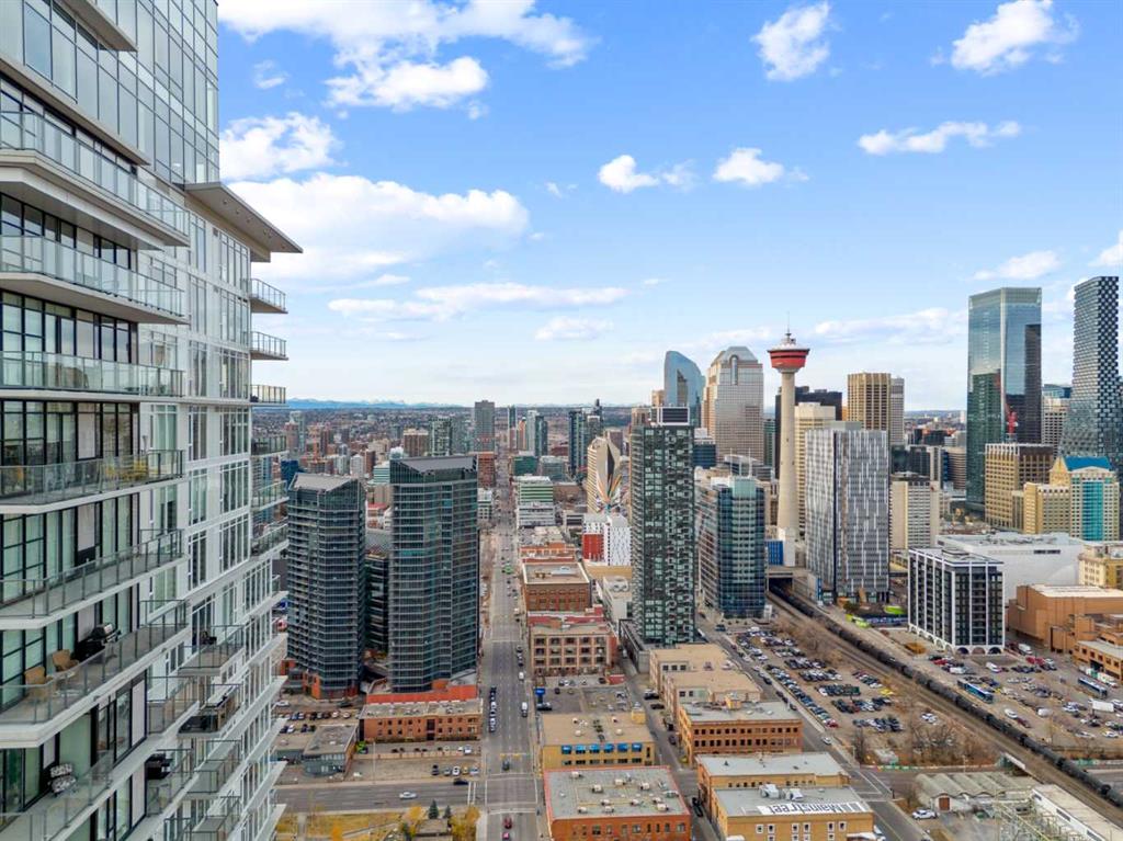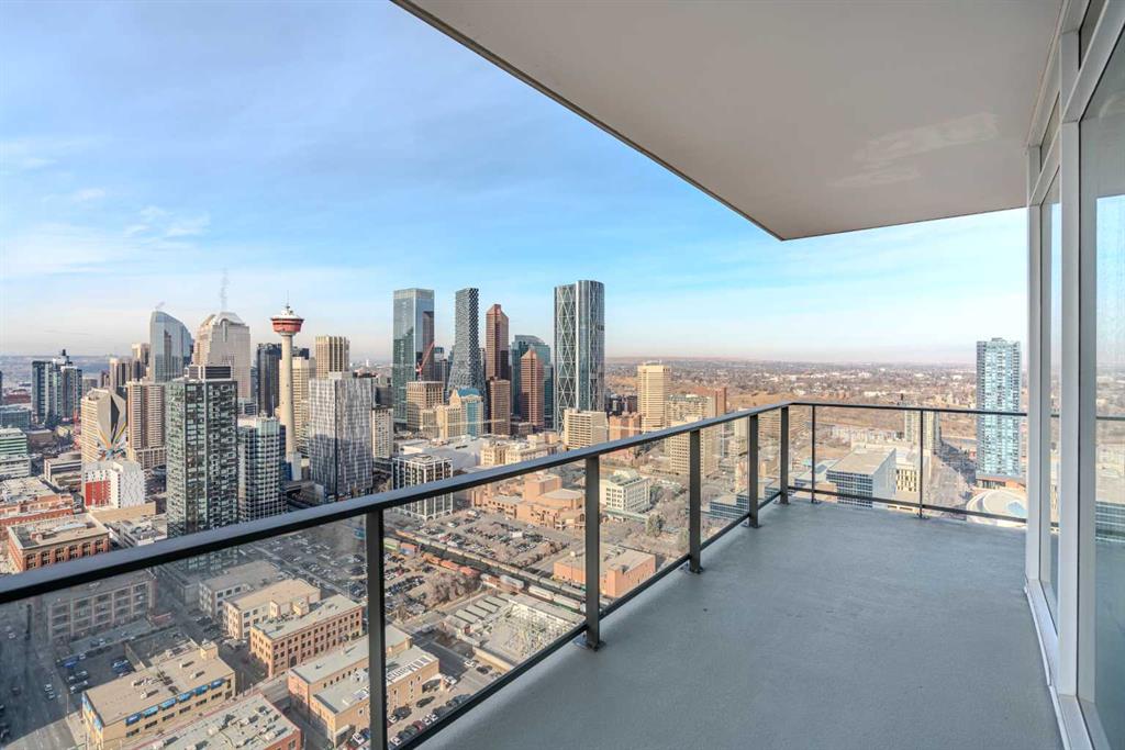 Welcome to The Guardian, Calgary’s prestigious and tallest residential tower. This remarkable, triple-mint condition 40th-floor residence offers an exclusive opportunity to experience luxury living high above the city. Featuring 1,739sq.ft., 2 bedrooms + den, 2.5 bathrooms, and soaring 9’6” ceilings, this sub-penthouse home showcases exceptional quality and design. Enjoy unobstructed, panoramic views of both the downtown skyline and the majestic Rocky Mountains through floor-to-ceiling windows that flood the home with natural light. The north-west exposure is completely un-obstructed corner to corner, ensuring privacy and an incredible backdrop to every room. A expansive wraparound balcony comes complete with natural gas connection. The sleek, modern kitchen is equipped with Miele appliances and premium Armony Cucine cabinetry from Italy, complete with a sophisticated silent-close system found throughout the kitchen and both ensuites. The versatile den offers the perfect space for a home office or additional living area. Each ensuite is beautifully appointed with travertine tile, a rain shower, hand-shower bar, and a soaker tub for ultimate relaxation. The Guardian’s premium amenities elevate your lifestyle: a state-of-the-art fitness centre and workshop on the 6th floor, plus an expansive social lounge on the 7th floor that opens to a large outdoor terrace. Additional titled underground parking stalls are also available for purchase. Convenience is unmatched with ZCREW Café on the main level and the nearby community space featuring sport courts, an off-leash dog park, and EV charging stations. You’re just steps from dining, entertainment, bike paths, the Stampede grounds, and the upcoming new event centre—placing you at the centre of it all. Be sure to explore the virtual tour to fully appreciate the craftsmanship and breathtaking views. Book your private showing today and experience the luxury and elegance of this remarkable unit.