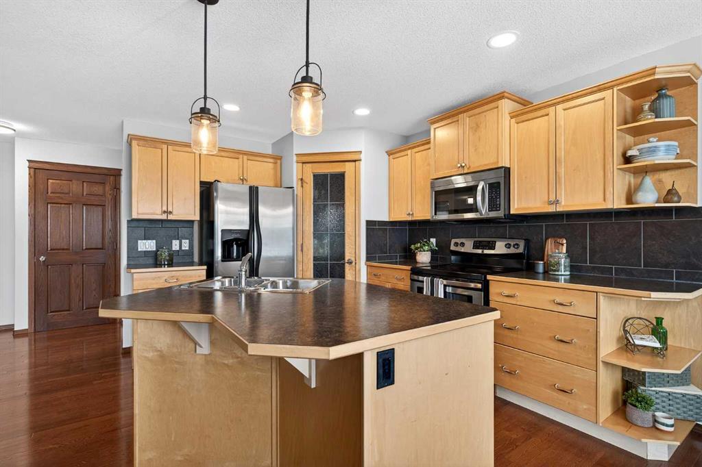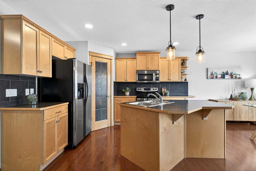 Welcome to this spacious two-storey family home in the highly sought-after Sagewood community. This property presents a rare blend of comfort and versatility, featuring a total of 4 bedrooms and 3.5 bathrooms. Recently refreshed with modern lighting fixtures and new blinds throughout, the home radiates a bright, appealing atmosphere. The main floor boasts an open-concept living area with a cozy gas fireplace, perfectly flowing into the dining room where you can step out onto a spacious balcony offering serene, direct views of the canal—your perfect spot for morning coffee or evening entertaining. Upstairs, the separation provided by the central staircase leads to a bright bonus room with vaulted ceilings, ideal for a media room or home office. The primary suite is a true retreat, featuring exceptional canal views, a walk-in closet, and a 4-piece ensuite with an extra-deep soaker tub. Adding significant value and flexibility, the illegal basement suite offers separate access, laundry, a bedroom, and a kitchenette, making it ideal for multi-generational living or rental income. The expansive backyard is a private oasis with green space, gardens, and an entertainment area, all while providing direct access to the tranquil canal walking paths. Don't miss the opportunity to own this Sagewood gem!