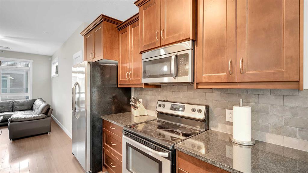 Welcome to Your New Home in Skyview Ranch – Where Comfort Meets Convenience. Nestled in the family-friendly community of Skyview Ranch, this upgraded corner unit isn’t just a house; it’s a lifestyle choice! Think of it as the Swiss Army knife of living spaces—versatile, stylish, and sure to impress your in-laws. Step inside to a tastefully decorated open-concept layout on the second floor, filled with natural light and laminate flooring that keeps your family game nights from turning into slip-and-slide competitions. Cozy up to the natural gas fireplace, surrounded by built-in shelving for your collection of questionable figurines. The kitchen is a culinary dream! With stainless steel appliances, a microwave hood fan, and an oversized breakfast bar, you’ll be whipping up gourmet meals that even Gordon Ramsay would admire. And for the grill masters, the large south-facing deck, overlooking the playground, is your new BBQ paradise with a natural gas hookup. On the third floor, the master bedroom is a serene sanctuary with a 5-piece ensuite and his and her closets (because sharing isn’t always caring). Plus, there’s a convenient laundry room to avoid those dreaded laundry-hauling trips. With a second bedroom, an office space, and a 2-piece bathroom, this unit truly has it all! Skyview Ranch Gardens is close to major highways and within walking distance to transit, cafes, restaurants, parks, schools, and shopping. Why wait? Embrace the chance to call this charming corner unit your home, where comfort meets convenience, and laughter is always welcome!