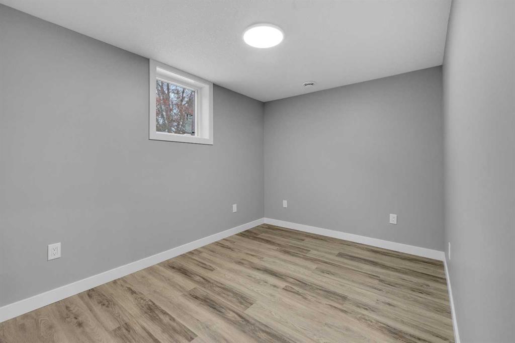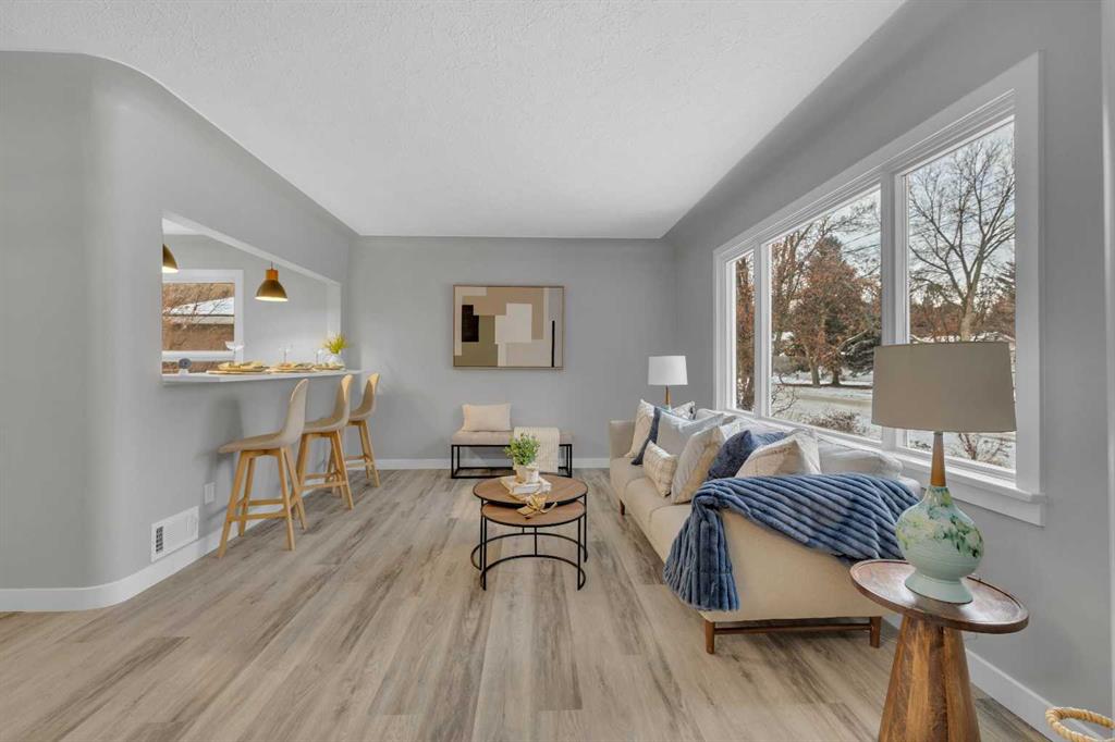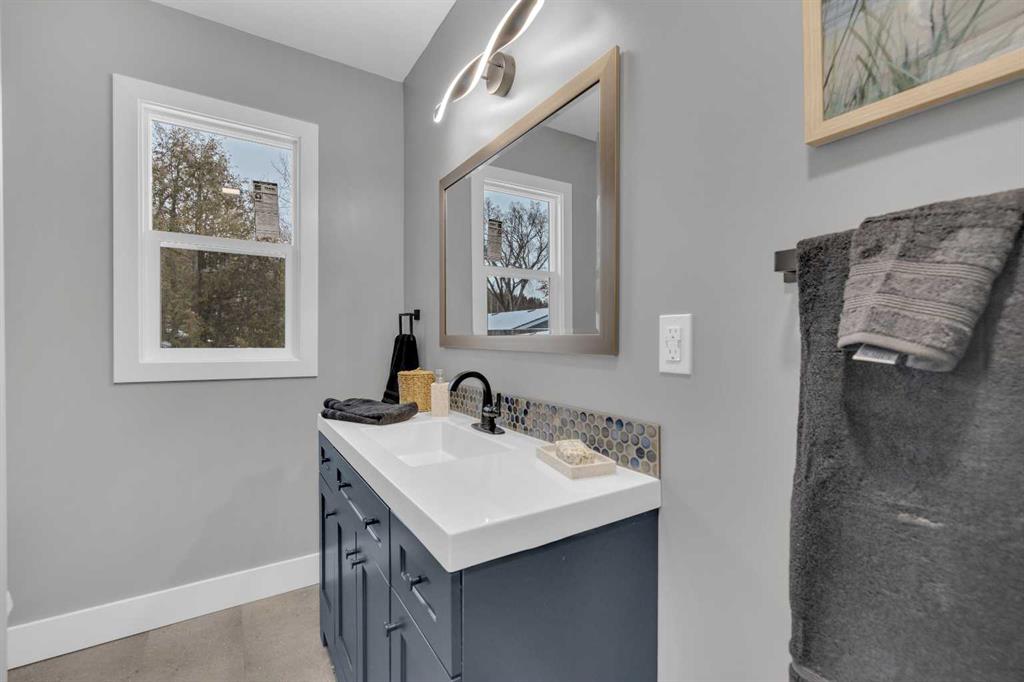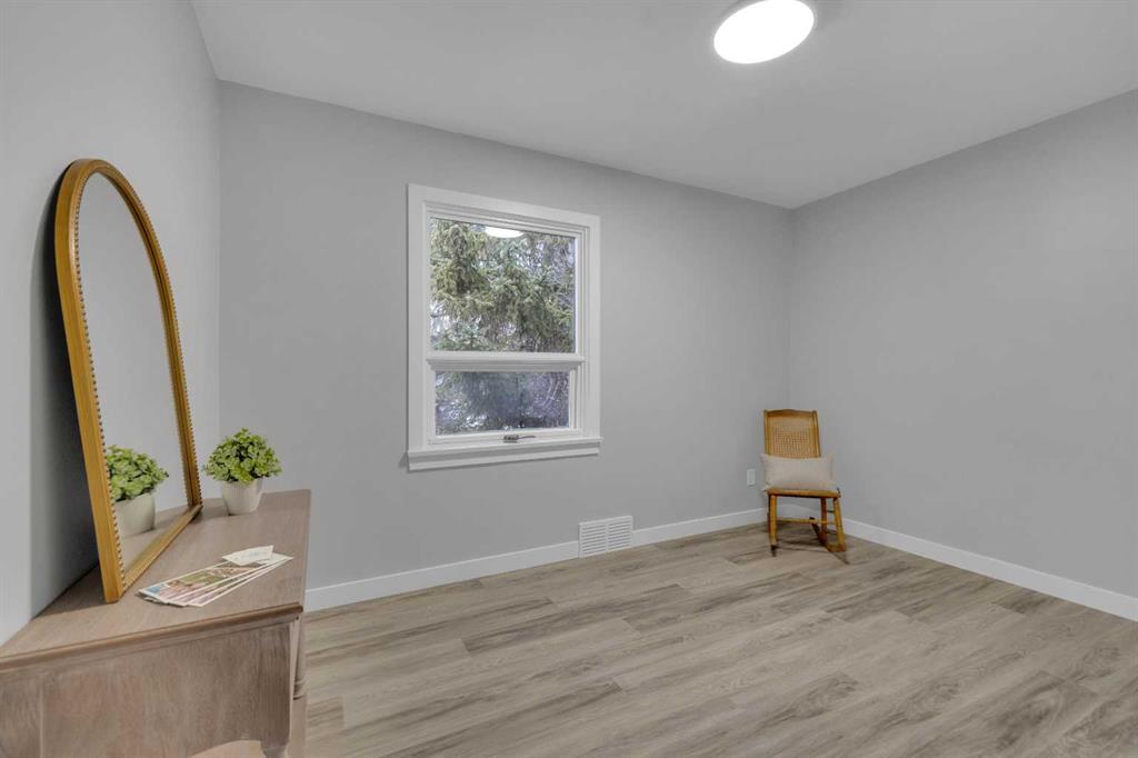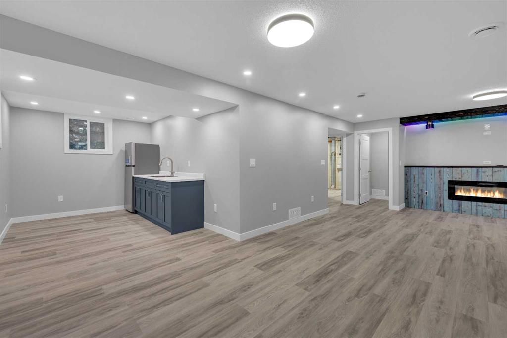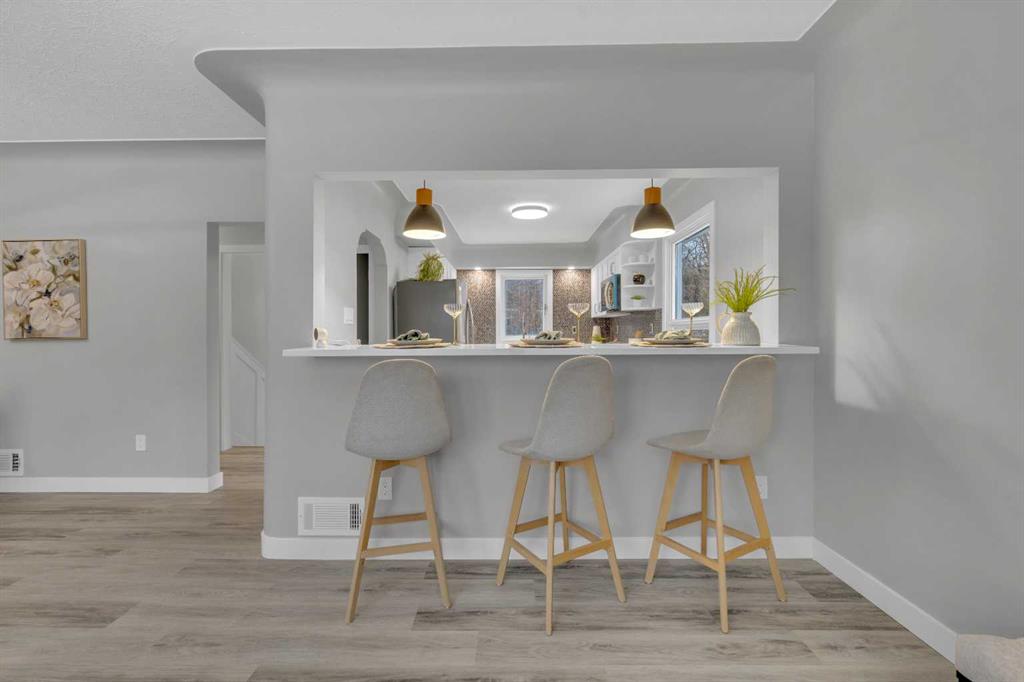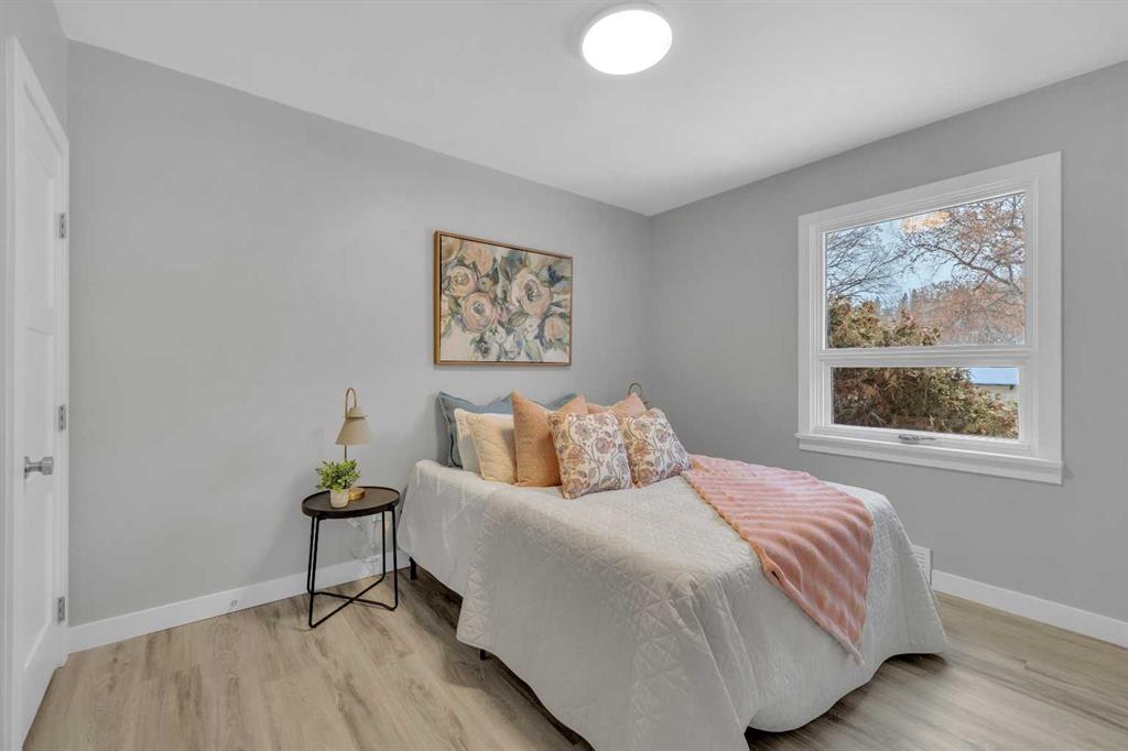 Beautifully updated from top to bottom, this reimagined Woodlea bungalow blends modern style with timeless charm in one of Red Deer’s most sought-after neighbourhoods. Located on a quiet, tree-lined street and backing directly onto Woodlea Park, this home offers unbeatable lifestyle, privacy, and green space access. The main floor features new vinyl plank flooring and a brand-new kitchen with quartz countertops, sleek cabinetry, upgraded lighting, and brand new appliances. The kitchen has been opened into the living space and features a large quartz eating bar while maintaining the 1950s curved corners and ceilings; maintaining its charm and heritage. Large windows fill the space with natural light, complementing two spacious bedrooms and a fully updated bathroom. The lower level has been gutted back to studs and renovated with new insulation, drywall, new egress windows, a stylish wet bar with large fridge, generous family room with 1500 watt electric fireplace with LIFX app controlled colorful lighting, custom mantle/fireplace wall. The basement includes an optional office/bedroom, full bathroom, and massive floored laundry/utility space that is clean and ready for you. This basement space has been redesigned with entertaining in mind. Comfortable, bright, and functional—this level nearly doubles your living space. Major systems have been completely modernized, including a full electrical rewire & panel (2025) and newer hot water tank for long-term peace of mind. Roof was done in 2013.