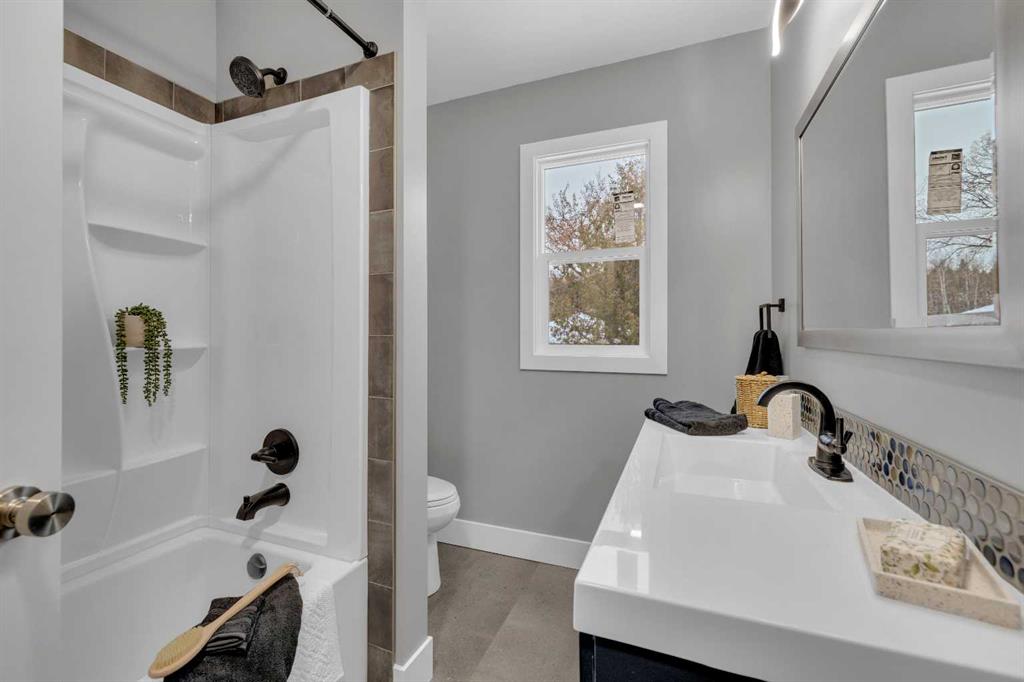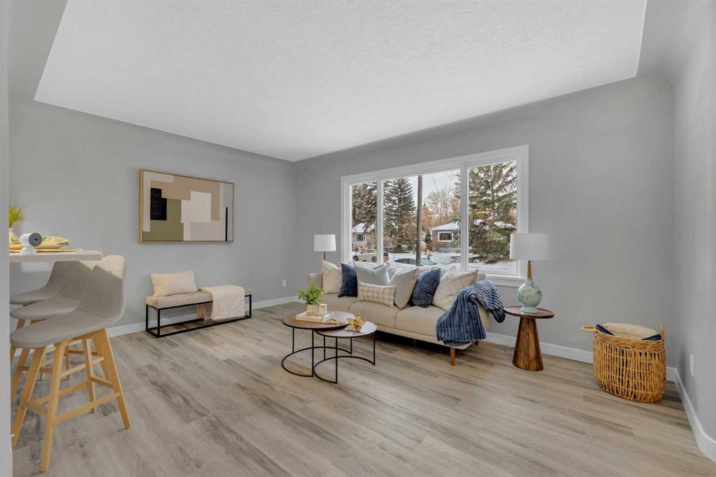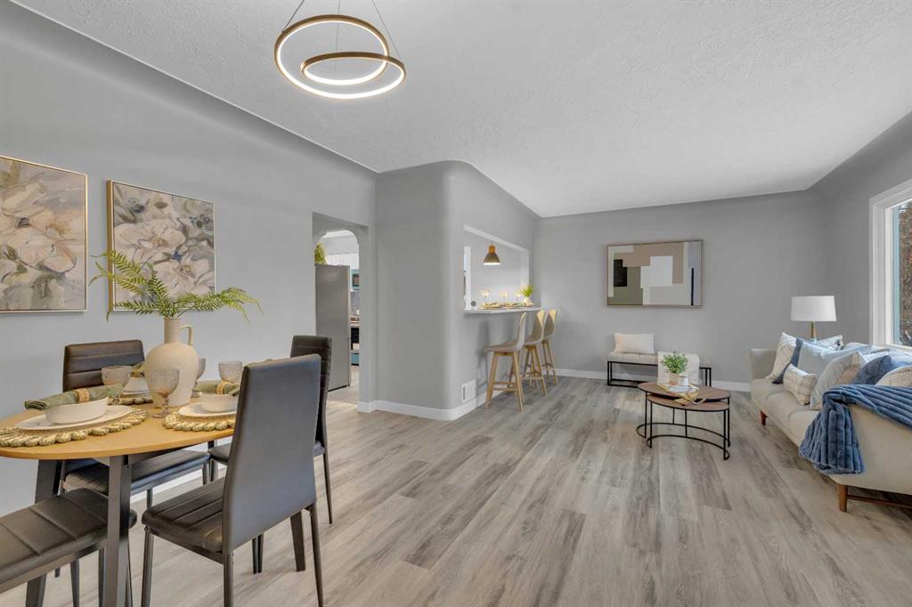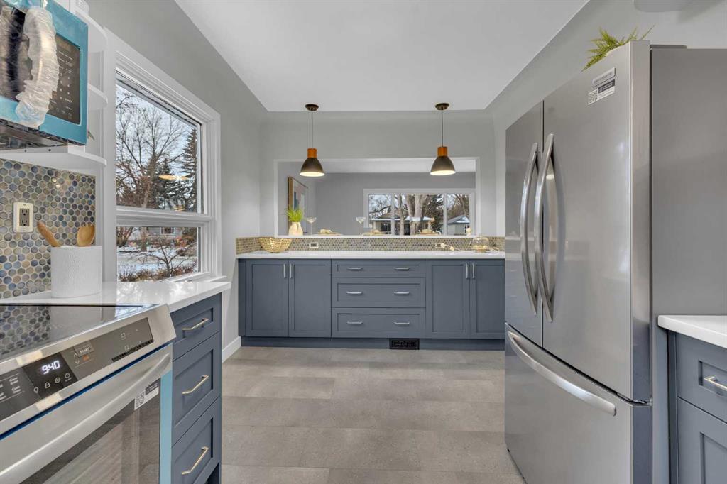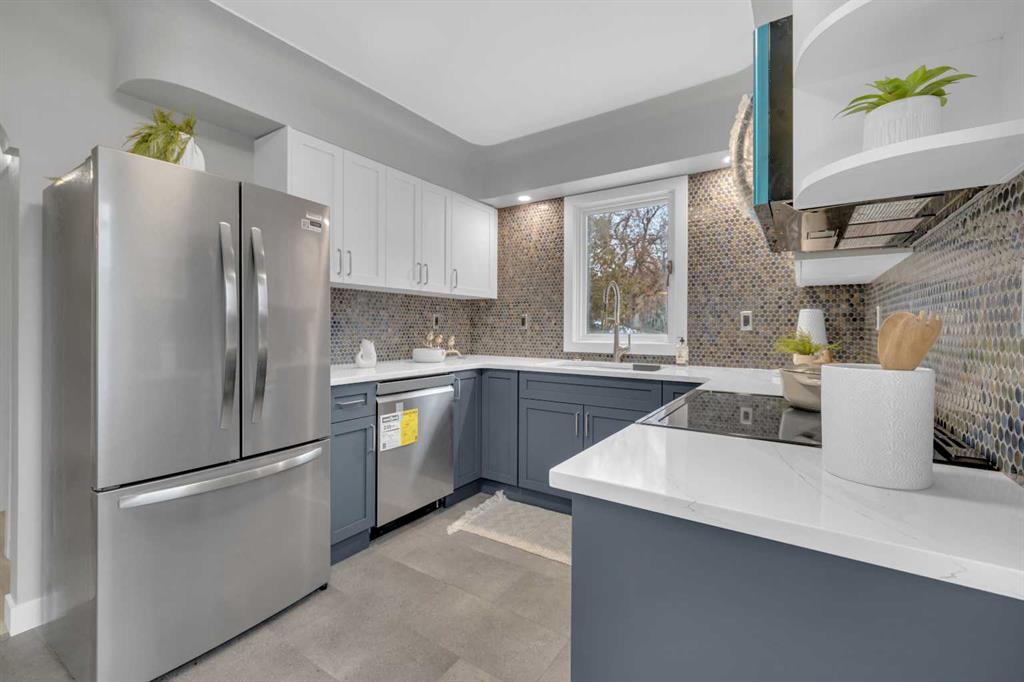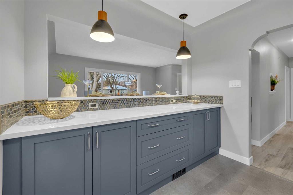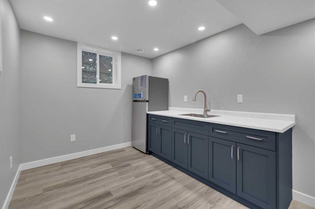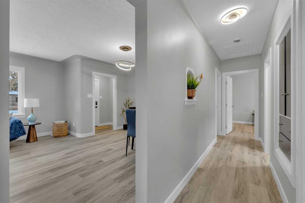 Beautifully updated from top to bottom, this reimagined Woodlea bungalow blends modern style with timeless charm in one of Red Deer’s most sought-after neighbourhoods. Located on a quiet, tree-lined street and backing directly onto Woodlea Park, this home offers unbeatable lifestyle, privacy, and green space access. The main floor features new vinyl plank flooring and a brand-new kitchen with quartz countertops, sleek cabinetry, upgraded lighting, and brand new appliances. The kitchen has been opened into the living space and features a large quartz eating bar while maintaining the 1950s curved corners and ceilings; maintaining its charm and heritage. Large windows fill the space with natural light, complementing two spacious bedrooms and a fully updated bathroom. The lower level has been gutted back to studs and renovated with new insulation, drywall, new egress windows, a stylish wet bar with large fridge, generous family room with 1500 watt electric fireplace with LIFX app controlled colorful lighting, custom mantle/fireplace wall. The basement includes an optional office/bedroom, full bathroom, and massive floored laundry/utility space that is clean and ready for you. This basement space has been redesigned with entertaining in mind. Comfortable, bright, and functional—this level nearly doubles your living space. Major systems have been completely modernized, including a full electrical rewire & panel (2025) and newer hot water tank for long-term peace of mind. Roof was done in 2013.