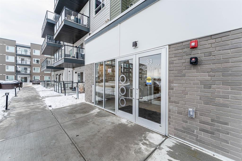 Welcome to this beautifully appointed 2-bedroom, 2-bathroom condo, perfectly located in the vibrant community of Carrington. Designed with a blend of modern style and everyday practicality, this bright, spacious home is ideal for first-time buyers, downsizers, or investors. Step into an open-concept floor plan highlighted by 9-foot ceilings and luxury vinyl plank flooring that flows throughout. Large windows fill the space with natural light, creating a warm and inviting atmosphere perfect for relaxing or hosting friends. The contemporary kitchen stands out with its full-height cabinetry, sleek quartz countertops, stainless steel appliances, and a large island with seating—ideal for casual dining or entertaining. The unit also includes titled underground parking for added convenience. The living area flows effortlessly onto a private balcony, offering a quiet space for your morning coffee or evening downtime. A thoughtful split-bedroom layout provides exceptional privacy—great for roommates, guests, or a dedicated home office. Both bedrooms are generously sized, with the primary suite featuring a walk-through closet and a modern ensuite. A second full bathroom and an oversized laundry/storage room add even more comfort and functionality. Located just steps from beautiful parks, walking paths, and Carrington’s growing mix of shops and amenities, this condo also offers quick access to Stoney Trail and Deerfoot Trail, making travel across Calgary simple and convenient. Stylish, practical, and perfectly situated—this Carrington condo is ready for its next owner. Book your private showing today.