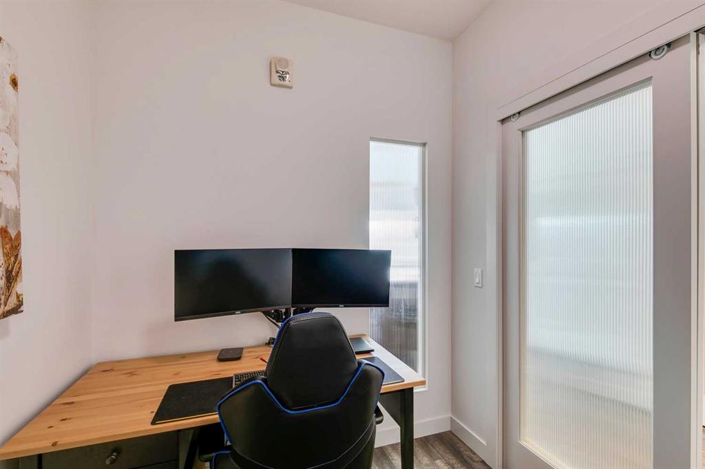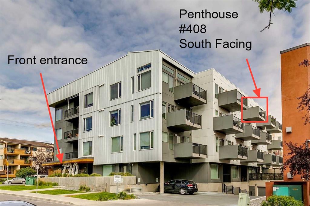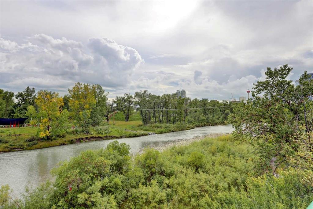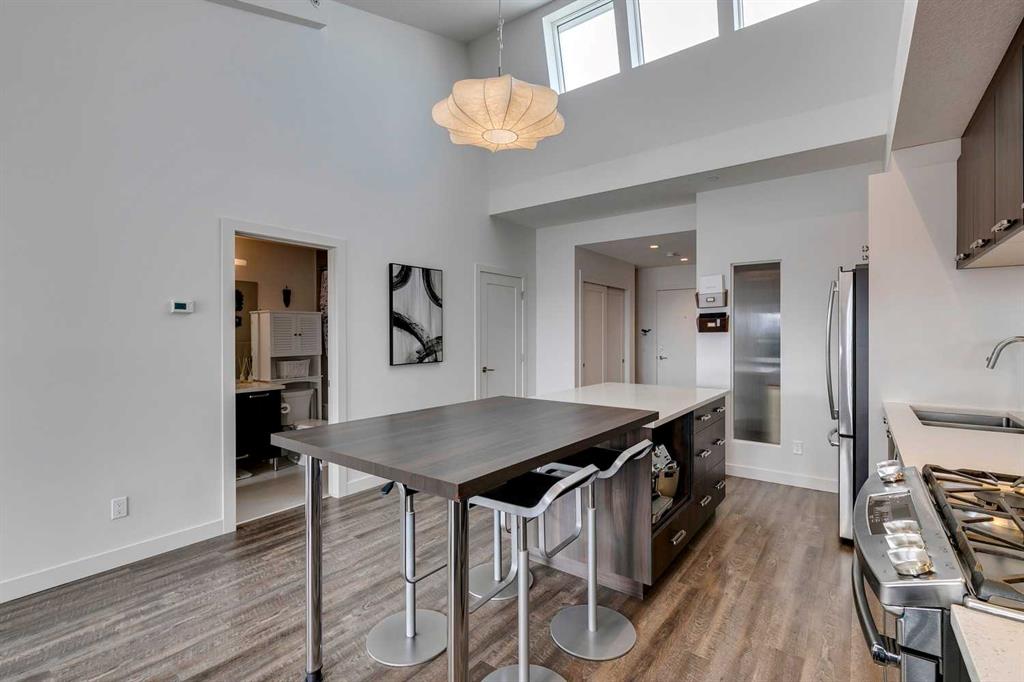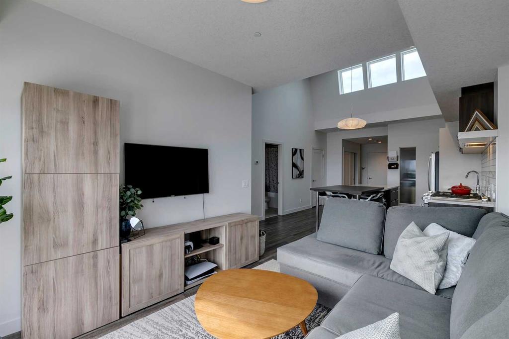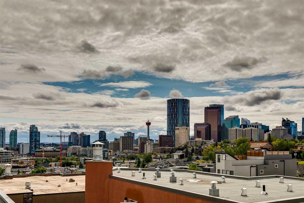 Experience PENTHOUSE living in Renfrew with sweeping, UNOBSTRUCTED VIEWS of downtown, the rolling hills of South Calgary, and even the MOUNTAINS, visible from both your living room and primary bedroom. This top-floor, striking architecture with everyday comfort, featuring 20-ft VAULTED CEILINGS with oversized SKYLIGHTS that pour natural light across the entire home. The kitchen is designed for real living and entertaining, not just looking good. You’ll appreciate the OVERSIZED ISLAND with an integrated eating table, DEEP full-height cabinets, and QUARTZ countertops that offer ample prep space for cooks and hosts alike. The open layout flows effortlessly into the living area and out to your private BALCONY, complete with a GAS line ready for your BBQ. Retreat to a spacious bedroom where morning views greet you daily. A WALKTHROUGH CLOSET leads directly into a well-appointed 4-piece bathroom with a SOAKER tub, creating a spa-like transition from day to night. A separate den/office provides the flexibility to work from home or create a dedicated hobby space. Comfort is top of mind with IN-FLOOR HEATING, AC, and custom WOOD-PLANK WINDOW COVERINGS and BLACKOUT curtains in the bedroom that add warmth and style. STORAGE is never a concern thanks to thoughtful cabinetry throughout. This home includes TITLED underground parking, a HEATED DRIVEWAY into the parkade, designated visitor stalls, plus ample FREE street parking for your guests. Located in one of Calgary’s best inner-city communities, you'll enjoy quick access to downtown, local cafés, parks, and transit. A rare penthouse offering that blends luxury, functionality, and breathtaking views—welcome home to elevated urban living in Renfrew.