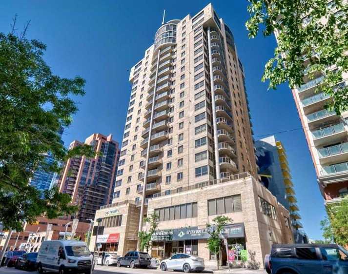 Unparalleled, Spectacular PANORAMIC VIEWS of the mountains, Bow River, and sparkling city lights! This nearly 1,600 sq. ft. luxury condo offers 2 bedrooms plus a den, 2 full baths, and 2 secure titled, underground parking stalls. Beautifully updated with hardwood floors, new carpet, fresh paint, and custom window coverings. Expansive windows fill the open living space with natural light, highlighting the raised panel cabinetry, granite countertops, pot lighting, and quality finishes throughout. Enjoy year-round comfort with full air conditioning and the sought-after south and west exposure. Ideally located in West Downtown with the Kerby LRT station right at your doorstep, and just steps to Shaw Millennium Park, river pathways, and all the conveniences of the city. Easy in-and-out access to downtown makes this the perfect urban retreat. This is the place to "right-size"!
