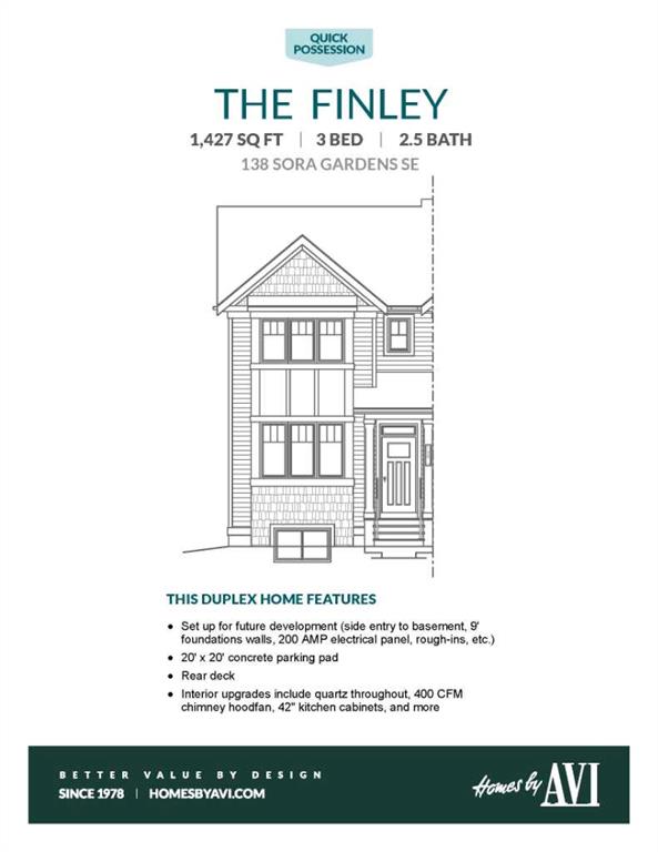THERE’S A SPECIFIC KIND OF BUYER WHO THRIVES IN A BRAND-NEW COMMUNITY: the one who sees fresh pathways, brand-new parks, and a neighbourhood just beginning to take shape — and thinks, “Perfect. I get to grow with this place.” If that’s you, WELCOME TO SORA! The ponds are in, the green spaces are mapped, the playgrounds are ready for their first round of neighbourhood kids, and the long-term plan is already well underway. And the home itself? It’s refreshingly practical. The Finley skips the gimmicks and focuses on function: a main floor with real circulation (no odd dead corners), a living room that fits an actual sofa, a kitchen with taller 42" cabinets, QUARTZ COUNTERTOPS, a 400 CFM CHIMNEY HOODFAN, and storage solutions that feel designed by someone who has actually unloaded groceries before. The colours stay calm — neutral wood-look LVP with subtle undertones, rich dark cabinetry, and matte black accents — so your furniture doesn’t have to fight for attention. Upstairs, the primary bedroom gets a surprisingly cheerful perk: a WALK-IN CLOSET WITH A WINDOW, making it feel more like a tiny dressing room than a storage space. QUARTZ IN BOTH FULL BATHS keeps the finishes consistent, and the laundry is conveniently located on the upper floor, saving you from the dreaded “two-flights-of-stairs-with-a-basket” routine. The basement, though, is the real long-term win: SEPARATE SIDE ENTRY, 9' FOUNDATION WALLS, 200-AMP PANEL, with BATHROOM, LAUNDRY AND BAR SINK ROUGH-INS ready to go when you are. Future-you is going to be very smug about that. Out back, you’ve already got the 20'×20' parking pad and a rear deck for your first Sora summer. Here’s the thing about buying early in a new community: the perks accumulate quietly. You learn the WALKING PATHS before they hit the brochures, you MEET NEIGHBOURS before everyone retreats behind mature trees, and you get to watch EVERYDAY CONVENIENCES appear one by one — PARKS, SCHOOLS, SHOPS — until suddenly you’re the “original owner” people ask for advice. If a MOVE-IN READY HOME WITH LONG-TERM POTENTIAL is what you’ve been waiting for, go ahead and book a showing — this one deserves a walk-through. • PLEASE NOTE: Photos are of a finished SHOWHOME of the same model – fit and finish may differ on finished spec home. Interior selections and floorplans shown in photos.
