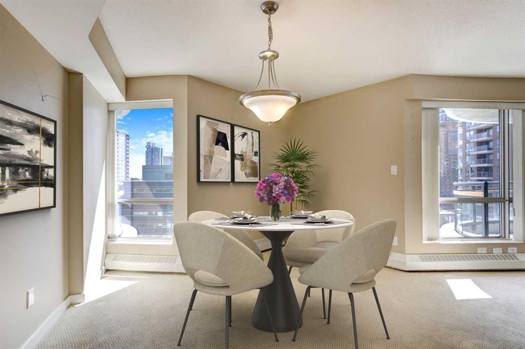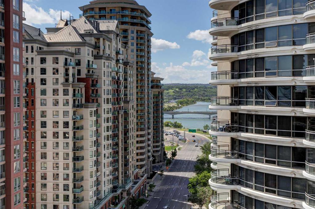Welcome to Riverwest! This unit has been freshly painted from top to bottom and features brand new carpet. This is one of the building’s bigger one-bedroom plus den layouts, giving you a bright, open space that feels comfortable and inviting from the moment you walk in. Perched on the 15th floor of an immaculately maintained complex, it showcases stunning downtown views through its south-facing, floor-to-ceiling windows. Inside, the open-concept kitchen is designed for both style and functionality, featuring granite countertops, ample cabinetry, and an eat-up breakfast bar—perfect for casual meals or morning coffee. The spacious living room flows seamlessly into the formal dining area, creating a warm and inviting space for entertaining. The bright bedroom also showcases impressive city views and connects conveniently to a cheater 4-piece bath complete with a jetted tub, heated tile floors, and a granite-topped vanity. Residents can enjoy premium amenities including an indoor swimming pool and spa, a fully equipped fitness and recreation center, guest parking, and professional concierge service offering parcel delivery and dry-cleaning. The unit comes with one dedicated parking stall in the heated, secure underground parkade, along with a separate storage locker for added convenience. All of this is just steps from the Elbow River pathways, Prince’s Island Park, Kensington, downtown shopping and dining, and convenient transit options. This is urban living at its finest—come experience everything Riverwest has to offer! Please check out the VIRTUAL TOUR LINK for hi-tech interactive floor plans/hi-def photos/virtual tours where you can take a "walk" throughout all rooms of the property.