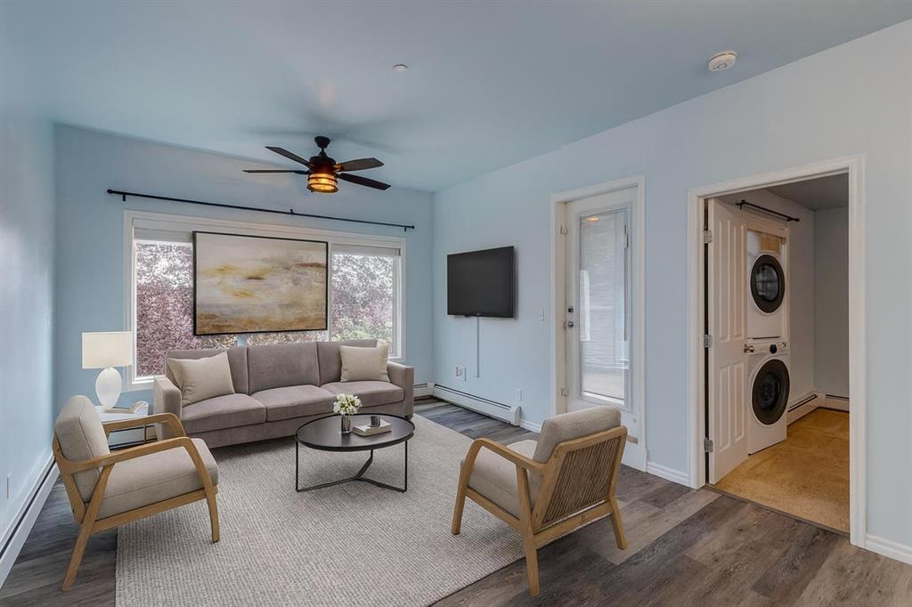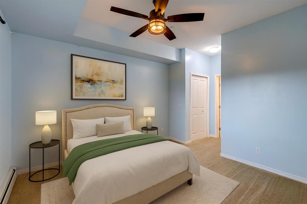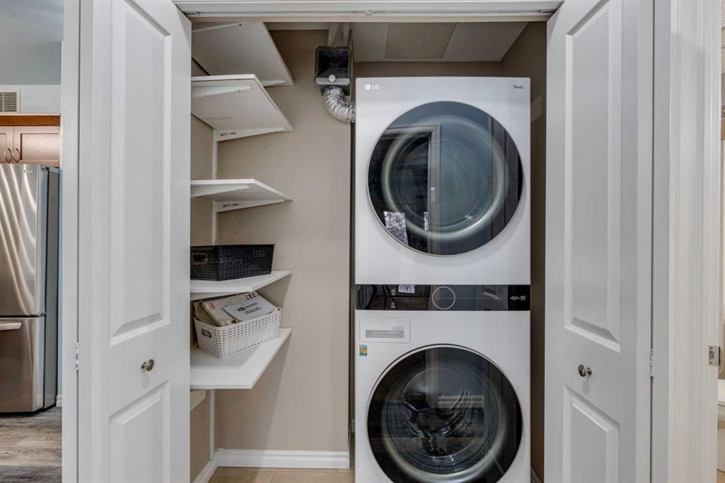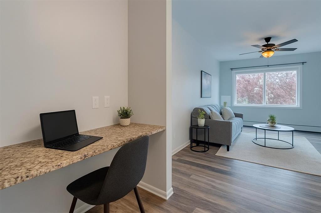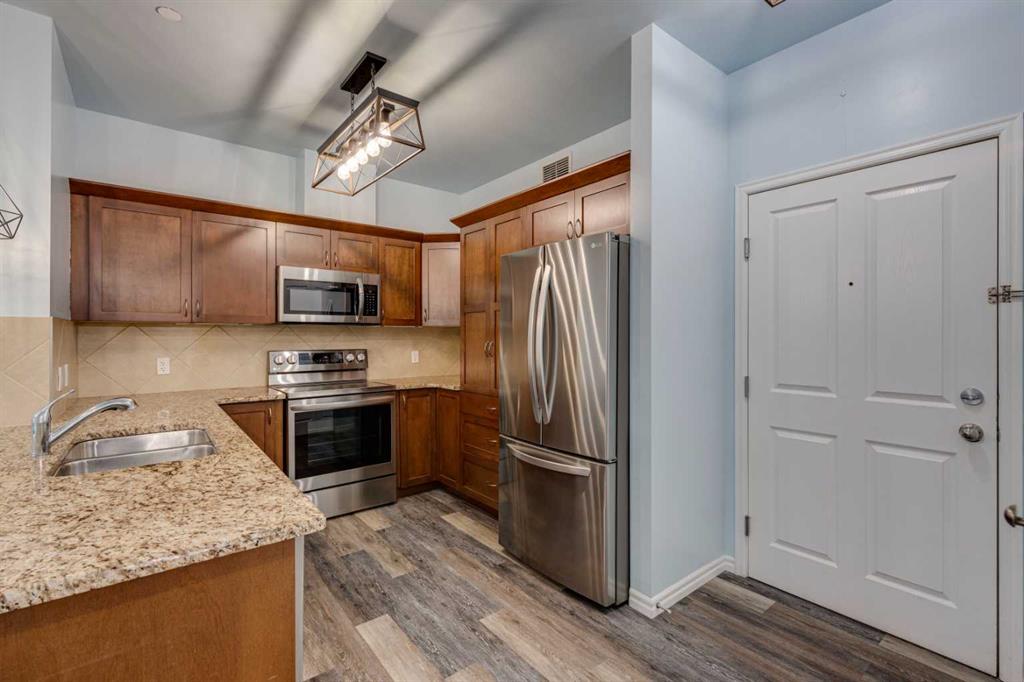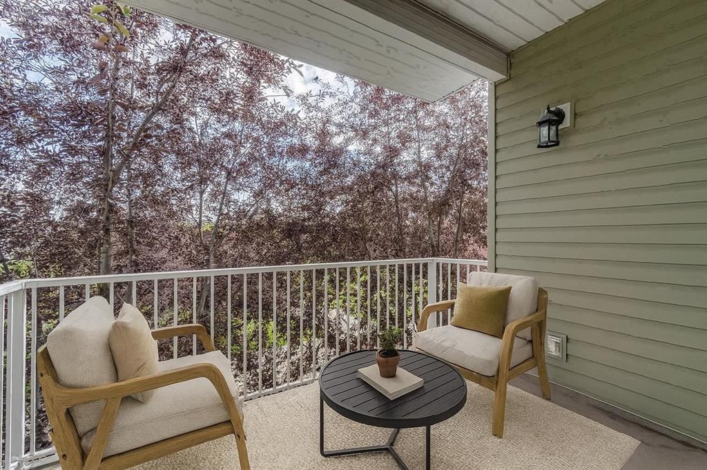 Incredible value in this beautifully updated 2-bedroom suite overlooking a serene, tree-covered courtyard. This sought-after floorplan features numerous upgrades, including modern ceiling fans and light fixtures, custom closets in the primary bedroom, freshly painted ceilings in the main living area, luxury vinyl plank flooring, and custom window blinds throughout. The stylish kitchen showcases granite countertops, a raised breakfast bar, and newer stainless steel appliances, all flowing seamlessly into the dining area, living room, and a convenient office nook. The bright and inviting living room offers access to the first of two spacious balconies—perfect for relaxing or entertaining. Ideal for families, roommates, or anyone seeking privacy, the two bedrooms are thoughtfully separated. The generous primary suite includes its own ensuite, while the second bedroom enjoys access to the second large, private balcony and is just steps away from the full main bathroom. This home includes two parking stalls (one titled and one assigned) plus an assigned storage locker. Walking distance to shops, restaurants, and everyday conveniences. A fantastic opportunity—shows beautifully!